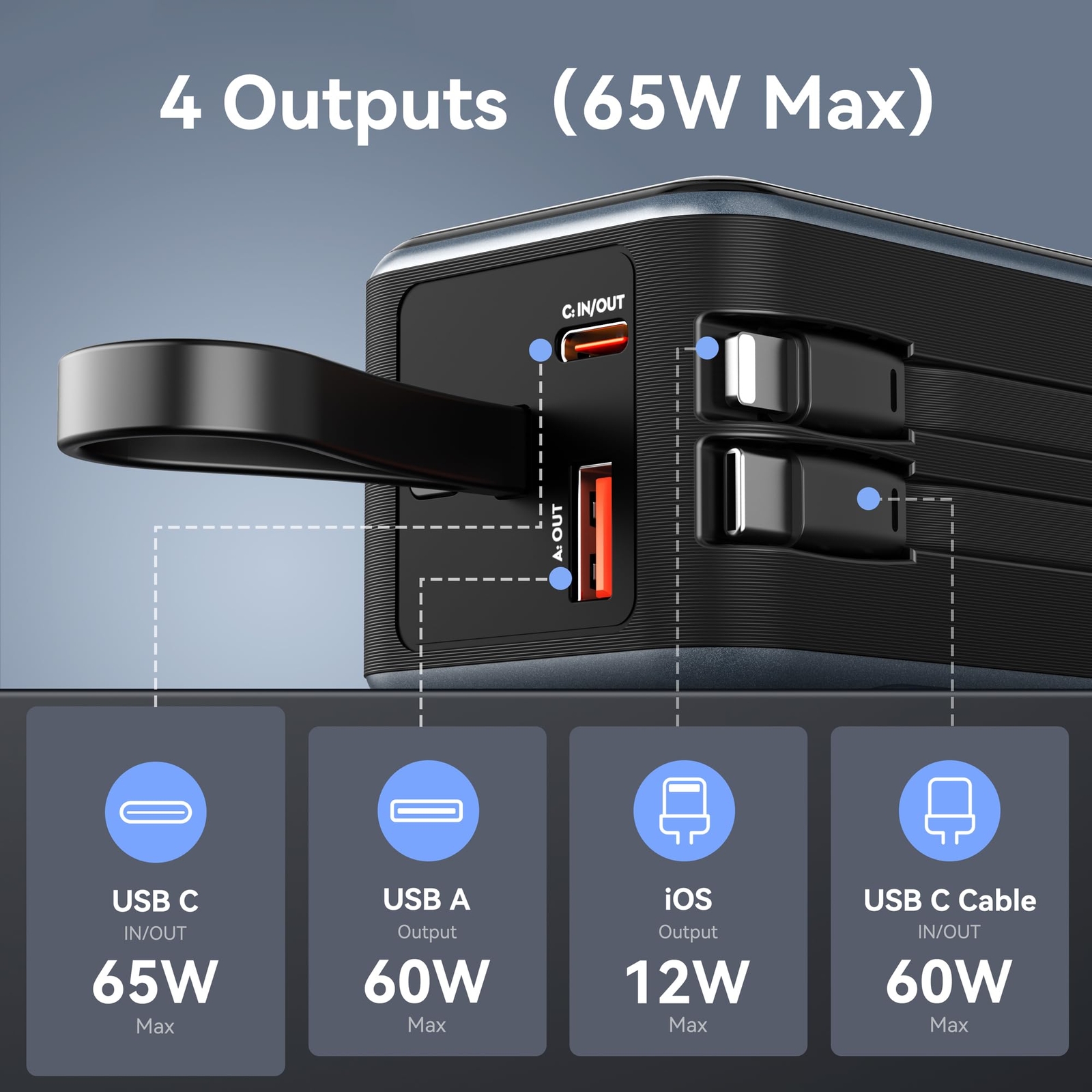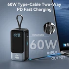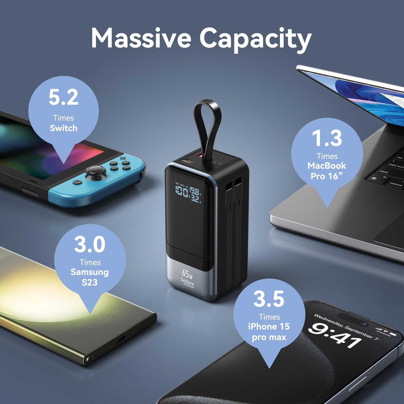 【Portable charger with built in cables】Portable charger built-in 2 cables included USB C output cables and iOS output cable. Power bank usb c 65w outputs can charge almost for all types port electronics devices. Such as for other USB C port laptop, phones, tablets, for iPhone, MacBook, Dell XPS, iPad, for Samsung, and more devices. All in one portable charger, this is airplane travel essentials, you would not need to carry various cables any more 【4 Outputs and 2 Inputs】Portable charger has 4 outputs and 2 inputs, you may charge 4 devices max at the same time, recharge battery pack with 65w options easily. Power bank fast charging, PD 65W charge a MacBook pro from 0% to 50% only 45 minutes. Portable charger builts in 4 output, great for multi electronics users who has iPhone, android or laptop devices 【Intelligent LED Display】Power bank with Intelligent LED display, accurate percentage of remaining battery and fast charging status. Portable charger with 18400 mAh massive capacity can charge MacBook Pro 1.3 times, iPhone 16 / 15, 3.5 times, Switch 5.2 times, and you can recharge battery pack in time conveniently. Keep phones fully powered on any critical moment, a best portable charger for all people 【Universal compatible with popular devices】As portable charger builts in all ports, multi cables, it is widely compatible with all popular cellphones, tablets, laptops. It can be laptop power bank or portable laptop charger. Widely compatible with Asus, Lenovo, HP, Acer, MacBook, MacBook Pro, MacBook Air, iPad, iPhone 15 14 13 12 11 8 7 Series, Samsung Galaxy and other android phones, tablets, etc 【What will you get】1 x power bank 18400 mAh, 1 x use manual, Selore 24-month lifetime technical support, and friendly customer service. Size only 5.2 x 2.2 x 2.1in,and weight only 14.53 Oz, You can easy put it in your pocket, equipped with a portable lanyard, can hanging on travel bag, which is convenient to carry and use