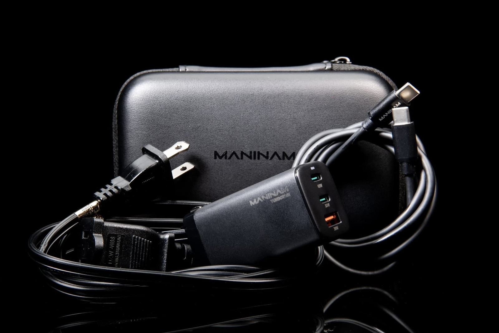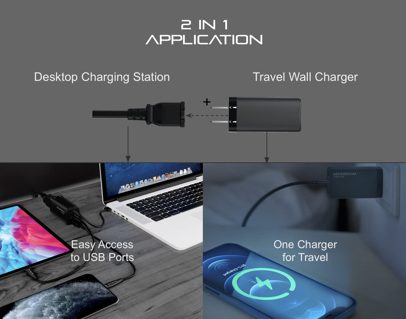 Hybrid Compact Desktop & Wall Charger - 65W GaN Fast Charger Adapter with USB C, USB A Ports - Portable Charging Station for Home & Office - [with Spaceous Organizer Leather Case and C Cable] Product Details Brand: MANINAM Connectivity Technology: USB Connector Type: USB Type C Compatible Devices: Smartphones, Tablets, Game Consoles, Laptops, Cameras Included Components: 4 FT Extension Cable, USB C to C Cable, Large EVA Storage Case Special Feature: Super Fast Charging, Adaptive, Automatic Color: Matt Black Input Voltage: 110 Volts Mounting Type: Foldable Prong, Extension Power Cord Product Dimensions: 2.44 x 1.22 x 1.38 inches Item Weight: 11.7 ounces Item model number: M133 Date First Available: August 23, 2021 Manufacturer: MANINAM LLC The Only Charger Youll Need - A product of MANINAM, a US bootstrap company focused on charging technology and electrified transportation, this hybrid power adapter is convertible as a wall charger or as a desktop charging station. Charge 3 Devices Simultaneously - With 2 USB-C and 1 USB-A ports, your wall or desktop GaN charger powers multiple devices at a time. It can output up to 65W, compatible with the iPhone 12 and fast-charging devices. High-Speed Adaptive Charging - All MANINAM phone chargers utilize our trademark TURBOTIVE Technology, providing super-fast and adaptive charging at a level thats safe for your batterys lifespan. Ready For The Future - Your travel charger features expert workmanship and universal compatibility, reprogramming charging output based on OEM specs. It is futureproof and will last you years of use. Satisfaction Assured - Get your hybrid wall and desktop power charger without risk! This fast charging station comes with a lifetime warranty backed by customer support from our friendly US-based team.