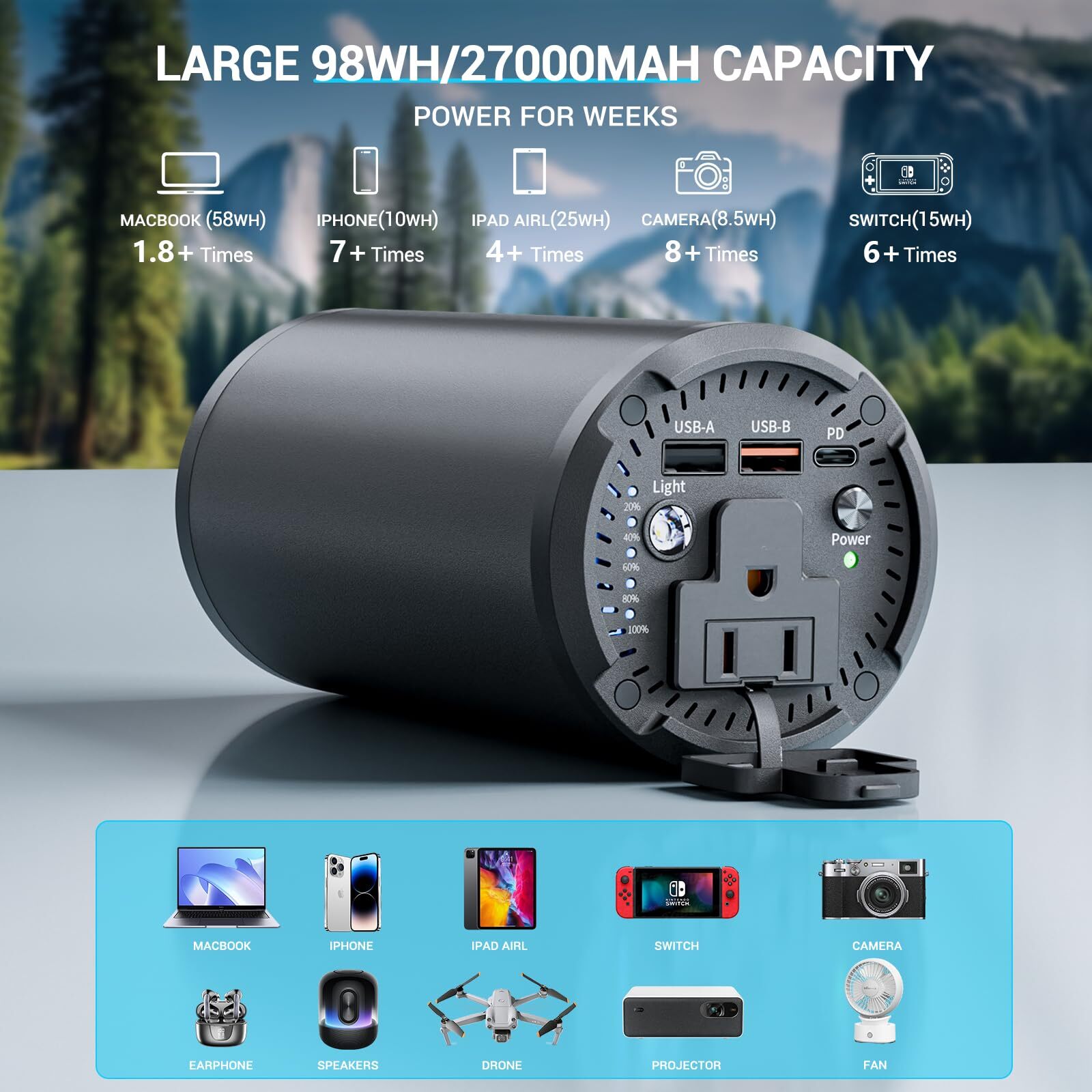 This portable power bank is a game-changer for travel and work! The 100W AC outlet easily powers my laptop, phone, and even small appliances, while the multiple ports let me charge everything at once. The 27,000mAh capacity lasts all day, and the compact size makes it perfect for my bag. No more hunting for outlets—this keeps all my devices running smoothly on the go. Highly recommend for anyone who needs reliable power anywhere!