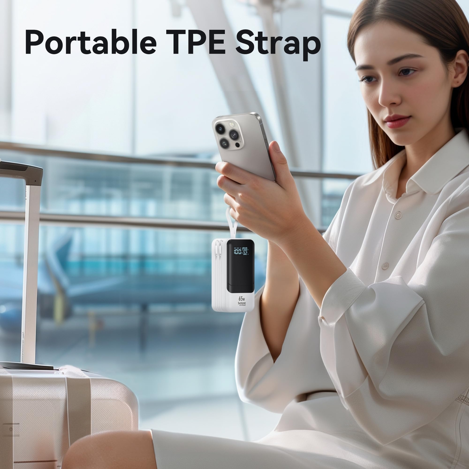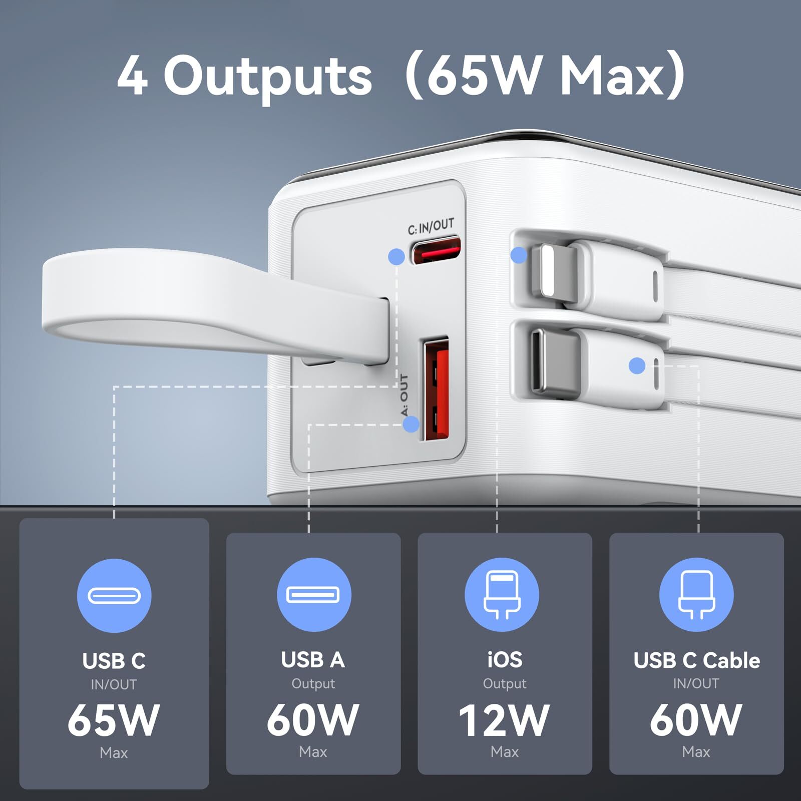 【 Portable charger with built in cable 】Power bank with 2 cables included USB C output cable and iOS output cable. Portable charger usb c 65w outputs can charge almost for all types port electronics devices. Such as for other USB C port laptop, phones, tablets, for iPhone, MacBook, Dell XPS, iPad, for Samsung, and more devices. All in one power bank, this is airplane travel chargers, you would not need to carry various cables any more! 【4 Outputs and 2 Inputs】Power bank has 4 outputs and 2 inputs, you may charge 4 devices max at the same time, recharge battery pack with 65w options easily. Power bank fast charging, PD 65W charge a MacBook pro from 0% to 50% only 45 minutes. Portable charger builts in 4 output, great for multi electronics users who has iPhone, android or laptop devices. 【Intelligent LED Display】Power bank with Intelligent LED display, accurate percentage of remaining battery and fast charging status. Portable charger with 18400mAh massive capacity can charge MacBook Pro 1.3 times, iPhone 16 / 15, 3.5 times, Switch 5.2 times, and you can recharge battery pack in time conveniently. Keep phones fully powered on any critical moment, a best portable charger for all people. 【Universal compatible with popular devices】As power bank builts in all ports, multi cables, it is widely compatible with all popular cellphones, tablets, laptops. It can be laptop power bank or portable laptop charger. Widely compatible with Asus, Lenovo, HP, Acer, MacBook, MacBook Pro, MacBook Air, iPad, iPhone 15 14 13 12 11 8 7 Series, Samsung Galaxy and other android phones, tablets, etc.. 【What will you get】1 x power bank 18400 mAh, 1 x use manual, Selore 24-month lifetime technical support, and friendly customer service. Size only 5.2 x 2.2 x 2.1in,and weight only 14.53 Oz, You can easy put it in your pocket, equipped with a portable lanyard, can hanging on travel bag, which is convenient to carry and use.