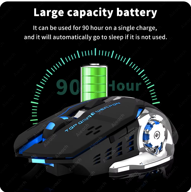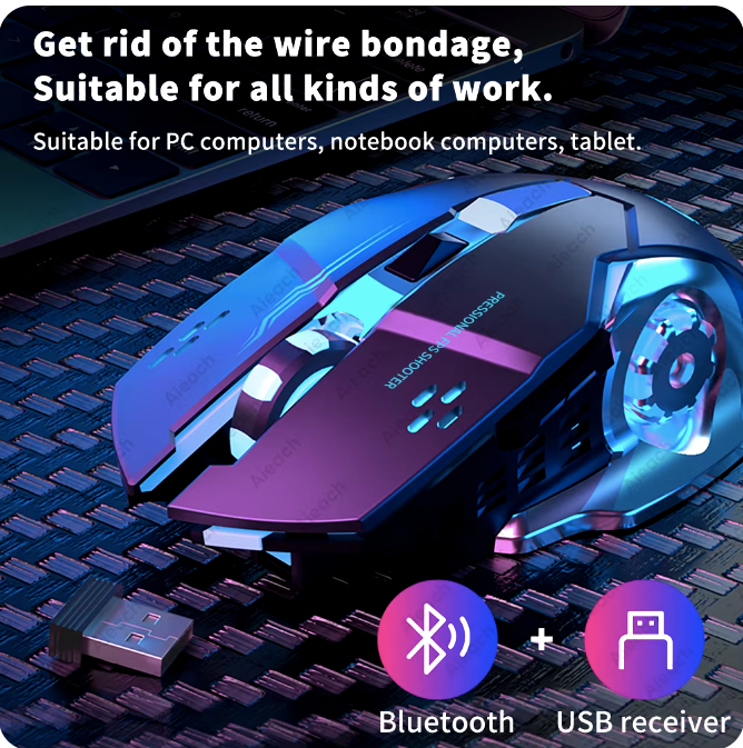 Name: Mechanical gaming mouse Working hours: ≈90 hours Compatible Devices: Smartphones, Tablets, Laptop with Bluetooth functionality Product Weight:≈93g Product function: Make device work more easy Function 1: Bluetooth connection/2.4G mode Function 2: 6-key layout Function 3: Backlight function Function 4: Rechargeable Function 5: 3 Level DPI adjustable Function 6: Suitable for various devices The above data are measured by the AIEACH laboratory, the actual use will be slightly different depending on the specific circumstances. We support wholesale and drop shipping, contact us for preferential prices. Mechanical gaming mouse Wireless connection, get rid of the shackles of wired, colorful backlight, comfortable to hold. Get rid of the wire bondage,Suitable for all kinds of work. Bluetooth + USB receiver dual-mode connection, suitable for PC computers, notebook computers, tablet. Three-level DPI is adjustable. One key to adjust the mouse sliding speed, adapt to different devices. Colorful backlit breathing light The ever-changing backlight comes out of the mouse, which is very cool. Note: The light is a constantly changing breathing light, and the picture is only a snapshot of instantaneous changes. 6-key layout The mouse is equipped with side double buttons to satisfy the game settings. Large capacity battery It can be used for 90 hours on a single charge. The above data are measured by the AIEACH laboratory, the actual use will be slightly different depending on the specific circumstances. Ergonomics, comfortable to hold. The ergonomics curve fits the palm better and is suitable for different grip postures. Mouse Connection Steps Take out the receiver at the bottom of the mouse, plug it into the USB port of the computer, and wait for about 15 seconds. Turn on the switch at the bottom of the mouse (move it to the ON position), the mouse lights up for a few seconds means: the mouse is turned on. Push the switch to ☼ , the mouse will turn on the seven-color breathing light mode. Bluetooth connection: Push the switch to ON and the red light flashes, then you could connect to the mouse Bluetooth. class="extend--iframe--to7hHIV" data-spm-anchor-id="a2g0o.detail.0.i4.1fcb7ZZZ7ZZZcH" data-spm-act-id="a2g0o.detail.0.i4.1fcb7ZZZ7ZZZcH" style="box-sizing: border-box; -webkit-tap-highlight-color: transparent; outline: 0px; margin: 0px; padding: 0px; height: 16210.8px; position: absolute; top: 0px; visibility: hidden; width: 1008px; z-index: -1;">