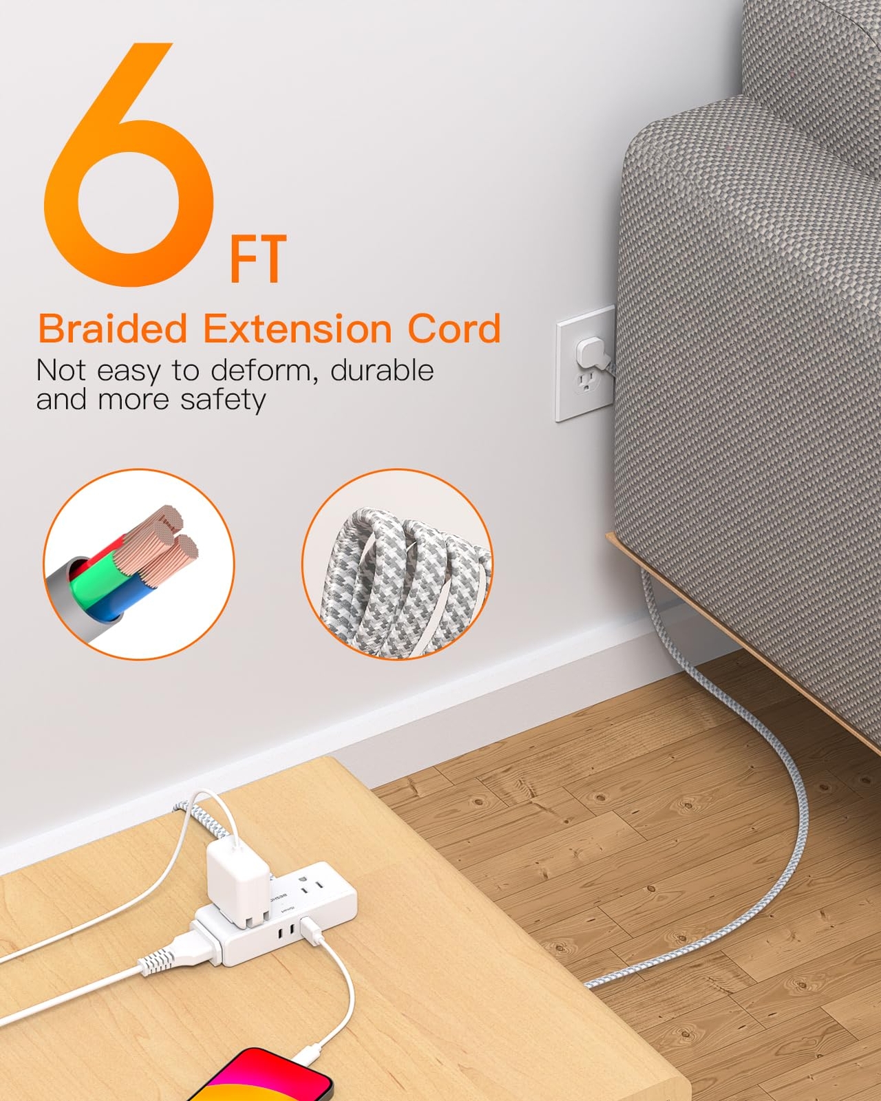 Flat Extension Cord 6 feet, Flat Plug Power Strip, 4 Widely Outlets with 3 USB Ports (2 USB C), 3 Side Outlet Extender with Extension Cord with Multiple Outlets for Home, Office, Dorm Room Essentials MORE BENEFITS 【Extension Cord 6 Feet & Ultra Thin Flat Plug】With only 0.35 inch ultra thin plug and 45°right angle design, the flat plug power strip is much thinner than traditional plugs, which can close to the wall easily, and hide in the back of furniture, bed or refrigerator. The 6ft extension cord is made of pure copper, with better current carrying capacity (15A). The braided power cord is not easy to deform, is durable, and more safer. 【7-in-1 Power Strip with USB Ports】Flat power strip could turn 1 socket into 4 AC outlets, 2 USB-C, and 1 USB-A, which could charge up to 7 devices at the same time. The USB C port can charge up to 5V/3A. USB-A ports can charge up to 5V/2.4A Max, all USB Ports Output is 5V/3.1A, compatible with your cellphone, laptop, tablet, earphone, or camera. 【 2.3 in Wide Spaced & Space-Saving】The extension cord with 2.3 inches widely spaced between outlets, larger than the standard socket, fits big adapters without blocking each other. The compact power strip saves more space, makes the table look neat, and is suitable for the home, office, and college dorm room. 【Cruise Accessories Must Haves 】The small cruise power strip with NO surge protection. The compact size (4.5*1.1*1.8 IN) takes up less space on your desk or luggage, a must have accessory for travel, dorm room, home, office, bedroom, kitchen, etc. 【Multi Safety Protection】RoHS, FCC, and ETL Certificates. This extension cord with multiple outlets has overload protection, short-circuit protection, over-current protection, over-voltage protection, and overheating protection.