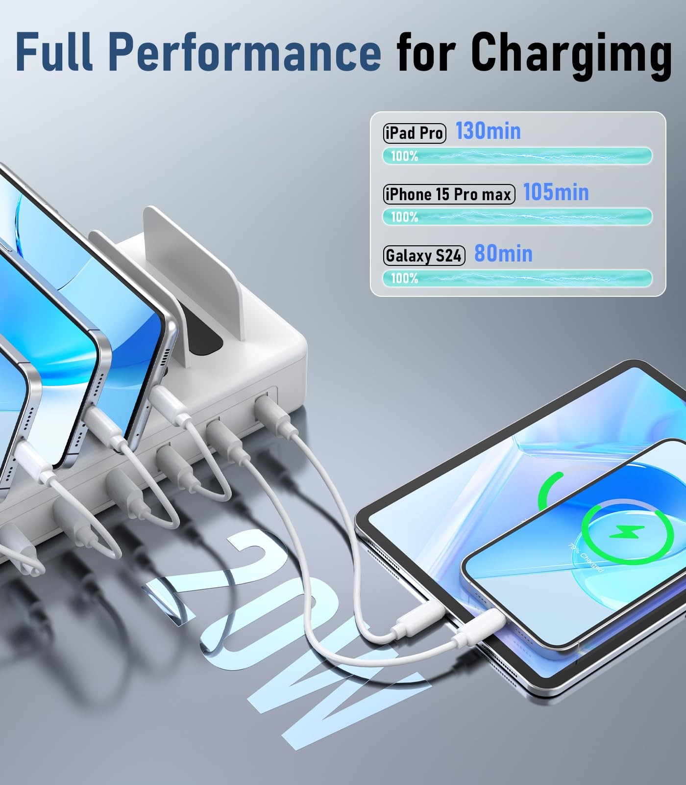 All-In-One Charging Station 【New Upgraded USB-C Charging Ports】This new upgraded multiple charging station features 3 PD 20W USB-C ports.Compare with the traditional A port, you can charge your phone to 60% in just 30 minutes.Use the usb charging station with our type c cable to experience lightning-fast charging speed 【Maximize Your Charging】This phone charging station equipped with 3 USB-C and 3 USB-A ports, offering a total output of 96W. The multi charging station can meet all kinds of charging needs, providing fast and efficient charging for all your devices and saving a lot of time 【Organized Charging Setup】The charger station is designed with 6 sturdy dividers and apple watch stand to minimizes cable clutter and keeps your workspace tidy. The larger dividers prevent devices from slipping, effectively organizing your desk for a neat and orderly look 【Intelligent Device Protection】Our charging station for multiple devices apple has real-time temperature monitoring technology. It automatically cuts off the power supply when the temperature is too high to prevent short circuit.This apple charging station also has overheating and overcharging protection to maximize protection 【Wide compatibility】The charging station for apple devices is compatible with 1000+ usb devices.Whether you are in school, office, bedroom, desk or bedside table, it can easily charge all your electronic devices at the same time. It is also a perfect gift for family and friends 【WHAT YOU GET】The package includes 1 cell phone charging stations, 6 mixed cables, 1 power adapter, 1 user manual,18-month warranty and friendly customer service. Note: For a better experience, we recommend using the charging cables that come with our desk charging station