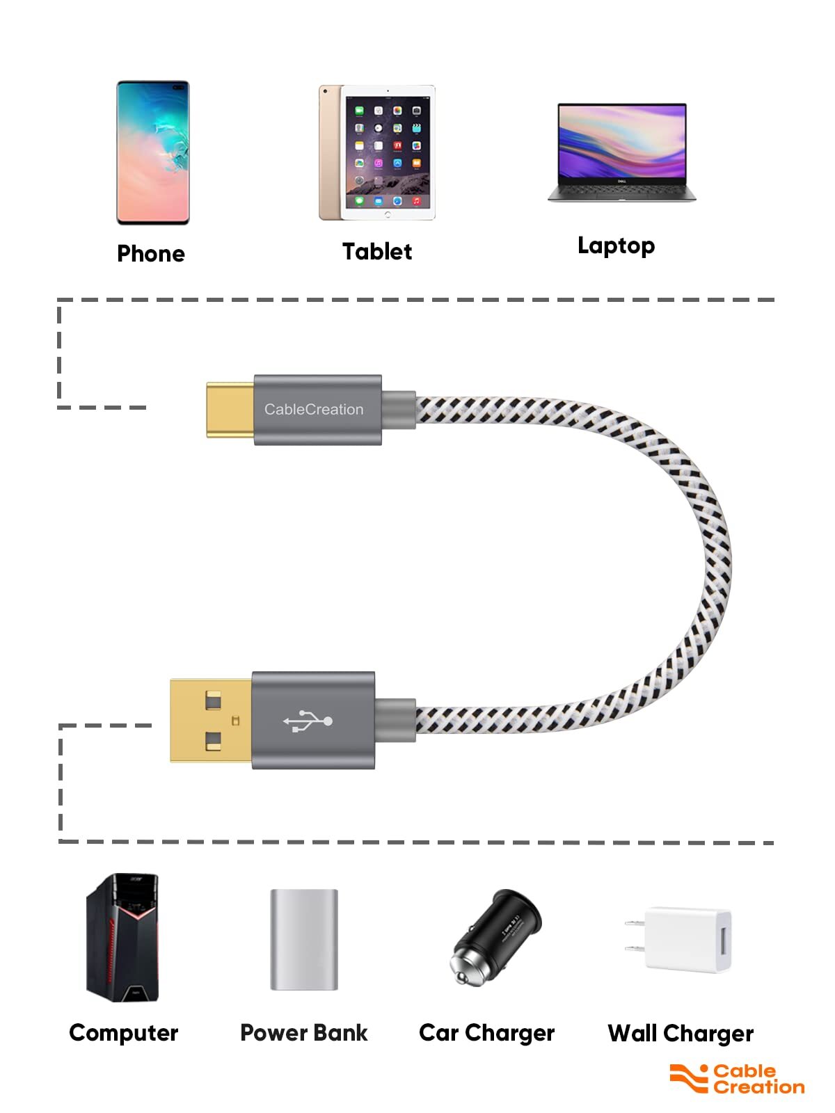 Short 6 inch USB C Cable Fast Charging Charger Cord USB A to USBC-C 6in Short and Portable : 0.5ft /15cm/6inch length for charging your phone with a power bank or portable charger; tangle resistant and handy to carry in your bag or pocket. ..NOTE: For Android Auto use, please make sure that 1, your phone has downloaded relative APP. 2, Your car supports Android Auto function. 3A Fast Charging & Data Sync : Output power up to 3 Amp, support quick charge(QC), built in with 56K ohm resistor to protect your devices and charging adapters from damage. The short charging cable supports USB 2.0 data speed up to 480Mbps (=60MBps). !!! Please Note !!! we don't recommend to connect hard drives with this cable, in this case you need a 5G/10G usb-c cable, ASIN: B013G4CHDE/ B072M7GH29/ B08RDF16VV for your reference) Aluminum Alloy Case & Braided Jacket: Tangle-free nylon braided design, premium aluminum alloy shell and gold-plated connector add additional durability and stability to this usb c cable short, which makes it more durable than normal usb c cables. This short usb-c cable can bear 10000+ bending test, a must have for daily use. Universal Compatibility: iPad Pro, iPad mini, Macbook Pro, Chromebook Pixel, Z8, Z Droid/ Z Force, Galaxy S23/S23 Ultra/S22/S22 Ultra/S20/ S20+/ S20 Ultra/ S10/ S10+/ S10e/ S9/ S9+/ S8/ S8+, Pixel 3/ 3XL/ 2/ 2XL/ XL, ZenPad S 8.0, Pavilion X2, P20/ P20 Pro/ P30/ P30 Pro, Mate 20 10 Pro, 8/ 9/ Mix/ Mix 2/ Mix 3 & new devices with USB-C port. What You’ll Get: 1x 0.5ft CableCreation USB to USB C cable, with our 24-month product replacement warranty and lifetime 24/7 friendly technical support. Note: 1. This A to C cable does not fit iPhone, iPhone needs lightning cable and this is a male to male cable. 2. There are different length for different needs, before purchasing, make sure you choose the right length. 3.NOTE: USB 2.0 is host side, normally connect to computer, charger adapter, power bank. USB-C is target side, normally connect to your smartphones or tablets. It's NOT bi-directional, so it will NOT work to connect your external hard drive with USB port to a new USB-C laptop. CableCreation Focus on the Ideal Design of All of Our Quality Cables. CableCreation is not Only a Brand But Also a Creative Team With its Own Factory manufacturing. CableCreation is Confident to Offer All Buyers with Items Lifetime Warranty. CableCreation USB2.0 Type C Male to Standard A Male Cable Side A: Gold Plated USB Type C Male Side B: Gold Plated Standard USB 2.0 A Male Cable Color: Black+White braid Cable Length: 0.5FT Compatibility Devices(Incomplete) MacBook Pro, Air (with USB-C/Thunderbolt 3 port) Galaxy S21/ S20/ S10/ S10Plus/ S10e Galaxy S22/S22 Ultra/S23/S23 Ultra / Note 8 Note 9 Chromebook Pixel 5/ 4/ 3/ 3XL/ 2/ 2XL/ XL P40/ P40 Pro/ P30/ P30 Pro and other new upcoming devices with USB-C port. electronics for school Shipping We offer FREE shipping on all orders! We ship within Three business days of payment, usually sooner. We use a selection of shipping services such as UPS, FedEx, USPS etc. We only ship to the lower 48 states, no APO/FPO addresses or PO Boxes allowed. Local pickups and combined shipping options are not provided at this time. Return You can return a product for up to 30 days from the date you purchased it. Any product you return must be in the same condition you received it and in the original packaging. Please keep the receipt. Payment We accept payment by any of the following methods: PayPal Please pay as soon as possible after winning an auction, as that will allow us to post your item to you sooner! Feedback Customer satisfaction is very important to us. If you have any problem with your order, please contact us and we will do our best to make you satisfied. Contact Us If you have any queries, please contact us via ebay. We usually respond within 24 hours on weekdays. Please visit our eBay store to check out other items for sale! Thank you for shopping at our store.