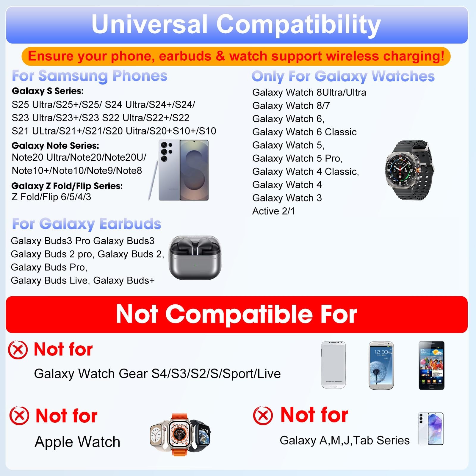all in one charging station for samsung , android wireless charger, android charging station, wireless charger for samsung , android watch charger, samsung watch charger, military time digital alarm clock a clock, adjustable night lights functions, compact and portable, for travel. 【All in One Wireless Charging Station】 The wireless charging station for samsung has wireless charger, 12H digital alarm clock and a clock, three different modes of adjustable night lights functions. You can charge your phone, and Galaxy watch and buds simultaneously. fast wireless watch charger for multiple devices to let your desktop get rid of messy charging cables. 【12H Digital Clock & Alarm Clock & Adjustable Night Light】 The digital 12H format Time display clock of the phone wireless charging station has the alarm function. The light of the night light is equipped with three different colors: warm light, natural light and cold light, you can adjusted by touch control. 【Safe Fast Charging】The android wireless charger adopts intelligent protection technology, which provides temperature control, overvoltage protection, short circuit protection, overcurrent protection to ensure safe and fast charging. 【A versatile gift for any occasion】This fast android wireless watch charger for samsung is perfect for family and friends, charging phones, watches, and headphones. It's also a handy nightlight, clock, and alarm clock. Compact and portable, it's ideal for travel. 【Universal Compatibility】Fast phone charger android compatible for Galaxy S: S25 Ultra, S25+, S25, S24 Ultra,S24+,S24, 23, 23 Ultra, 23+, 22, 22+ ,22 Ultra,21,21+ ,21 Ultra, 20, 20+, 20 Ultra. You can charge your headphone which support wireless charging. ONLY compatible with Galaxy Watch8/8 Ultra/7/Watch6/6 Classic/ 5 Pro/5/Bespoke Edition, Galaxy watch 4/Classic,Galaxy watch 3/LTE , Galaxy Active 2 LTE/2/1 (NOTE: NOT FOR APPLE WATCH, OTHER BRAND WATCH AND GALAXY WATCH "Gear" SERIES). For Galaxy Buds+/Buds Pro/Live, Buds2/2 Pro and other phones and earbuds with wireless charging.