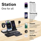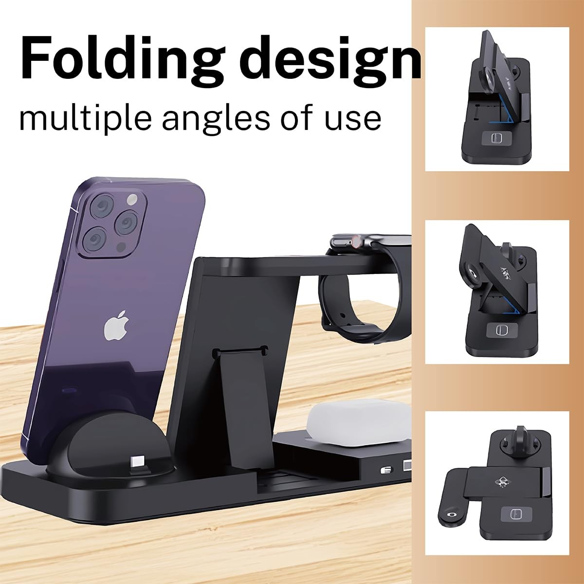 Tired of tangled cables cluttering your desk? The 6 in 1 Wireless Charging Station is designed for Apple enthusiasts who value efficiency and style. Work & Play: Charge your iPhone horizontally for FaceTime calls or vertically for TikTok browsing while your Apple Watch powers up overnight. Travel-Friendly: The anti-slip silicone surface keeps devices secure even on bumpy car rides. Certified Safety: Rigorously tested with over-voltage/short-circuit protection. 【18W Fast Charging & Wide Compatibility】 Charge iPhone 50% in 30 mins with 18W Qi-certified charging, compatible with iPhone 16-12 series, Apple Watch Ultra/SE/9/8/7, AirPods Pro/3/2. 【Safe & Stable】 Built-in temperature control and foreign object detection protects devices from overcharge/overheat. 【Space-Saving Design】 Ultra-slim aluminum stand holds iPhone in portrait/landscape mode for bedtime streaming or desk use. 【Perfect for Travel】 Foldable design (optional) and compact size fits in carry-on bags. 3C/RoHS certified. 【Friendly reminder:】Remove phone case while charging to boost efficiency by 30%; or the phone case thickness must not exceed 5mm. 【What’s Included】 Package: Wireless charging station +18W Power adapter+ USB-C cable | 18-month warranty.
