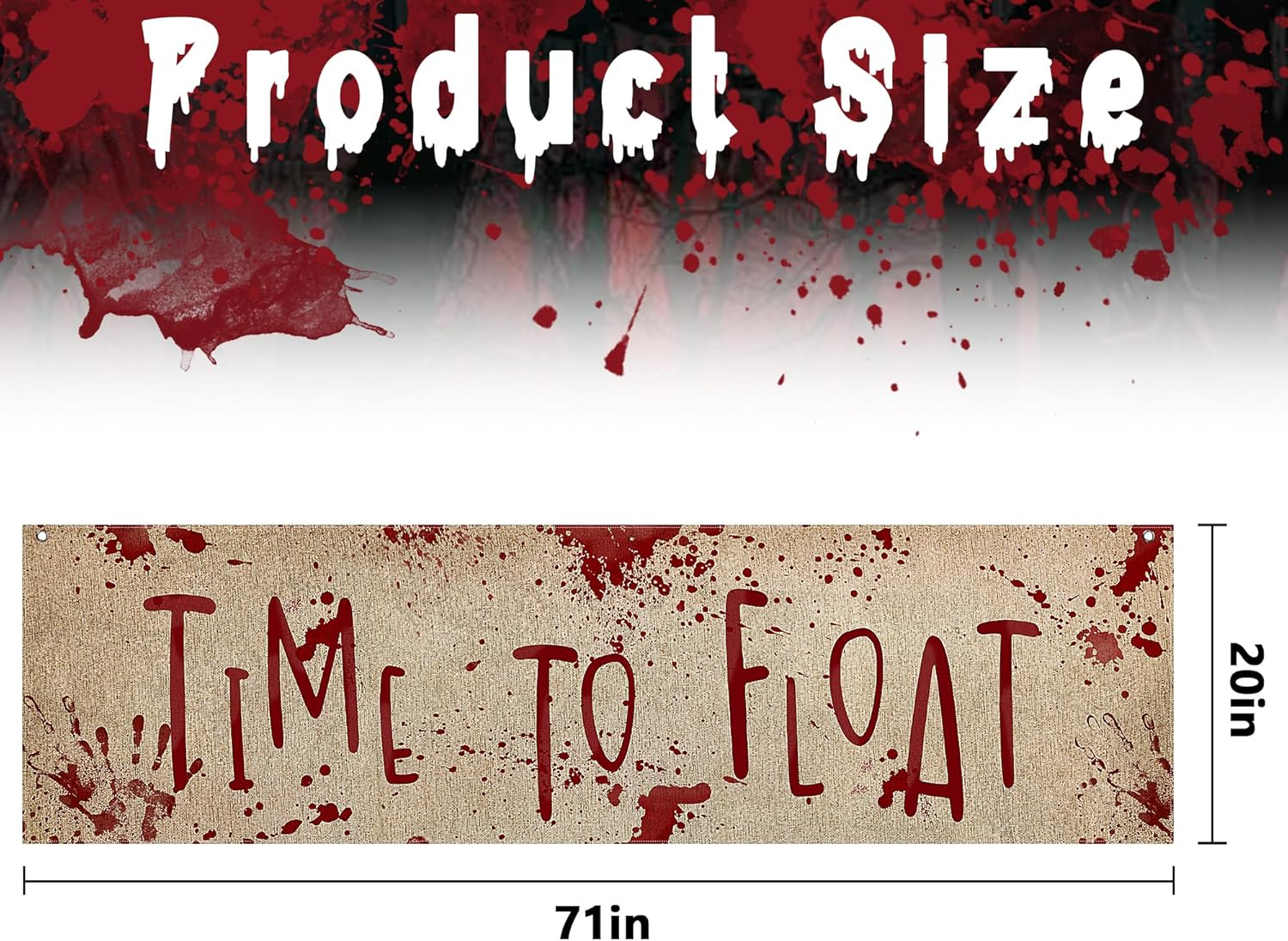 Large Size: You will receive a time to float Halloween banner measuring 20 x 71 inch, which is large and amazing, make your Halloween horror party stand out and memorable. Creepy Design: This terror Halloween hanging banner printed with the words "Time To Float" and realistic fake blood stain, handprints to creates a spooky atmosphere and is perfect for Halloween backdrop decorations. Easy to Use: This Halloween party decor outdoor banner has firm stitching, 2 corners holes for easy hanging, you can use a rope or strap, etc. (not included) to hang directly on the target position. Easy to fold storage, and reusable. Quality Material: Our Halloween banner flag is made of burlap, good wrinkle resistance, not easy to fade, weather proof, strong and not easy to break, indoor and outdoor can be used. Widely Used: The Halloween banner is suitable for indoor and outdoor decorations such as Halloween themed parties, horror themed events, haunted house decorations, etc. It can be hung on the front door, wall, yard, porch, fence, etc. Product description