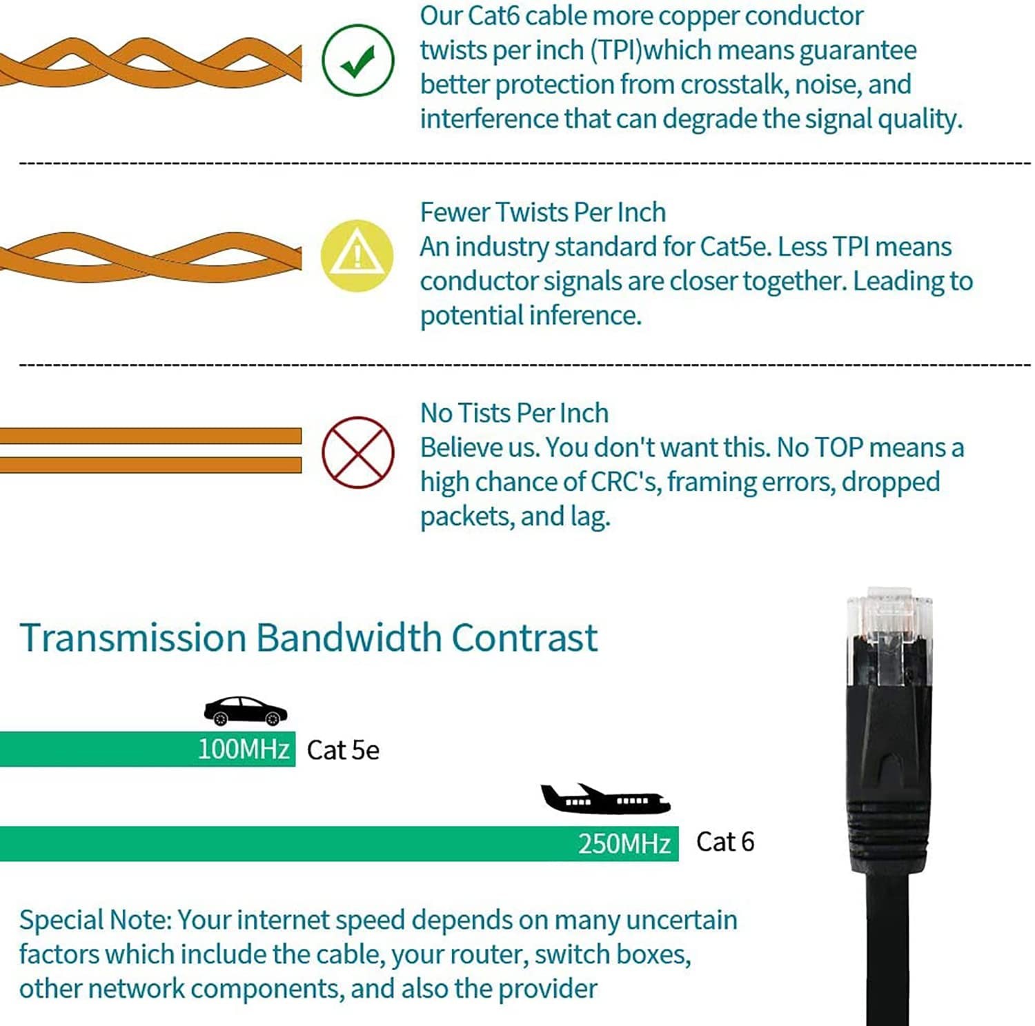 Universal Networking Compatibity: High performance Cat6 ethernet cable, 75 feet, provides universal connectivity for LAN network components, supports all devices with RJ45 Jacks, Fit for PCs, computer cable servers, switch boxes, ADSL, printers, routers, network media players, hubs, television set with network interface, Modems, laptop, tv, USB LAN cable adapter, PS4, Xbox One, Xbox 360, Gaming, NAS, keystone jack, networking equipment, inline coupler Universal Networking Compatibity: High performance Cat6 ethernet cable, 75 feet, provides universal connectivity for LAN network components, supports all devices with RJ45 Jacks, Fit for PCs, computer cable servers, switch boxes, ADSL, printers, routers, network media players, hubs, television set with network interface, Modems, laptop, tv, USB LAN cable adapter, PS4, Xbox One, Xbox 360, Gaming, NAS, keystone jack, networking equipment, inline coupler Faster Speed & No Interference: 4 UTP(Unshielded Twisted Pair) patch LAN cable th RJ45 connectors are made of copper wires, provides performance of up to 250 MHz, protects 75 feet ethernet cable from crosstalk, noise and interference;With 8 pure copper contact pins on each end, cat6 long ethernet cable fit for PS4 is suitable for 10Base-T, 100BASE-TX(Fast Ethernet), 1000Base-T/1000base-tx(gigabit ethernet)and 10gbase-t(10-gigabit Ethernet) Flat Design & 20 Free Clips: Cat6 75 feet internet wire with Ultra-thin technology avoids tangled cords and saves space;With 20 FREE cable clips, you can easily and seamlessly make the cable run along walls, follow edges or corners;Super flexible when run under the carpet or bent in the plane of its thin cross-section such as doors, drawers, rotating arms etc, cleaner and safer Durability & Stability: PVC jacket protects inner cooper core;No need to worry about the mess issue of 75ft cat 6 ethernet cable when surfing the net, watching TV, stream video, listening to the music and transmissing data at greater speed of 75 feet lan cable fit for PS4;Cat6 flat ethernet cable is suitable for Fast Ethernet, Gigabit Ethernet, and 10-Gigabit Ethernet Enhanced Safety: This flat network cable is LSZH-tested, ensuring low smoke and low toxicity for enhanced fire safety;It also offers corrosion resistance and long-term performance, making it a reliable choice