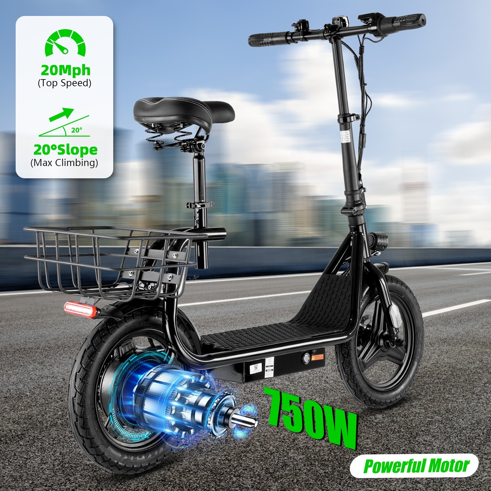 Product Description About this item đ´ăPowerful Motor & Long Battery LifeăCaroma electric scooter adults with a 750W(Peak 1200W) electric brushless hub motor allows for speeds up to 20mph. This adult electric scooter has a capacity 48V battery with a max travel range of up to 30 miles under specific conditions and a maximum load of 300 lbs. đ´ăSmooth & Safe RidingăE scooter for adults with Larger 14" rubber pneumatic tires increases shock absorption from bumpy city riding, bringing a smooth ride. Caroma escooter electric for adults with a 9.5" wide deck and adjustable saddle make it more comfortable even on a long-range commute. Disc brake & E-ABS, ensuring an effective braking distance and safety. đ´ăDesign for CommutersăEletric scooter for adults comes with a basket above the rear wheel, perfect for shopping trips and short errands around the block. Built-in spot headlight makes the road visible and safe to ride at night. đ´ăFoldable & Easy to CarryăElectric scooter with seat for adults has a folding design. The compact folded size makes it easy to store in car trunks and other tight spaces, detachable scooter seat is included. Electric Scooter with Seat & Basket