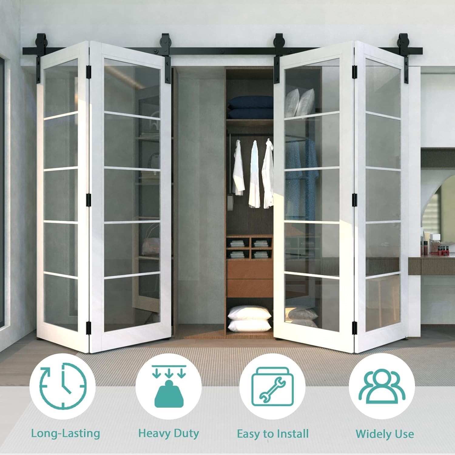Bi-Folding Sliding Barn Door Hardware Kit 【Superior Quality】Made of black heavy-duty steel, it has the benefits of sturdy, durable, wear-resistant and corrosion-resiatant. The roller is a combination of high-quality bearings and nylon wheels, matched with 6mm thick track to improve the bearing capacity of the product. And it has undergone 120,000 tests to ensure quiet and smooth sliding. 【Unique Design】Different from the traditional hardware kit on the market, the folding door kit can greatly save you space. And the scope of application is wide, can be used in a variety of living occasions, such as living room, dining room, study, etc. 【Package List】Packing: 2x 3.2FT track, 4x roller, 4x roller rotating bracket, 2x roller fixator, 5x spacer, 6x hinge, 2x floor guide, 1x Sealing Strip. Fit Door Thickness: 1-3/8"~1-3/4"(35mm~45mm). [Friendly reminder: DOOR NOT INCLUDED] 【Easy to Install】The total width of the door panel plus 4" is the length of the track. We provide detailed Bi-Fold sliding barn door kit instructions with pictures and text, which can be intuitively installed by yourselves, saving the time and cost of finding an installation team for you. 【Easy Install & 24 Hours Stand By】We have a professional customer service team 24 hours online to help you. If there is any problem about our products, please let us know and we will try our best to solve your problem.