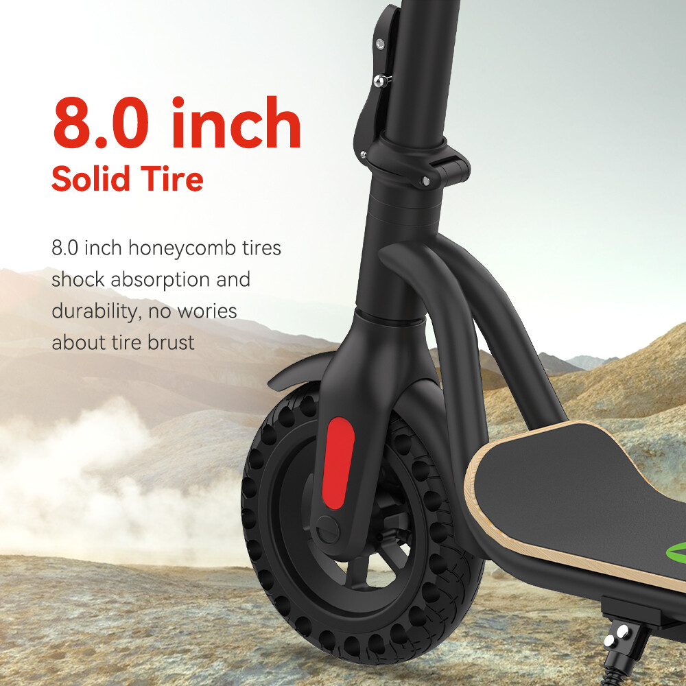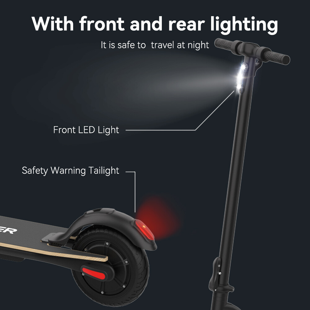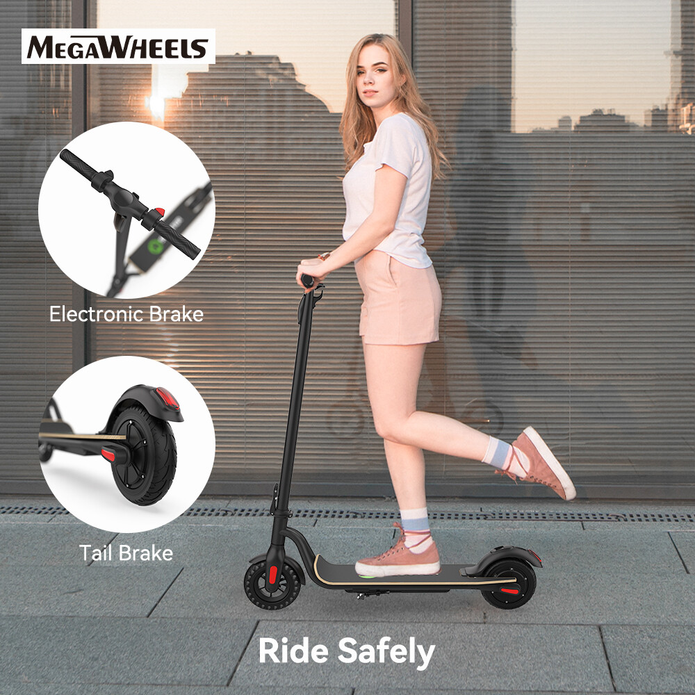 Features: LONG RANGE BATTERY LIFE Powerful 250W motor and 7.8 Ah/36V lithium battery pack that supports a speed of up to 15 Mph with a range up to 13 Miles. Updated large-capacity battery life, designed for commuters and longer distances. 8.0" HONEYCOMB & SOLID TIRES - Shock-absorbing rubber tires offer a smooth ride even over bumpy surfaces. PORTABLE FOLDING DESIGN Electric scooter can be folded easily in 3 seconds with quick folding latch for easy carrying and storage. BATTERY INDICATOR AND LIGHTS Battery indicator keeps to track battery life. Ultra bright LED headlight and taillight. Fast recharging about 5 hours. GEAR SHIFT SETTING 1st gear for a 7 Mph comfortable ride or 3rd gear to get the 15 Mph fast experience. Extremely fun to ride and end boring commutes. Specification: Brand: Megawheels Model: S10 Dimension: Unfolding 105 x 43 x 118 cm; Folding: 105 x 43 x 48 cm Net Weight: 11.9kg Color: Black Frame Material: Aluminium Tires: 8.0" Honeycomb Front Tire & Solid Rear Tire Max Load: 100kg Max speed: 25KM/h Speed level: Gear 1--Max 10km/h ; Gear 2--Max 20km/h; Gear 3--Max 25km/h Mileage: 17-22km Grade Ability: 20 degree slope Working Temperature: -15°C-50°C Storage Temperature: -20°C-25°C Mode Type of Motor: Brushless hub motor Battery Type: High quality lithium battery Battery Capacitiy: 7.8 Ah Battery Voltage: 36V Charger Input Voltage: 100V-240V Charger Frequent: 50Hz/60Hz Charging time: 5 hours Package Contents: 1 * Folding Electric Scooter 1 * Battery Charger 1 * User's Manual Riding Skills: -Put your foot in the front of the scooter and the other foot on the floor before riding. -Make sure that the riding route is smooth. -Slide forward with the food standing on the floor before starting (like riding the scooter without power). -Immediately press the acceleration button and lean forward to avoid falling over backward due to inertia, so that the electric scooter will enter the working status. -Avoid pressing the handle with your body in the acceleration and deceleration process. Put one foot ahead and the other behind (like on the sliding plate/surfboard, put one foot ahead and the other behind by 70-90 for better comfort). -Turning – The turning principle of the electric scooter is the same with that of surfboard/sliding plate/skis. The handle shall be balanced with the body. Observe and make sure that turning is safe before turning. NOTE:The appearance of the product you receive may vary slightly from the image shown due to differing production batches! Tips: Before riding the scooter, please put one foot on the scooter deck and the other foot on floor and push the scooter forward by kicking the floor for some distance, in this way, the scooter will get some impulse to run forward. Note: This products have been certified under UL2272 safety standards.