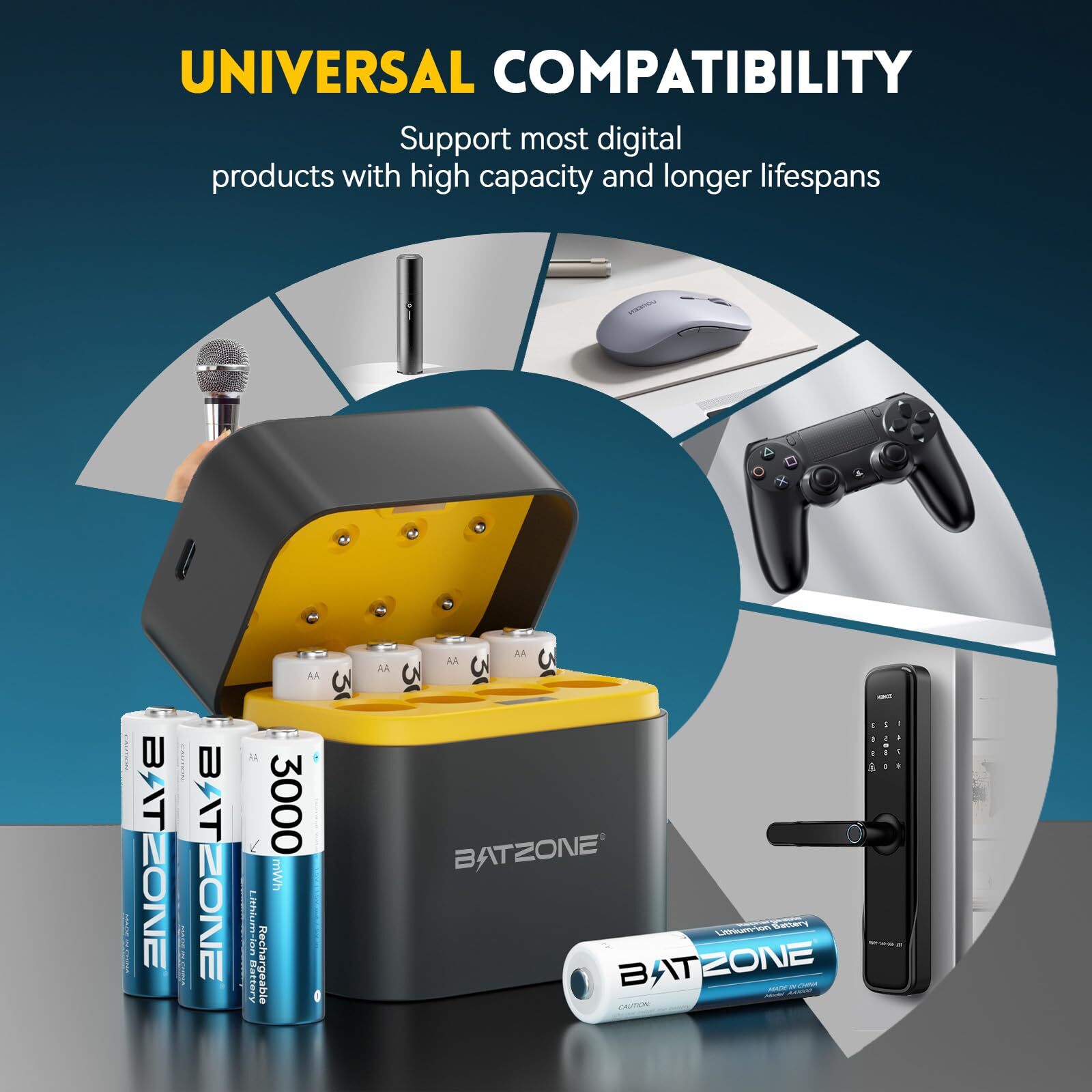 【Ultra-high Capacity and 1.5v Voltage Output】BATZONE rechargeable lithium aa batteries with a high capacity of 3000mWh and higher energy density,which allows for a high number of charge/discharge cycles and a long lifespan.Constant output of 1.5V for the entire process until the power is completely depleted, keeping your device in top condition at all times. 【1600 Times Long Cycle Life】With no memory effect and a very low self-discharge rate, our double a rechargeable lithium batteries have more than 1600 rechargeable cycles, which can save you a lot of money.Overall, rechargeable Lithium AA batteries are a convenient power source,providing a reliable and long-lasting energy supply for everyday use. 【Integrated Charging and Storage】With 8 independent charging slots, the lithium battery charger adopts a magnetic design, allowing the battery charging and storage as one, making the battery storage and carrying more convenient, supporting 1-8 AA lithium batteries in any combination of charging. 【2.5H Fast Charging Technology】2.5 hours quick charge for 1-8pcs aa lithium batteries, reduce your waiting time.Type-C charging port is suitable for all kinds of interface input, you could use a laptop, car charger,power bank,adapters etc. to charge the battery,make the charging more flexible.(Recommended: 5V/3A) 【A Popular Choice for Portable Electronics】BATZONE rechargeable lithium aa batteries with charger feature 3000mWh and 1.5V constant voltage output, ideal for high power consumption devices,such as Gamepad, VR Grip, Doorbell, Camera, Flash, Door Lock, Microphone, Radio, Children's Toys, Alarm Clock, Scale, Blood Pressure Monitor and so on.(Also Suitable for blink camera )