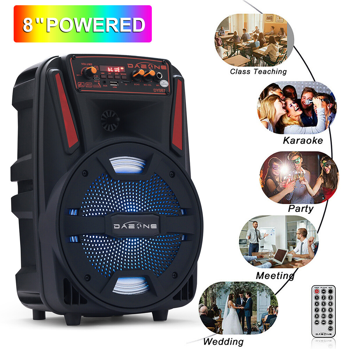 8'' Portable Party Bluetooth Speaker FM Radio DJ LED with Remote/ Microphone/USB Specifications: 8” BIuetooth LED Speaker with USB & TF Card Reader - 100wattsRMS @1.0%THD@3ohms - 1000 watts peak power - Built-in rechargeable battery offers 3 hours of continuous music playing - ABS Plastic Face & Rugged perforated grill for extra protection - Woofer: 8 LED woofer - LED Power Switch - Inputs: USB flash driveTF Card, AUX & Bluetooth’ - 1/4” microphone input with separate microphone volume control - Built in LCD screen with playback controls - USB & TF Card maximum size: 16GB - Plays .mp3, .wma & .wav files from USB drives and TF Cards - Bluetooth compatibility allows for wireless connection to any A2DP - stereo Bluetooth device - Bluetooth Range: 32 Feet - Echo & Volume controls - Top carry handles - Sensitivity: 95 ± 2dB(1 W@1 M) rechargeable battery should be fully charged prior to its initial use 8-10 hour. Package: 1 × Wireless Party Speaker 1 × Remote 1 × Power Adapter 1 × User Manual 1 x Micphone Delivery details Payment Terms of sales Feedback Contact us Delivery details 1. BUSINESS DAY MONDAY- FRIDAY FAST SHIPPING FROM USA. 2. All orders and payments received before 4PM EST (1PM PST) will be shipped the same business day. 3. No shipping on Saturday,Sunday or USA Public Holidays 4. No responsibility for any custom duty Payment We accept payment by PayPal only. Terms of sales 1. We offer a 60 day money back guarantee or exchange. 2. Buyer pays return shipping and we pay replacement shipping. 3. If you want to initiate a return,please contact us to get a returning address before sending the item back. Feedback 1. We strive to provide the best products and services. 2. Your positive feedback 5 stars DSR help us do better. 3. If anything about your transaction did not meet expectations, please CONTACT US and give us the opportunity to make things right. We are always here to help. Contact us Please do not hesitate to CONTACT US . You can message 24/7 on eBay for all questions and inquiries. We will get back to you within one business days at the latest from Monday- Friday.