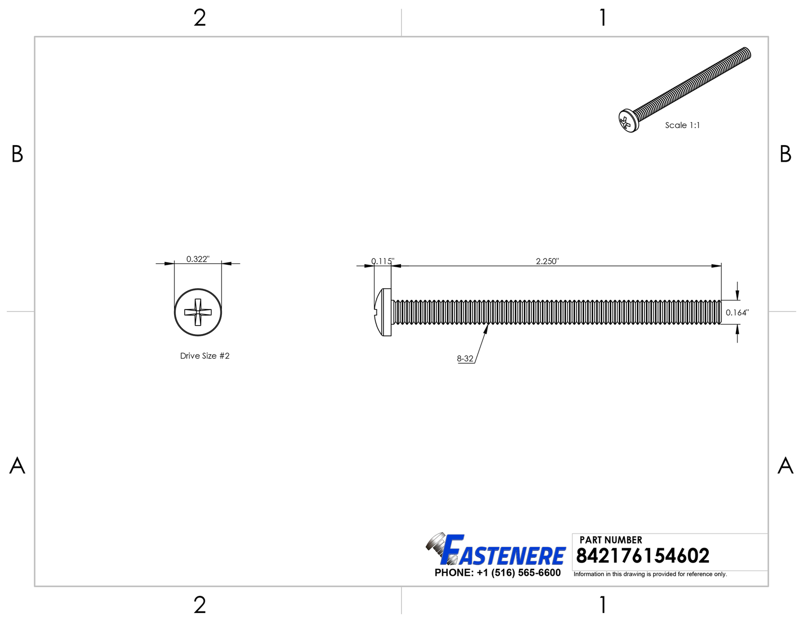 8-32 x 2-1/4" Pan Head Machine Screws Phillips Drive Stainless Steel Qty 100 Pan heads are slightly rounded with short vertical sides. Machine screws have machine threads for use with a nut or in a tapped hole. Machine screws are often used with nuts but also often driven into tapped holes (without nuts). They might be considered a screw or a bolt based on the Machinery's Handbook distinction. In practice, they tend to be mostly available in smaller sizes and the smaller sizes are referred to as screws or less ambiguously as machine screws, although some kinds of machine screw can be referred to as stove bolts. Rod with spiral threads the entire length and with one flat end and a head on other end. Holds object to another object that has a pre-threaded hole, frequently a nut. Usually manufactured from metal. Can be rotated into or out of the object using a screwdriver or wrench. General Product Information Head Style : Pan Drive Style : Phillips Drive Size : #2 Thread Size : 8-32 Length : 2-1/4" Material : Stainless Steel 18-8 Quantity of Fasteners in Package : 100 Detailed Product Information: Head Diameter : 0.322" Head Height : 0.115" Thread Diameter : 0.164" Threads Per Inch (TPI) : 32 Coarse or Fine Thread : Coarse Thread Coverage : Full Thread Thread Length : 2.250" Key Notes: Pan head machine screws can be considered both a screw and bolt and can be paired with nuts and washers or threaded into any internally threaded item that has the same machined thread patern Pan heads have a domed top with a flat load bearing surface on the underside that will hold materials being fastened firmly together; these machine screws can be paired with an internal tooth lock washer to form a bond that will withstand vibrations and high traffic when required Phillips pan head are the most commonly used machine screws and being made from stainless steel makes these fasteners the best choice for replacing old screws or using on a project that will be exposed to a damp or corrosive enviroment These phillips pan head machine screws are driven with a Phillips drive bit which is very common; the phillips drive has a tendency to slip if there is too much torque applied during installation and these machine screws being made of a high quality stainless steel which is softer than other non corrosion resistant fasteners are also susceptible to stripping so it is recomended to use a slower speed or to set the clutch on the driver so when the machine screw is fastened completely the drill does not shred the phillips drive Fastenere brand phillips pan head machine screws are made from a high quality stainless steel grade 18-8 which offers one of the highest levels of chemical and corrosion resistance that will out perform and out last all zinc plated fasteners for years with out the need to perform costly and time consuming maintenance Shipping: All orders placed before 3:30 pm EST Will Ship Same Day Tracking is provided on ALL Orders Priority Mail Shipping service is offered at a discount of only $3.95 UPS Ground UPS Next Day Air is available, Please inquire for pricing Returns : ALL returns are accepted if returned within 60 days. Money Back or exchange guaranteed. NO Restocking Fees. For YOU, we constantly strive to find ways to improve our performance.