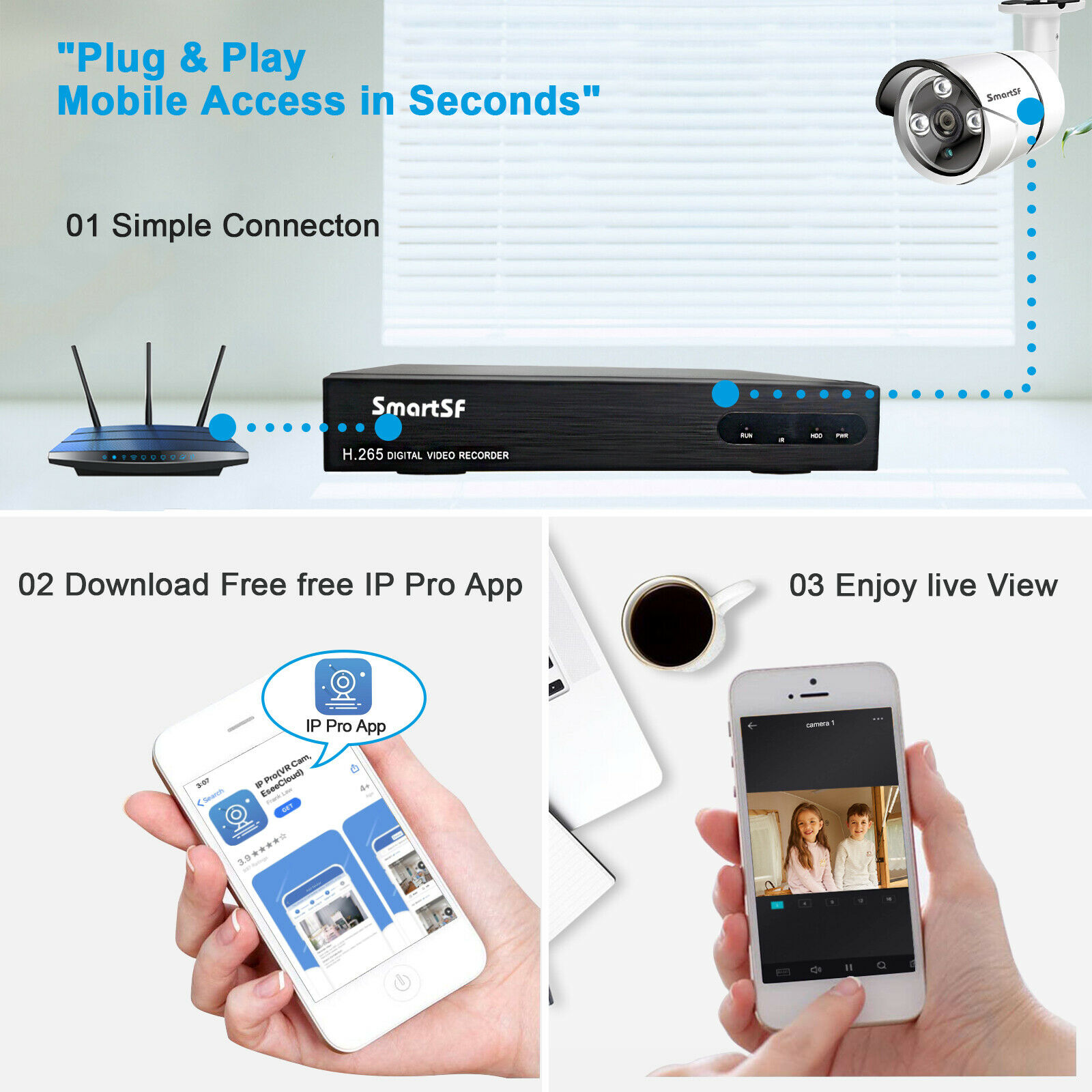SmartSF 8 Channel 5-Megapixels 2560*1920P Outdoor PoE IP Security Camera System Features: 【Super HD 5-Megapixel High Resolution】 5.0MP IPG5520-F with a pixel resolution of 2560x1920, that is, nearly 2.4X the resolution of 1080p Full HD, and even 1.3X the resolution of 1440p. It sees and records your home security more clearly, with more details. 【Excellent Night Vision, Up to 100ft】 Great cameras aren't just measured by images in daytime. SmartSF 5.0MP security camera kit stands out for its incredibly excellent images at night. Infrared LEDs enable long night vision distance (up to 100ft). Captures crystal clear video evidence of theft and vandalism that occur in low-light conditions. Reliable Solution for Home, Business and Projects. 【Waterproof Works Perfectly Outdoor/Indoor】 The 4 Bullet cameras 5.0MP IPG5520-F have solid aluminum bodies and housing, with an IP66 waterproof rating. So you can feel free to install them outdoors, like in your garage, backyard, or anywhere else. It can stand harsh weather conditions, including rain, snow, intense cold and heat. Rain or shine, hot or cold, these cameras never quit. 【PoE–Easy Setup, Eve n for a Beginner 】 A real plug and play security system! It features PoE (Power over Ethernet), with a single network cable connecting each IP camera to the NVR for both power supply and video signal transmission. Easy wiring – the wiring process can’t be simpler for DIY enthusiasts and beginners. 【Remote Viewing, Anytime, from Anywhere】 No matter where you are, you can remotely access the security camera to see live streaming and stay connected. Remotely view the IP camera via free “IP Pro” App on your mobile device, free “E-see Net” CMS Client on your computer, web browser. Even when you are in your office or travelling, you can check what's happening to your home/business on the go. PoE Network Video Recorder Specifications: IP Video Input: supports 4 IP cameras Video Output: Monitor or HDTV via VGA, HDMI Compression Format: H265+, H.265 and H.264 Playback: 4 cameras play simultaneously HDD: Not included HDD Capacity: 1x internal SATA port, up to 6TB Power over Ethernet Sockets: RJ45 x 4 USB Port: 2x USB 2.0 (mouse control, backup, firmware upgrade) Remote Access: iPhone, Android Phone, Windows PC PoE IP Camera Specifications: Image Sensor: 1/2.8" CMOS Sensor Effective Pixels: 2560 x 1920 (5.0 Megapixels) Frame Rate: Main Stream@25fps, Sub Stream@6fps Day & Night Vision: Auto / Color / BW Output Interface: RJ45 Operating temperature: Up to +60℃ What’s In Box: 1x 8CH 5MP NVR 1x 4pcs 5MP cameras 1x USB mouse 1x DC 48V3A power supply for NVR 4x 18m network video cable for IPC 4x Screw kit for IPC installation 1x User manual