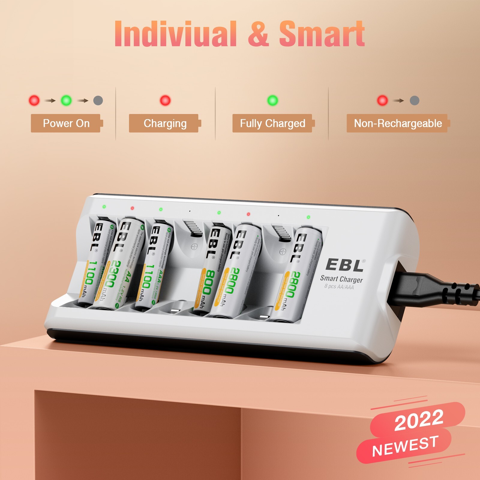EBL AAA Rechargeable Batteries, 8 Pack Precharged AAA Batteries 1.2V 1100mAh with AA AAA Battery Charger About this item AAA Batteries with charger, Upgraded EBL 8-bay basics battery charger for AA/AAA NI-MH/NI-CD batteries with 8 pack aaa rechargeable batteries 1100mAh. Individual battery charger, 8 smart LED lights display the charging process, and automatically switches to trickle charge when full charged to ensure maximum battery capacity. AAA Battery with ProCyco technology - 1200 Tech, ProCyco (Professional recycle) helps maximize its best power performance while charging. Improved low self discharge makes ebl batteries still maintain 80% of capacity after 3 year of non-use. Package includes: 1 x EBL battery charger, 8 x 1.2v 1100mAh AAA rechargeable battery Note: Products with electrical plugs are designed for use in the US. Outlets and voltage differ internationally and this product may require an adapter or converter for use in your destination. Please check compatibility before purchasing. On Jan 8, 2025 at 02:18:52 PST, seller added the following information: