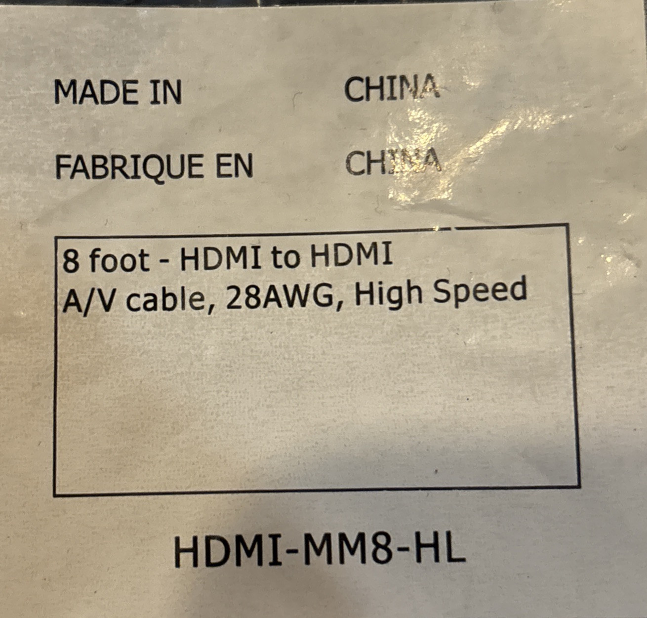8 foot - HDMI to HDMI A/V cable, 28AWG, High Speed HDMI-MM8-HL RoHS COMPLIANCE New in the original bag. Never opened. Never used. Thank you for visiting my store. I list new items daily. Please follow me to stay updated. Delivery date(s) provided by the USPS cannot be guaranteed