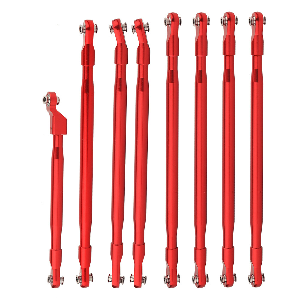 Features: The front suspension has been optimized to reduce bump steer, while the rear four-link reduces torque twist. Aluminum alloy suspension links set. Compatible with Axial SCX6 JLU Wrangler. Provide stronger support and tension. Novel appearance and exquisite workmanship. Specifications: Compatibility: Axial SCX6 Link material: Aluminum alloy Color: Black/Blue/Orange/Red/Silver Quantity: 8pcs/set Weight: about 350g Package Included: 1 Set * SCX6 Links Set