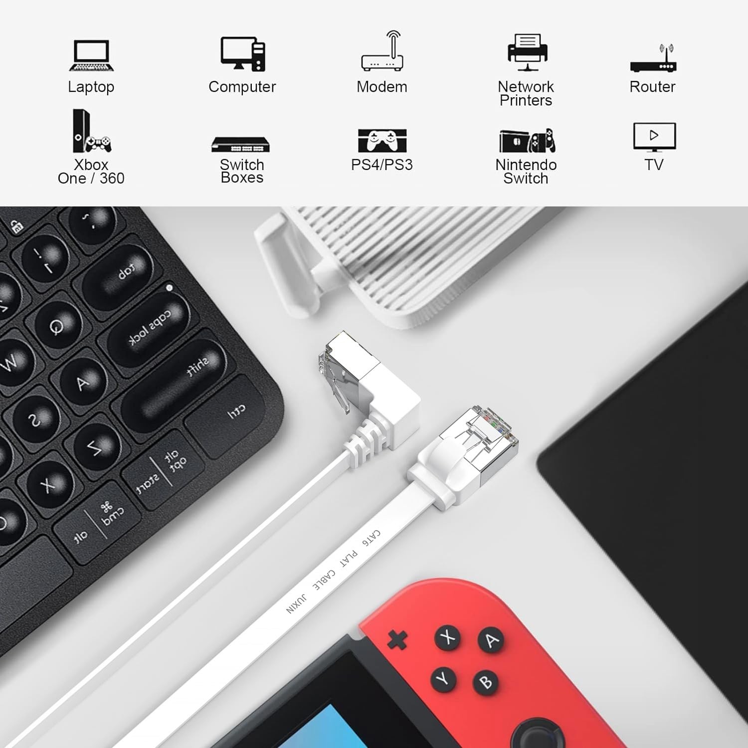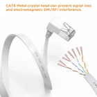 90 Degree Cat 6 Ethernet Cable Right Angle Cat6 Ethernet Patch Cable Bandwidth up to 250MHz 10Gbps- White -3ft 6ft 10ft 20ft Intended for Wired Home and Office Networks:Right Angle Cat6 Network Patch Cable offers universal connectivity to computers and network components, such as routers, switch boxes, network printers, network attached storage (NAS) devices, VoIP phones. Cat 6 patch cables are available in 5 different length and in various lengths ranging from 1.5 foot to 30 feet. Right Angle ethernet cable Perfect for hiding in wall crevices or behind furniture to enhance the aesthetic of your home or office. And Hides perfectly under rugs and won't trip over kids and pets. Built for Future-Proof Speed and Reliable Connectivity:This cable provides exceptional transmission performance and low signal losses. It supports up to 250 MHz and is suitable for Fast Ethernet, Gigabit Ethernet, and 10-Gigabit Ethernet. All Cat6 cables are made of 100% bare copper wire as opposed to copper clad aluminum (CCA) wire, therefore fully compliant with UL Code 444, which requires pure bare copper wire in communications cables. 【Please note, that the plug has directionality】Right Angle "Downangle" is just a name, it does not mean that the cable must be down, it may just go in the opposite direction. If you buy in the wrong direction, you can try inverting the RJ45 Female LAN wall socket. 2Pack 90 Degree Cat 6 Ethernet Cable upangle/downangle Cable Type: CAT6 4-Pair UTP Connector Type: RJ45 Rightangle length: 23mm, Straight head:22mm Cable Outside Diameter: 6.2 * 1.66 mm (0.24 * 0.07 inch) Cable Performance: Up to 250 MHz Transmission speed: 10Gbps Compatibility: Compatible with Cat7 Cat6 Cat 5e / Cat 5 Ethernet cables The 90-degree design, is a clever solution for spaces where standard straight cables might be inconvenient. It allows for a neater and more organized cable management, especially in tight spaces or when routing cables behind furniture. Flat ethernet cable can achieve a cleaner and safer network environment, thereby improving the appearance of your home or office. LAN cables are not as tangled as typical round cables, and are extremely flexible. The length can be easily adjusted by curling without taking up space 【Please note, that the plug has directionality】Right Angle "Downangle" is just a name, it does not mean that the cable must be down, it may just go in the opposite direction. Downangle: the crystal head shrapnel switch is up and the cable is down。 If you buy in the wrong direction, you can try inverting the RJ45 Female LAN wall socket. Flat Cat6 ethernet cable Fast transmission of up to 10Gbps;bandwidth of up to 250MHz,High transmission rate, good compatibility, and convenient executio.Suitable for both outdoor and indoor use.Compatible with Cat7/ Cat 6/Cat 5e / Cat 5 Ethernet cables Cat6 patch cable connects all the hardware destinations on a Gigabit Local Area Network (LAN), such as PCs, computer servers, printers, routers, switch boxes, network media players, NAS, VoIP phones, PoE devices, and more; Supports: Gigabit 1000 BASE-T; 100 BASE-T; 10 BASE-T .Meets or exceeds Category 6 performance in compliance with the TIA/EIA 568-C.2 standard