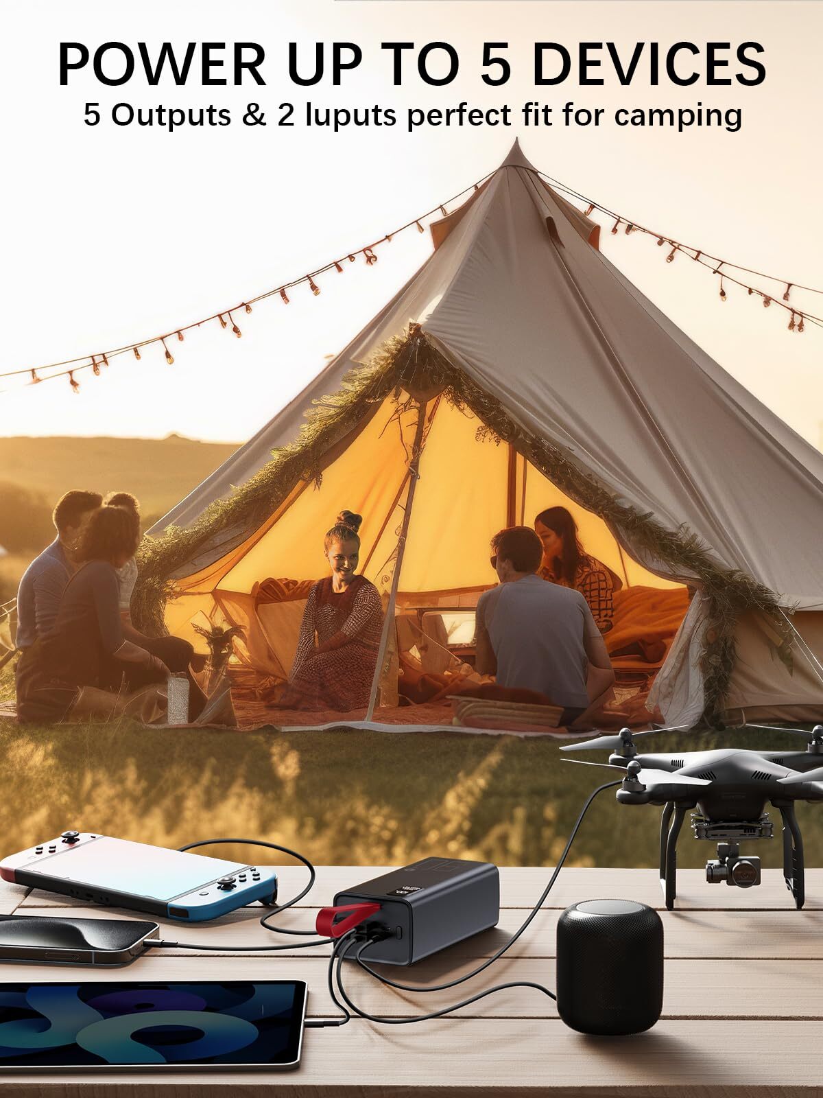 90000mAh LARGE POWER BANK: Our high capacity portable charger has a 90000mAh/333Wh large capacity, it can charge your smartphone about 10-20 times, and it can gives you enough power for over a week, suitable for camp, travel, hurricane power outages, hike, fish vacations, business trip and other outdoor activities. (Note: 80000mAh power banks NOT allowed on plane.) PD & QC 3.0 POWER BANK FAST CHARGING : This large capacity power bank support PD & QC 3.0, it has 2 of 30W USB output port, and 1 of 20W USB-C output port. This portable battery charger can charge your phone to 60% in just 30 minutes, save your time. And it is a charging station for the family - when traveling or there is a power outage, the whole family only needs this large-capacity mobile power supply to meet the charging needs. It will provide you with great support in emergency situations. 2 INPUT & 5 OUTPUT: You can share output for 5 devices at the same time, easy to use and long service life. This external battery power bank has 5 output and 2 input port: 2 USB output with 15W; 2 USB output with 30W; 1 USB-C with 20W output / with 18W input; and one micro with 18W input. Compatible with your smartphone, tablet, Bluetooth headset, handheld game console, mini speaker, camera and other USB electronic devices. FLEXIBLE LANYARD & LED DISPLAY: This mobile phone battery pack has a soft lanyard on the top, which is convenient for you to hold in your hand or put in backpack, you can carry the mobile power in different usage scenarios. And it is equipped with an LED display, which can accurately display the percentage of remaining power, you can clearly know the remaining power and charge in time. APPROPRIATE SIZE AND WEIGHT: The size of this huge capacity power bank is 5.7*2.7*2 inches, the weight is 29.5 OZ, with the same volume as others, it has more reliability and larger capacity. The volume and weight of this rechargeable power bank is appropriate for carrying out and external using scene, curve right angle design, let the power bank looks more simple and good.