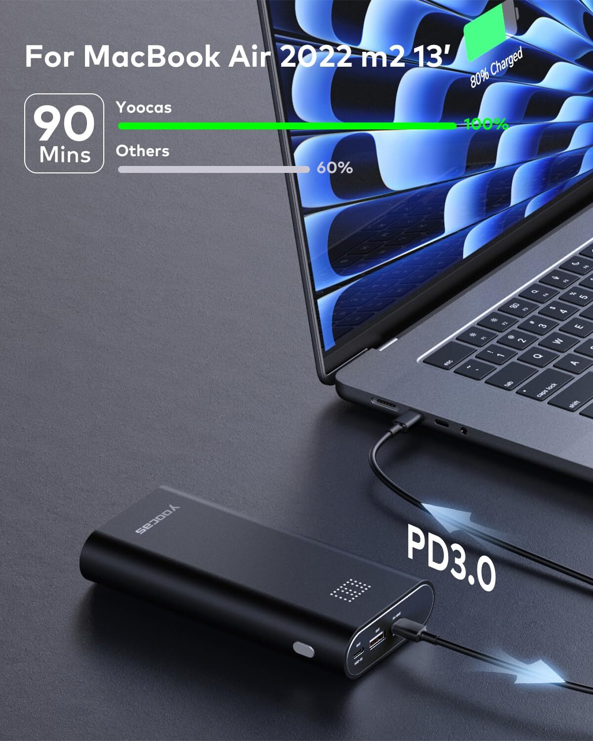 【Ultra fast charging】 PD 3.0 95W USB C &USB A Charger, maximum single port output power is 65w, charge your MacBook Air 2022 m2 13' to 100% in just 90 minutes. The outside texture is "rubbery" which makes it easy to handle without any worry of slipping from your hand or off a flat surface 【20000mAh Gigantic Capacity】 portable charge power bank comes with a massive 20,000mAh battery and a total power output of 95W! Completely recharge MacBook Pro up to 0.9 times, iPhone 15 Pro up to 3.0 times, Galaxy S23 Ultra up to 3.0 times and Switch up to 3.8 times 【3-in-1 Multiport Charging】 This 3 Port Charge power bank lets you simultaneously charge up to 3 devices with 2x USB-C ports and a USB-A port. It can reasonably control the output power according to the USB you use. Get a fast, dependable charge to your cell phones, laptops and tablets 【Escorting your trip】 With the 95W PD Power Bank, worrying about devices dying on me during long journeys is a thing of the past. Our products are equipped with 1 power bank, 1 usb-c to usb-c cable, 1 carrying bag, and 1 instruction booklet 【Wide Compatibility】 Compatible with iPhone 15 Pro/14 Pro Max/13/12/11/SE, iPad Pro/mini 5, Samsung Galaxy S23 Ultra/S22, Apple Watch, HUAWEI, MacBook Pro 16, 15, 14, 13", MacBook Air, Dell XPS 15/13, Lenovo, HP, Acer, Steam Deck, Switch, Chromebook, Pixelbook, Microsoft Surface Book 2, Kindle, and More Devices 【Focus on your safety】Power Bank will adjust different output power according to different devices to give you Multi-Level Intelligent Protection. Our products are tested and inspected in a variety of ways before they leave the warehouse to protect your devices from overcurrent, overcharging, overvoltage, overheating, and more 【Professional customer service】We promise a one-year warranty and professional customer service. If you have any dissatisfaction can contact us at any time, our customer service will reply you within 24 hours and give a good solution to you!