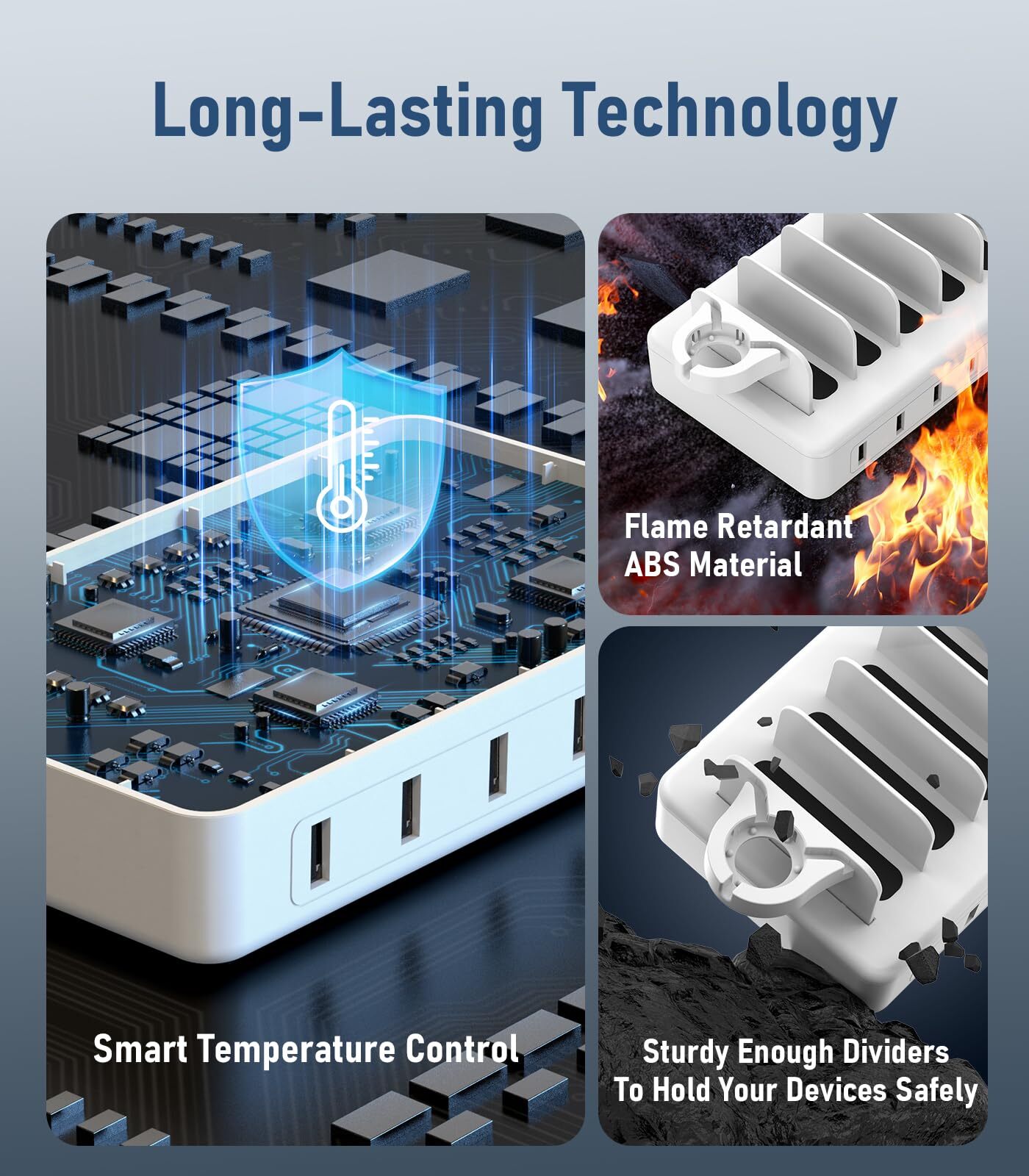 【New Upgraded USB-C Charging Ports】This new upgraded multiple charging station features 3 PD 20W USB-C ports.Compare with the traditional A port, you can charge your phone to 60% in just 30 minutes.Use the usb charging station with our type c cable to experience lightning-fast charging speed 【Maximize Your Charging】This phone charging station equipped with 3 USB-C and 3 USB-A ports, offering a total output of 96W. The multi charging station can meet all kinds of charging needs, providing fast and efficient charging for all your devices and saving a lot of time 【Organized Charging Setup】The charger station is designed with 6 sturdy dividers and apple watch stand to minimizes cable clutter and keeps your workspace tidy. The larger dividers prevent devices from slipping, effectively organizing your desk for a neat and orderly look 【Intelligent Device Protection】Our charging station for multiple devices apple has real-time temperature monitoring technology. It automatically cuts off the power supply when the temperature is too high to prevent short circuit.This apple charging station also has overheating and overcharging protection to maximize protection 【Wide compatibility】The charging station for apple devices is compatible with 1000+ usb devices.Whether you are in school, office, bedroom, desk or bedside table, it can easily charge all your electronic devices at the same time. It is also a perfect gift for family and friends 【WHAT YOU GET】The package includes 1 cell phone charging stations, 6 mixed cables, 1 power adapter, 1 user manual,18-month warranty and friendly customer service. Note: For a better experience, we recommend using the charging cables that come with our desk charging station