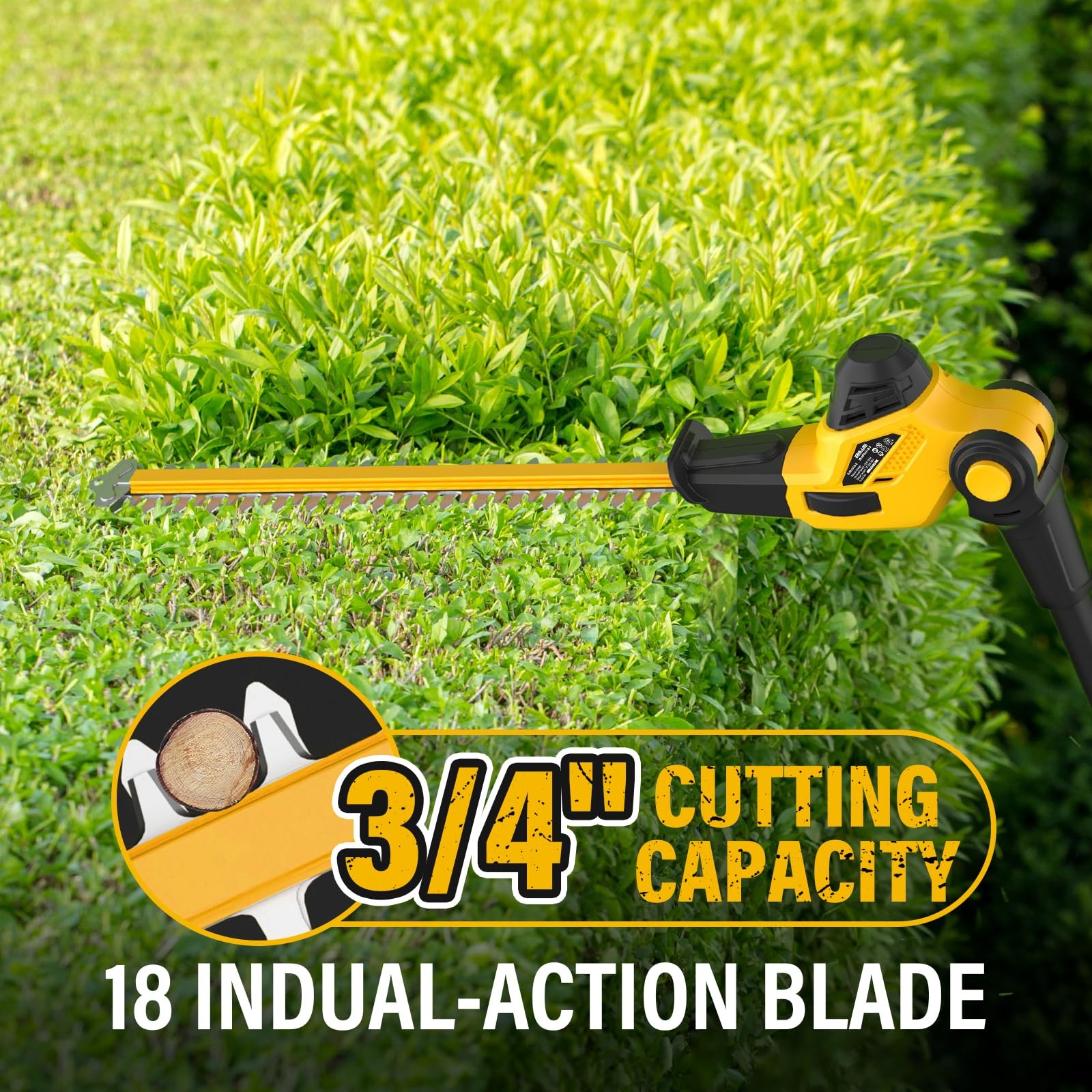 Pole Hedge Trimmer Cordless, 9-Feet Reach Power Hedge Trimmer with Extension Pole, MAX 20-inch, Multi-Angle, 2* 2.0Ah Battery and Fast Charger Included 【ROTATABLE HEAD】This pole hedge trimmer with adjustable blade hedge trimmer has a 7-position swivel head for 0°-135° multi-angle trimming. Ergonomically designed handle for a comfortable grip. It helps you to operate the hedge trimmer flexibly in any direction. 【EXTENSION POLE】The cordless pole hedge trimmer has an extension bar with a telescoping handle. It extends up to 10.4 ft (The height of the machine plus the user)for a total reach of max 16 feet for hard-to-reach trimming jobs. 【POWERFUL CUTTING PERFORMANCE】18-inch steel double-action blade cuts cleanly for optimal performance and durability. Also features a 3/4-inch cutting capacity for easy trimming of most bushes and hedges. And this electric hedge trimmer comes with a protective blade cover for safe storage. 【Safety lock】The hedge trimmer with extension bar has a double switch design that requires pressing simultaneously to turn on. The function of this cordless edge trimmer with a battery prevents accidental start-up and protects your family from danger. 【INCLUDES & WARRANTY】Pole Hedge Trimmer Cordless, 9-Feet Reach Power Hedge Trimmer with Extension Pole, MAX 20-inch, Multi-Angle, 2* 2.0Ah Battery and Fast Charger Included