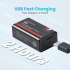 These 9V Rechargeable Batteries are perfect for a wide range of applications, including smoke detectors, devices, and clocks. With a high capacity of 1000mAh, they provide long-lasting power and can be recharged up to 1000 times, making them a cost-effective and eco-friendly choice. The USB Type C charger cable ensures fast and easy charging, and the batteries come with a built-in safety feature that prevents overcharging, overheating, and short-circuiting. Whether you need batteries for your home system, equipment, or other devices, these batteries are a reliable and affordable option. 2-IN-1 USB-C Charging Cable: The charger is equipped with a type C interface, which is with most smartphones, , laptops, and power banks. It has a fast charging mode, which can fully charge the batteries in about 2 hours. Wide application: The 9 Volt batteries are suitable for various applications, such as smoke detectors, devices, clocks, remote controls, toys, and more. They are small and lightweight, making them easy to carry and use. High-quality materials: The rechargeable 9v batteries are made of high-quality lithium-ion cells, which have a long service life and can be recharged up to 1000 times. The charger is made of fire-resistant materials, which can provide a safe charging environment. BUILT-IN LED Indicator:These usb rechargeable 9v batteries can be fully charged again with over-charging protection.Besides,the built-in LED indicator allows you to monitor the charging status just at a glance.Red light stays on while charging and greent light stays on after fully charged.No need to keep eyes on it. Capacity: 1000mAh3.7V, 411mAh9V.
