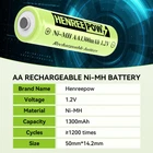 【Battery Type】AA Ni-MH rechargeable batteries, 1.97 inches long and 0.55 inches wide. Package includes 12 x solar battery 1.2v ni-mh aa 1300mAh 【Real Capacity】 Ni-MH AA rechargeable battery has a high capacity of 1300mAh, the higher the capacity, the longer the usage time, which can meet your multiple power needs, can be used for solar lights, gamepads, remote controls, keyboards, mice, toys, and other devices that require AA batteries 【Rechargeable】rechargeable aa batteries can be charged using solar power or standard charging equipment, charging cycle up to 1200 times, which saves you the cost of purchasing disposable alkaline batteries, and provides you with a longer lasting power output 【Features】Hennreepow AA1300mAh batteries are safe and stable, with high capacity and long life, free of mercury, cadmium, lead and other harmful metal pollutants, and more adaptable to temperature than other types of batteries, and can be used in temperatures ranging from -4°F to 140°F 【Suggestion】rechargeable solar batteries are received pre-charged and ready to use.However, for transportation safety reasons, these batteries are only 30% pre-charged, so please use them fully charged to prolong their operating time