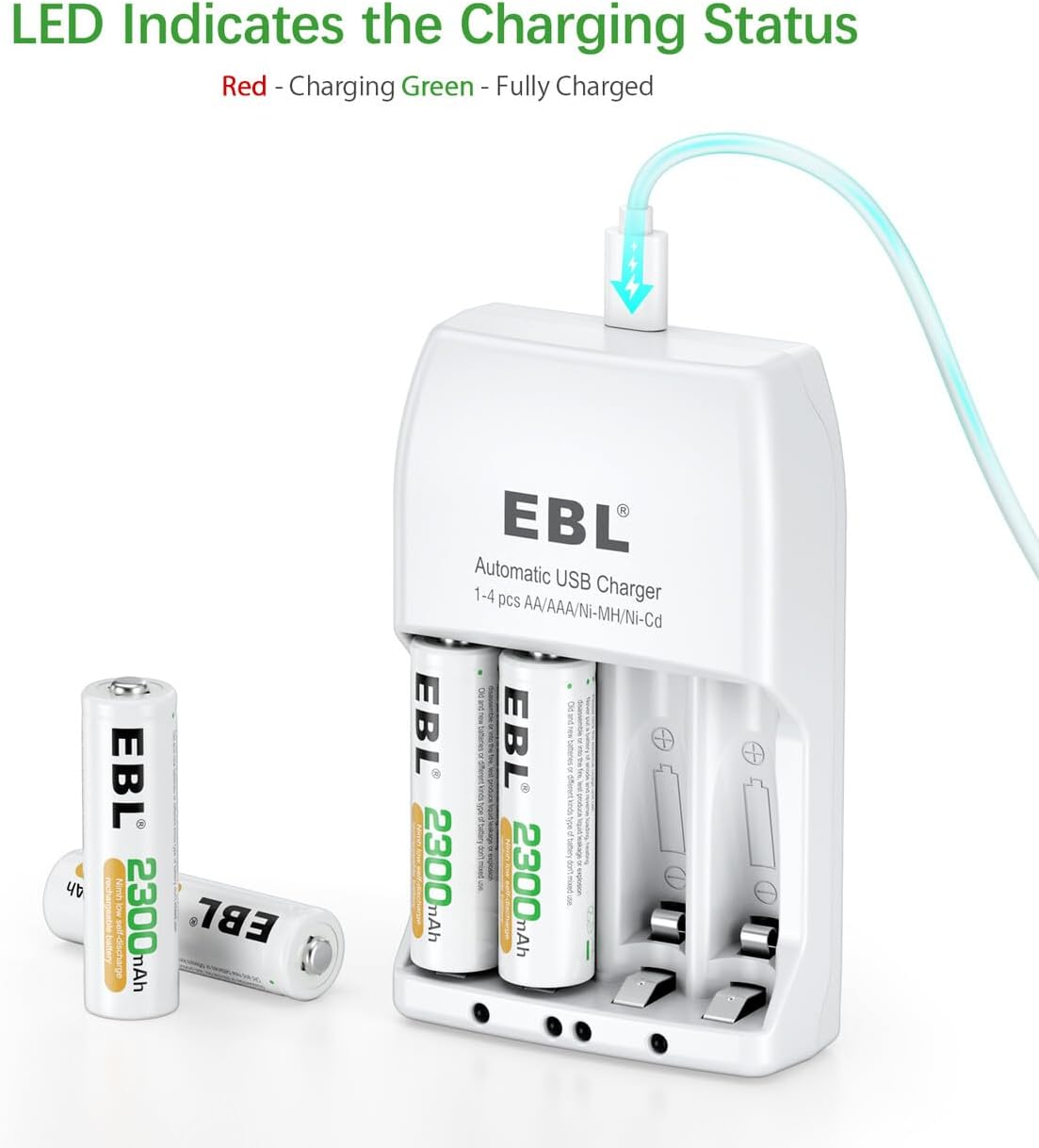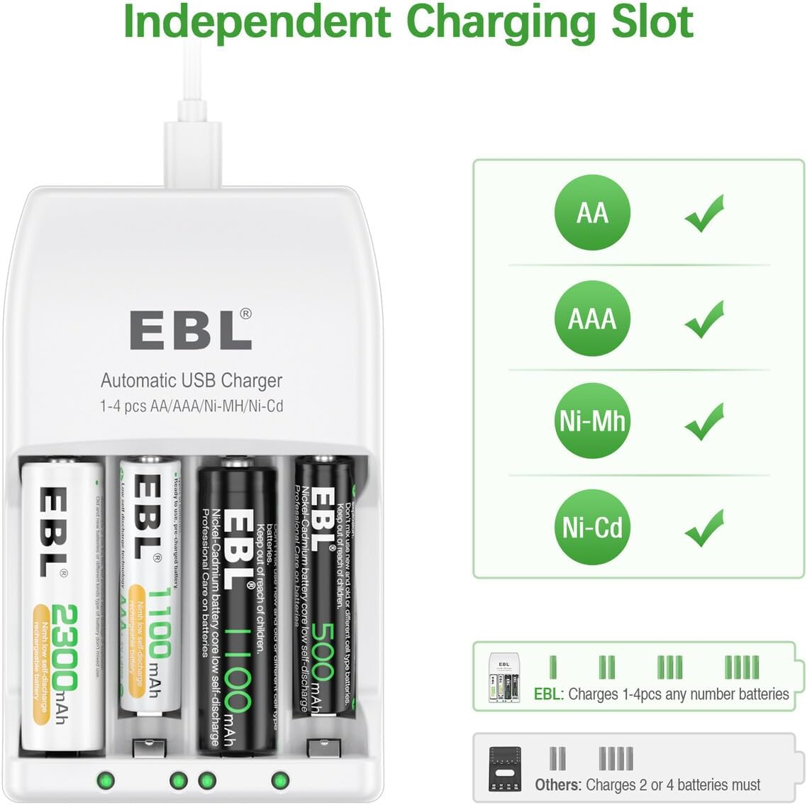 Store New Arrivals Add to Favorite View Feedback Contact AA Rechargeable Batteries 4 Pack, 2300Mah Ni-Mh with Individual Cell Battery Charger - Rechargeable AA Batteries and 916 Charger Combo for Ni-Mh/Ni-Cd AA AAA Rechargeable Batteries Description Item model number -6828 Color White Country of Origin China Item Weight 7.9 Ounces Batteries 4 AA batteries required. (included) Output Voltage 1.2 Volts Specification Met UL Package Dimensions 4.92 x 3.78 x 2.91 inches 4-Bay Individual Charger: Charges any number of AA AAA rechargeable batteries without combination to make your charging easier. Fast Smart Charger: Adopt 5V 2A USB input, fast charging design much faster than other name-brand AA AAA 4-bay battery chargers. EBL Rechargeable AA Batteries: 4 Pack of 2300mAh Ni-MH rechargeable AA battery improved low self discharge makes it still maintain 85% of capacity after 3 year of non-use. Microcomputer IC Controls Char in Process: -ΔV intelligence technique fast cuts off charging. Make sure the battery is fully charged and won’t over charge. Packages Included: EBL Ni-MH 4 x AA rechargeable batteries, 1 x 4-bay battery charger and 1 x Micro USB cable. Product Description EBL - Professional Care and Low Self Discharge EBL, since 1998, professional on batteries and chargers more than 20 years. Professional and reliable on Rechargeable Batteries and Battery Chargers. Features of Battery Charger 1. Individual battery charger could optional charge 1,2,3,4 different AA AAA Ni-MH Ni-CD rechargeable batteries. 2. Corresponded LED indicators to show the charging progress clearly: RED--charging. Green--fully charged 3. Constantly charging current and voltage keep the battery owns a longer using life. 4. Fast Smart Charger: Adopt 5V 2A USB input, fast charging capacity, greatly improving the adaptability of the product, easy take for travel using also. Features of Batteries 1. Quantity: 4 Counts AA 2300mAh Ni-MH rechargeable batteries. 2. Voltage: 1.2V 3. High Performance and ProCyco Technology - extend the lifespan of aa rechargeable batteries. 4. Precharged 15%~20% of capacity by solar energy. Could be used when you get it. 5. Excellent charge/discharge performance, the batteries will keep a high quality after 3-5 times charge & discharge when used in the first time or long time no used. LED Indicates The smart battery charger corresponded LED indicators to display the charging progress clearly: RED--charging. Green--fully charged. Multiple Protection Supports protection against overcharge, overdischarge, overvoltage, overcurrent and short circuit and ensures complete safety for you and your devices. Package Included 1x EBL 4 Slot battery charger 1* USB Cable 4x EBL 2300mAh AA Ni-MH batteries 1x User Manual ABOUT US We offer the best prices around on high quality products. Our E-store includes media such as books, movies, music and games while offering electronics, toys, sporting apparel, clothing, tools, general home, garden items and more. SHIPPING We are always working hard to ensure your package arrives as soon as possible. Please understand that some factors like weather, high postal traffic, and the performance of shipping companies are outside of our control. We offer free shipping to the lower 48 states and ship within 2 business days of payment, usually sooner. We do not accept P.O. Boxes. Please provide a physical address. For shipping outside of the continental USA, we only use eBay's Global Shipping Program.The item is shipped to KY and then sent to the rest of the world. International customers are responsible for all duties and taxes. Continue to check out in order to calculate costs for shipping the item to your country. Messages regarding eBay's Global Shipping Program MUST be directed at eBay EXCLUSIVELY. RETURNS We offer a 30-Day Return Policy on items which you are not completely satisfied with. You have the option for a full-refund or an exchange of the item. No returns are available on items shipped outside of the USA. PAYMENT We accept PayPal. CONTACT US This page content is yet to come Please ad us to your favorite seller and visit again later Thank You CUSTOMER SATISFACTION We try our very best to make sure every customer is completely satisfied. If there's a problem, message us! We're happy to help. WE ACCEPT Copyright © 2021 AutoDS. | All Rights Reserved