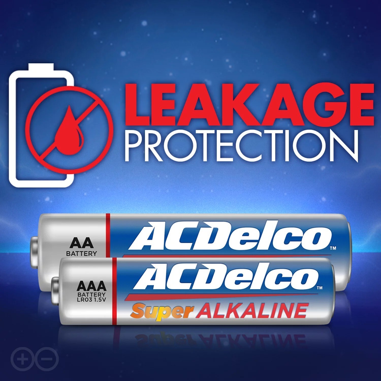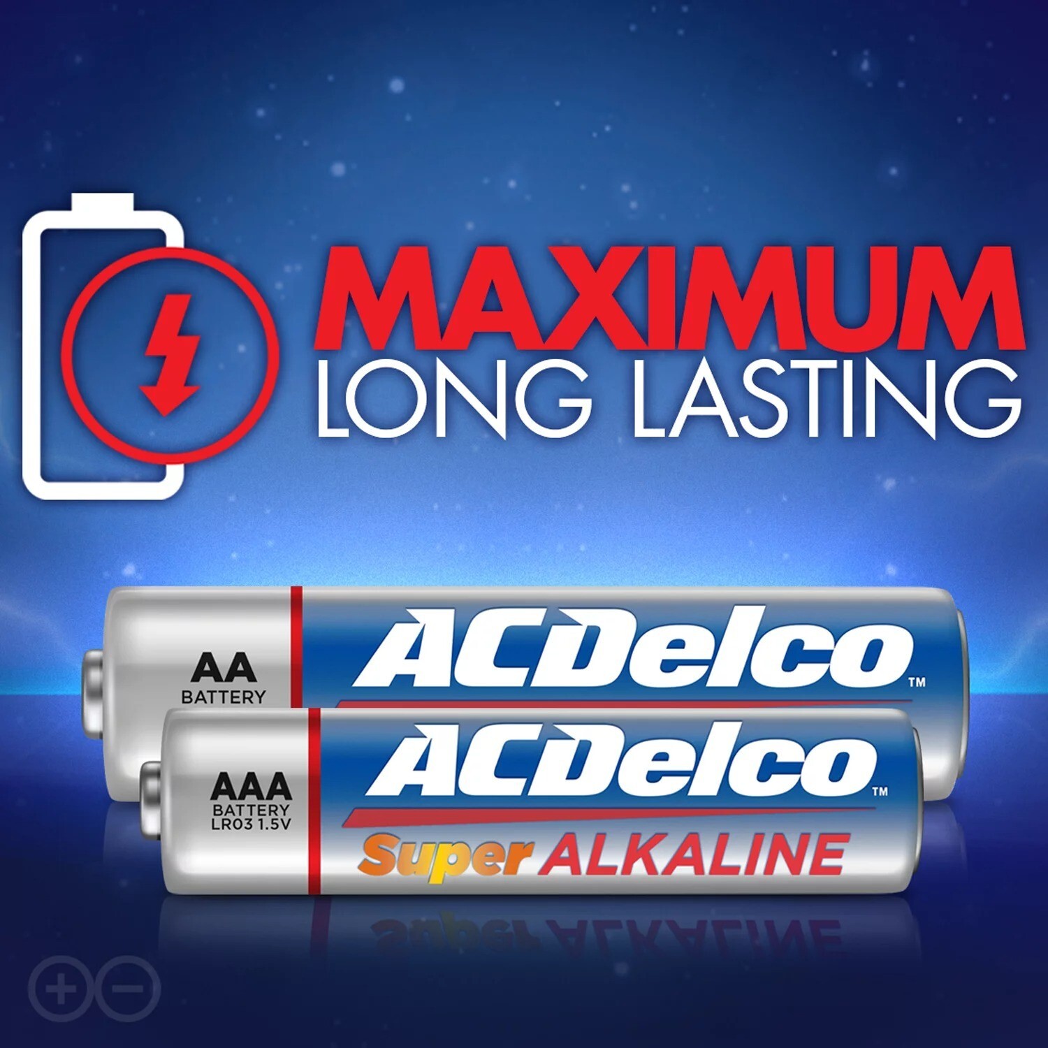 ACDelco AA and AAA Batteries, 48-Count Combo Pack Alkaline Battery, 24 Count Each Pack ACDelco AA and AAA Super Alkaline Batteries are equipped with advanced technology you can count on. ACDelco alkaline batteries perform better than the competition in high-drain and super high-drain devices, and they provide consistent discharge performance. ACDelco alkaline batteries are designed for long shelf-life with stainless steel pre-coating that prevents leakage and advanced ingredient formulation that helps maintain power over time. This set includes 24 AA batteries and 24 AAA batteries. AA and AAA batteries are great for a variety of household devices, including clocks, remote controls, and toys. The 1.5-volt batteries contain no mercury or cadmium, making them a smart choice for your family and for the environment. A trusted national brand, ACDelco offers a wide variety of batteries you can count on, including alkaline batteries, lithium coin cell batteries, rechargeable batteries, and car batteries. 48 Batteries: 24 AA batteries and 24 AAA batteries in recloseable storage pack High Performance: Performs better than the competition in high-drain and super high-drain devices 10-Year Shelf Life: Holds power and will not vent or leak when stored in a cool, dry place No Mercury: Contains no mercury or cadmium; safe for the home and better for the environment Everyday Electronics: ACDelco alkaline batteries area a household essential for all your electronic devices, toys, remote controls, gaming devices, flashlights and more