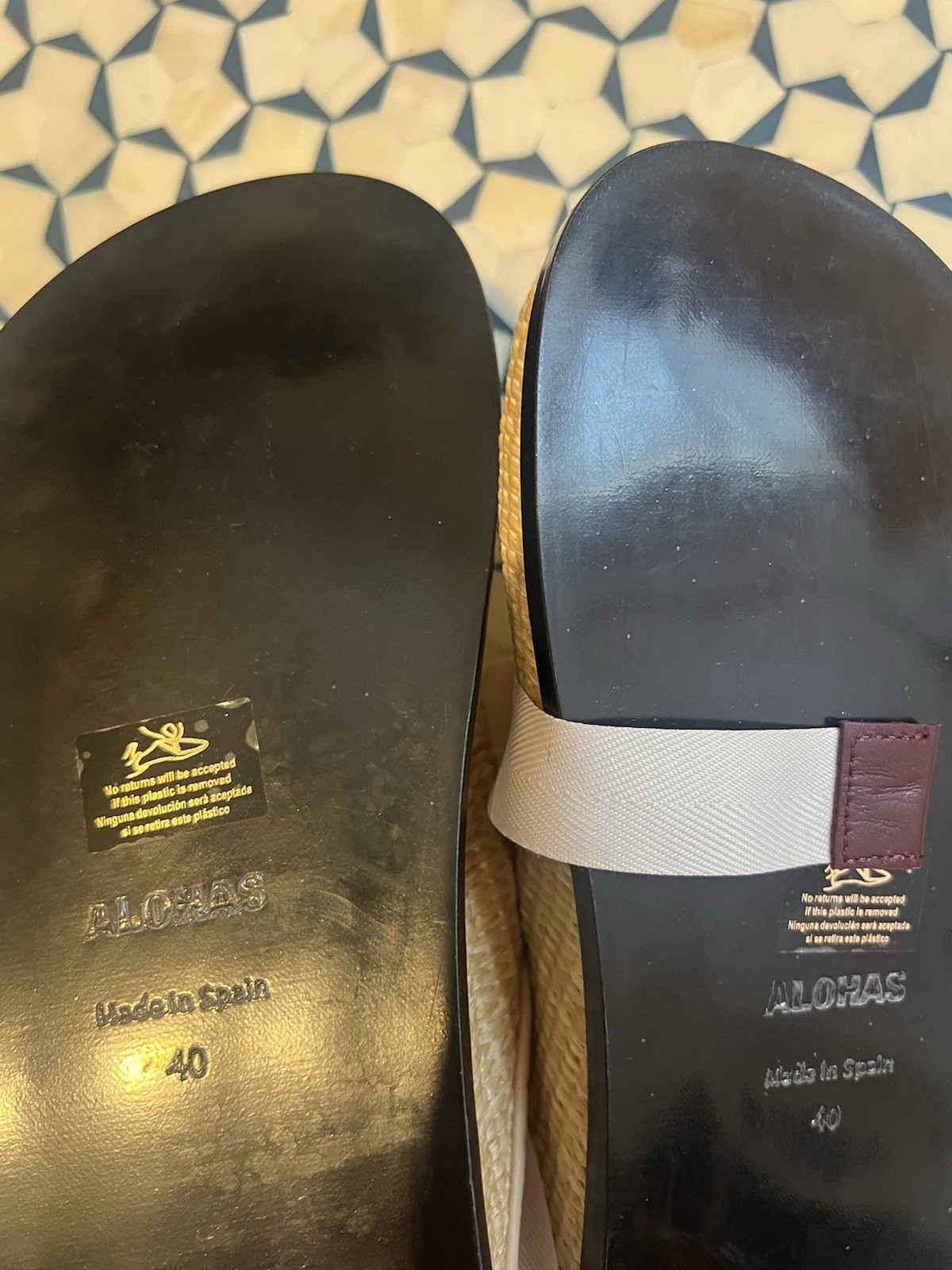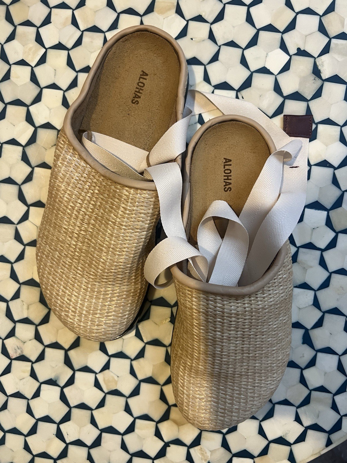 The ALOHAS Oliver Raffia Clog in size 40 is a stylish and comfortable women's shoe designed for casual wear. Made with a straw upper material and featuring a beige color, this clog exudes a laid-back yet trendy vibe. The Alohas brand adds a touch of uniqueness to this shoe, making it a standout addition to any woman's wardrobe. Perfect for adding a touch of Aloha spirit to any outfit, these clogs are both fashionable and practical for everyday wear.