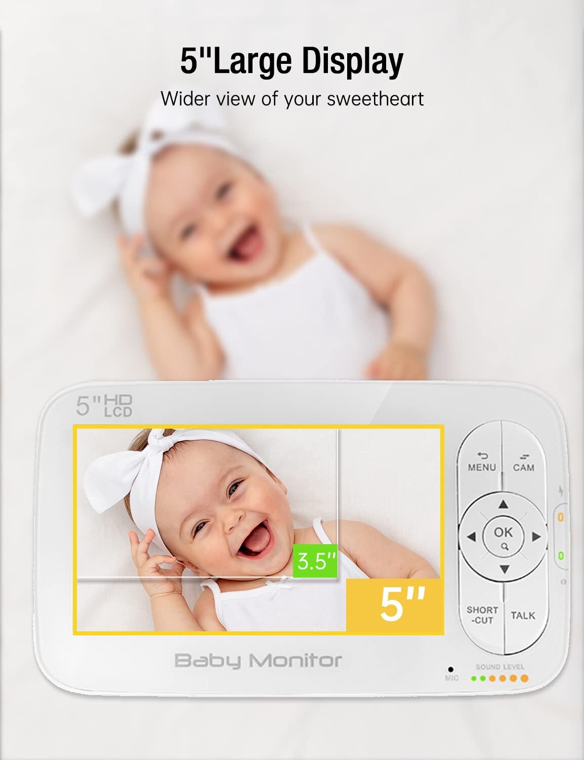 View Everything with Unparalleled Clarity and Safe Transmission: The large 5-inch 720P IPS display allows you to view your little baby more clearly and in real time, from subtle movements to the softest breathing, capturing every precious moment of your baby's growth. With premium picture and video quality, you'll never miss a moment of nurturing. Get to know your baby with remote parenting while you're doing chores or enjoying playtime. 【Instant Care】- With two-way talk and visual monitoring, and sensitive sound detection, when the baby is crying, you will be immediately alerted to comfort with your voice or built-in lullabies. The crisp sound allows you to hear every tone and detail of your baby's every sound without extra noise. Adjust the 7-level volume to hear your newborn's breathing or wake you up when you're fast asleep. 【Day and Night Companion】- Use the 5000mAh rechargeable battery to keep an eye on your baby's every growing moment from day to night. Works continuously for more than 18 hours in audio-only mode and 12 hours with audio and screen on, and with night vision, if it detects that your baby wakes up, the monitor will automatically play 5 stored lullabies to lull your baby to sleep . 【See Closer, See Clearer】- The remote control camera zooms in 2X or 4X to observe the details of your loved one carefully, and can tilt 110° and pan 340° to provide a wide view of the nursery to observe your baby's sleep or play around; the included screws give you the flexibility to mount the monitor to the wall. 【Safely Soothe Your Baby Remotely】- 2-way audio allows you to talk to older toddlers instantly, or use your own voice anywhere in the home via wireless transmission of the 1000ft long and stable internal 2.4GHz FHSS channel Soothe fussy babies. Make real-time monitoring stable, safe and private. No WiFi or app pairing. Easy to set up, plug in and use.