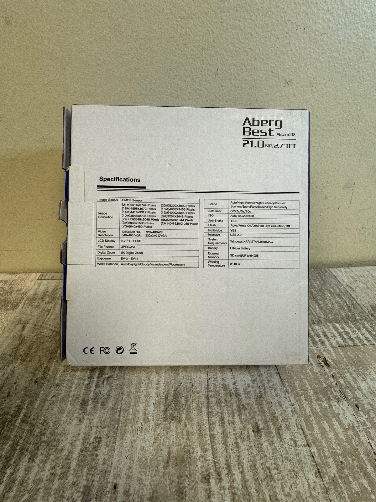 The Aberg Best ABcam 218 Digital Camera is a compact unit with a maximum resolution of 21.0 MP, featuring an 8x optical zoom and digital zoom capabilities. With a sleek black exterior, this camera is easy to use and ideal for capturing high-quality photos. It includes features such as a built-in flash and date/time stamp, making it a versatile choice for photography enthusiasts. The package also includes a charger, manual, and CD, providing everything you need to get started with this user-friendly digital camera.