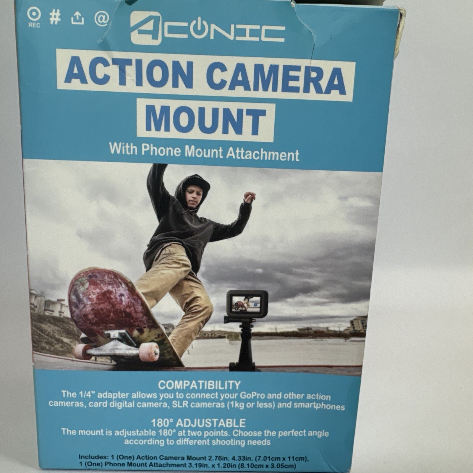Aconic Action Camera Mount with Phone Attachment - 180° Adjustable • Condition: New, box slightly worn (see photos). • Compatibility: Works with GoPro, action cameras, SLR cameras (up to 1kg), and smartphones. • Features: • 180° adjustable mount for versatile angles. • Includes a phone mount attachment for additional functionality. • Compact and durable design, ideal for capturing action shots or steady videos. Perfect for outdoor adventures, vlogging, or professional setups. Shipping from a free smoke home & shipping the same day or next day. Please check out my other listings