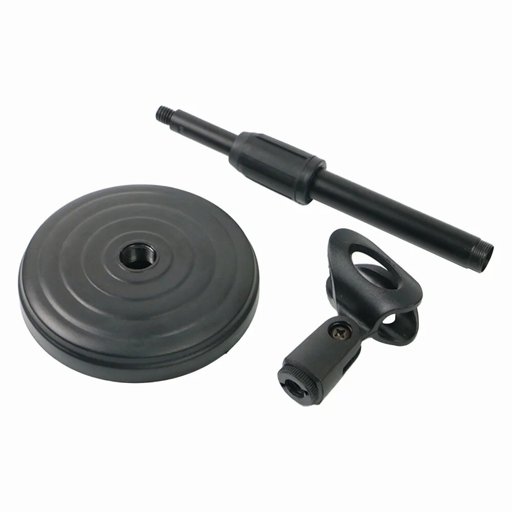 Microphone Desktop Stand with Adjustable Lifting and Weighting Disc Base, Shockproof Network Live Broadcast Microphone Stand DESCRIPTION: Features: 1. [Two stage lifting] The retractable height of the telescopic rod is 24-35cm 2. [Stable disc base] The base weighs 240g and adds weight to the stable center of gravity of the base 3. [Live streaming is more free] Live streaming, karaoke, and microphone angle can be adjusted as desired 4. [Strong adaptability] Suitable for various microphones on the market Specifications: Product material: ABS Height range: 24-35cm Base diameter: 11.5cm Packaging list: 1 * base+1 * telescopic rod+1 * microphone clip