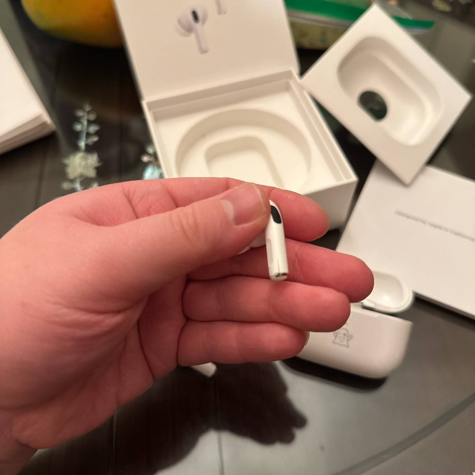 The product is the Apple AirPods Pro (2nd generation) in white, featuring noise cancellation. They are earbuds with Lightning connectivity. Has a crack on both pieces but still works just fine comes with charge cable as well
