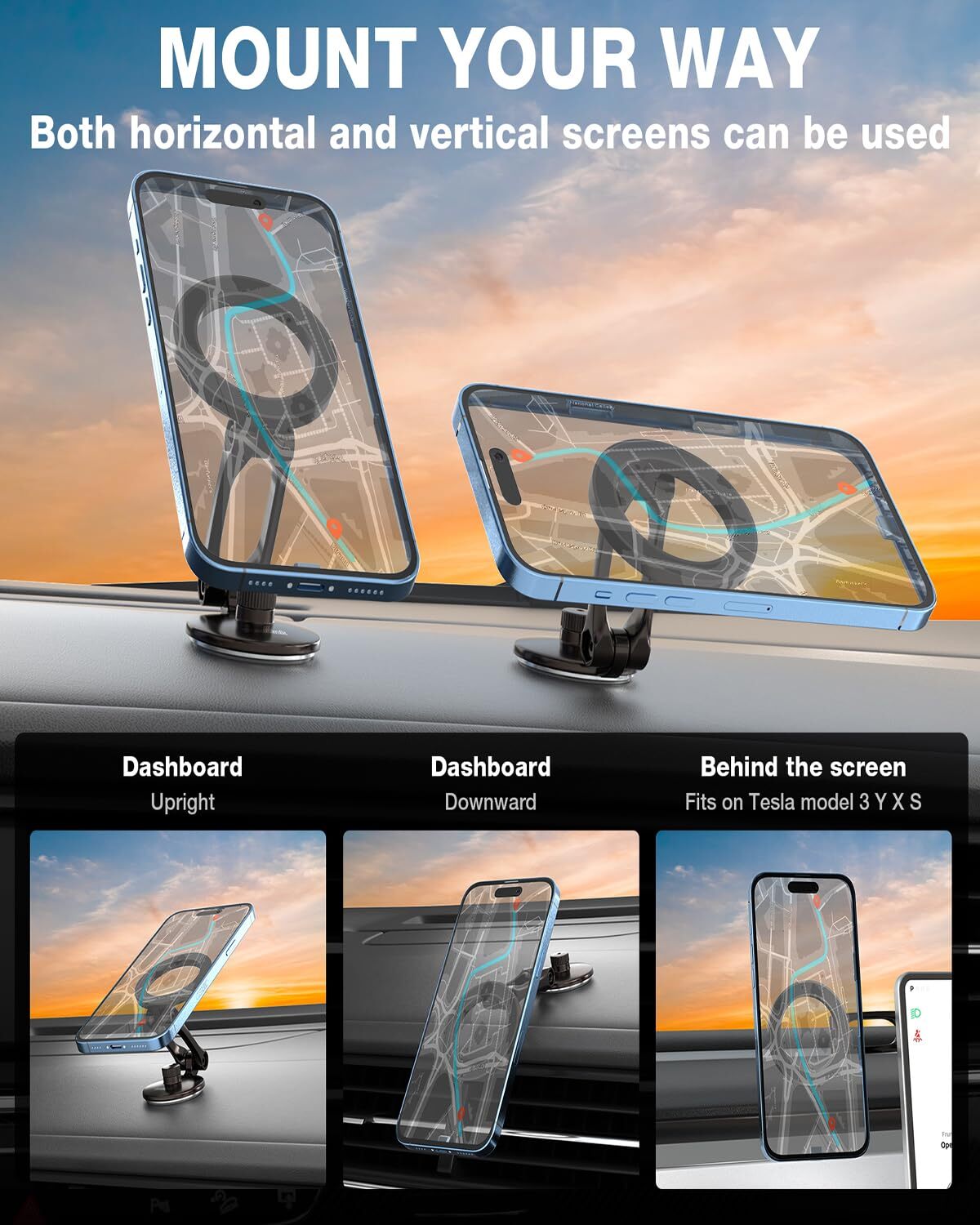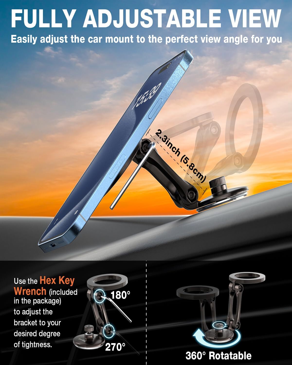 🔥【360°Free Rotation & Multi-angle Adjustment】 With 360-degree rotation and 270° angle adjustable function, the magnetic car mount offers infinite adjustment options for the perfect viewing angle, making the switch between landscape and portrait mode effortless. It allows you to rotate, tilt, and position your device however you like, creating a vivid, bright and refreshing driving atmosphere for you. 🔥【Versatile Mounting Options】Whether you prefer the magnetic phone mount for car behind the screen for a cleaner look or on the dashboard for easier access, this mount's flexible design caters to your unique preferences. Magnetic phone holder can be effortlessly folded away when it’s not in use on your touchscreen, becoming virtually invisible. This feature allows you to maintain the sleek aesthetics of your car's interior without compromising on functionality. 🔥【Powerful Magnetic for Magsafe】Magnetic suction car phone holder Built-in strong magnets, with powerful magnetic attraction that firmly suck your phone and keep it stable and safe even on bumpy roads or sharp turns. You don't have to worry about dropping it. The magnet won't interfere with your mobile phone signal, so you can use your navigation or other functions as normal. 🔥【Nanoscale 3M Adhesive】 Magnetic car mount is made of high quality 3M adhesive and vacuum locking mechanism, we thicken it for stronger adhesion so it sticks to smooth surfaces with little to no distortion or peeling. iphone magnetic car mount can firmly hold up to 66 lbs, can withstand temperatures ranging from -40°F to 212°F and will not come off.(NOTE: It is not suitable for suede, flocked surface, leather, textured dash, and other uneven surfaces, please choose a suitable location to apply it.) 🔥【Elegant and Stylish Design】magnetic car phone holder is made of all-metal material, beautiful, anti-scratch, super durable. Made from high-quality zinc alloy material, the ultra magnetic car phone holder offers a luxurious feel and complements the interior of your vehicle. This car phone holder will not overheat at high temperatures, which makes it safer than plastic ones. 📱【Always Fits Any Phone and Case】This car phone mount can be used on your vehicle's window, dash, or any flat surface in the home or office and can place directly to iPhone 15/14/13/12 Pro Max Plus Mini & Magsafe cases. If you own a non-Magsafe phone, Our magnetic phone holder for car attached an additional metal rings to go with it. NOTICE: The included metal ring (won’t interfere with wireless charging) is necessary if it works with other phone models or non-MagSafe cases. ☺️【Complete Customer Support】cell phone car mount for car comes with 12 months warranty. Our expert team is always here to assist you. If you have any issues in using this car phone holder mount just message us via Amazon.We will provide a satisfactory solution for you.