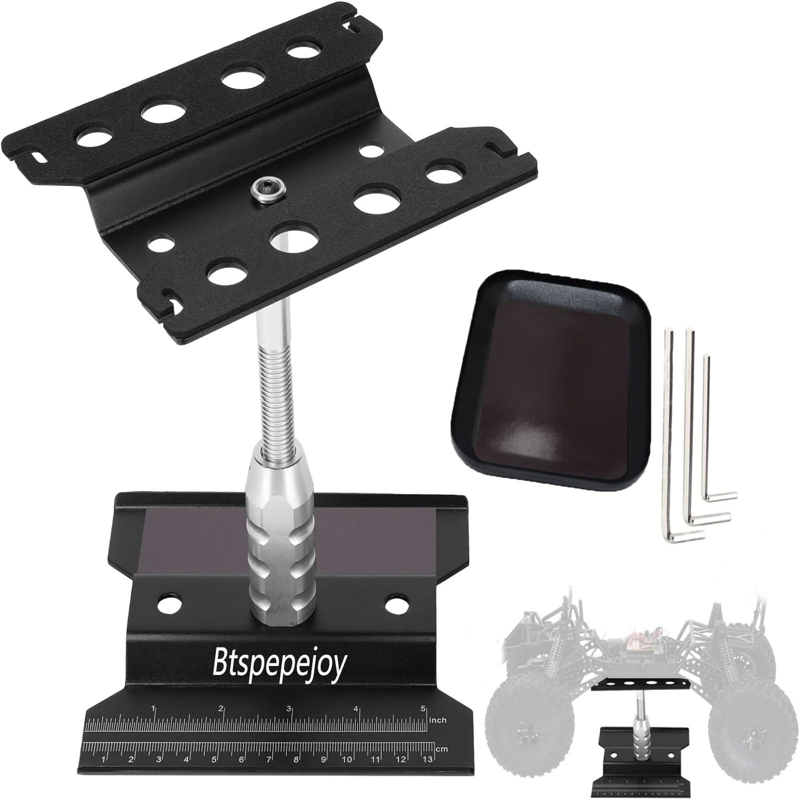 Specifications: Commodity name:RC Car Work Stand Repair Workstation Applicable model:for 1/8 1/10 1/12 Scale RC Cars,Trucks,Buggies,Such as for Traxxas Redcat Racing RC4WD Axial Tamiya Exceed WLtoys,. Rotatable Angle:360 degree rotation Adjustable size:52mm Material: high quality aluminum alloy Length: approx. 140mm Width: approx. 120mm Height:approx. 75-122mm Weight: approx. 306g Package Included : 1*RC Car Work Stand 1*Screws Tray 1*Small RC cross hexagon socket 3*Mini Wrench COMPATIBILITY: RC Car Work Stand is compatible for 1/8 1/10 1/12 1/16 Scale RC Hobby Cars, Trucks,Buggies,Such as for Traxxas Redcat Racing RC4WD Axial Tamiya Exceed WLtoys RC Crawler Monster Truck Buggy. ROTATABLE AND ADJUSTABLE:RC aluminum repair workstation can be rotated 360 degrees with adjustable height,and the rc car work stand repair workstation with shock-proof hole, chassis scale, convenient for you to better measure the use. QUICK ASSEMBLY CARRY:This rc car work stand repair workstation tool kits can be assembled quickly, very stable and easy to set up, light weight, easy to carry, is a good choice for home or travel at any time to repair your car, to provide you with better service and help. HIGH QUALITY MATERIAL:This rc car workstation adopts aluminum alloy plate, anodized treatment, durable, with non-slip foam can be firmly embedded in the upper board, more stable, more comfortable, more convenient operation. INCLUDE CONTENT:What will you get? It includes 1*RC Car Work Stand, 1*Screws Tray, 1* Small RC cross hexagon socket and 3*Mini Wrench.if you have any problem,please contact us and we will get back to you as soon as possible.