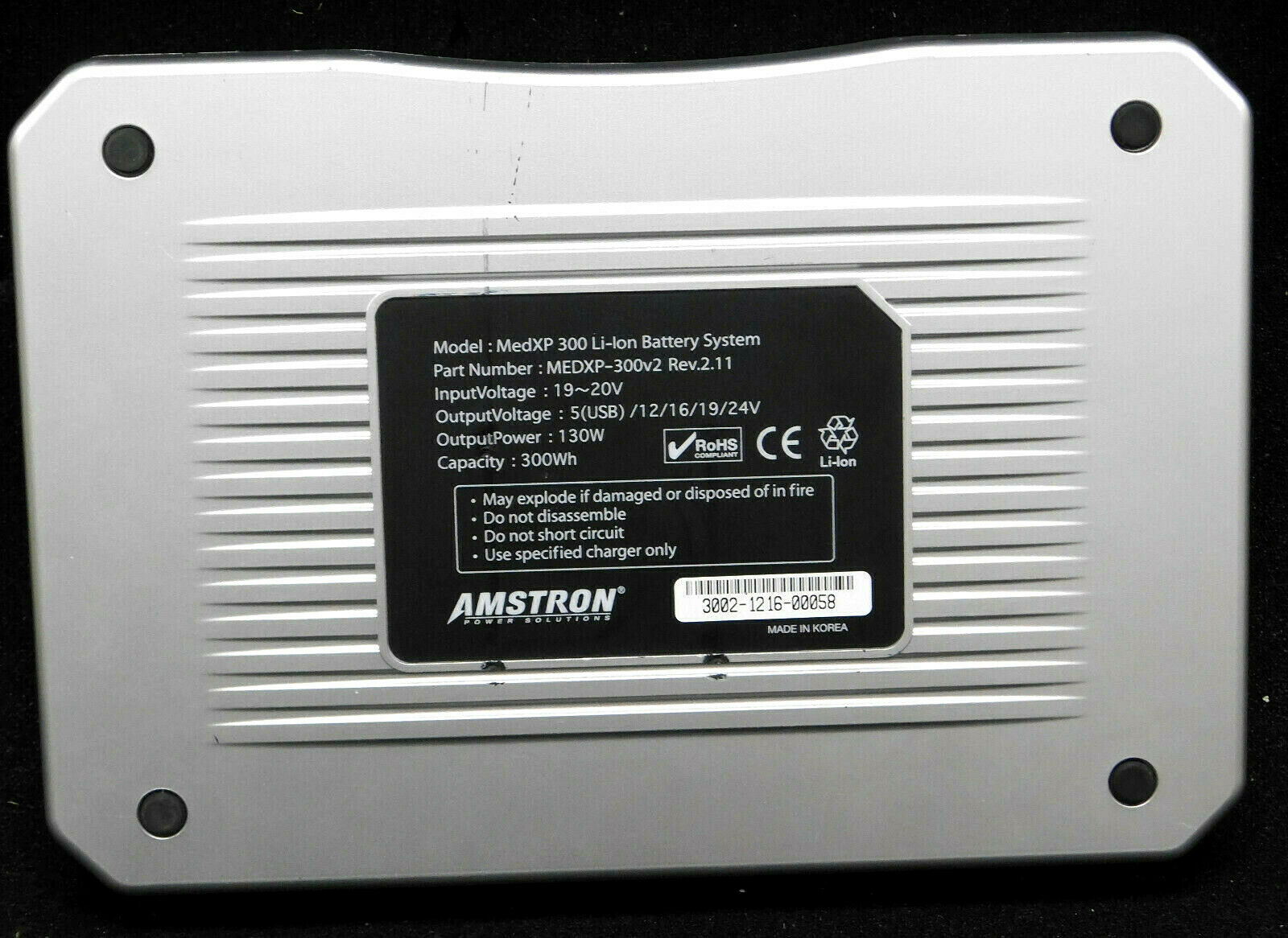 For sale is an Amstron MEDXP-300v2 , not a version 3 . The following is for V3 of the same item. I would 'think' that the description should be similar but do your own research , No returns! Unit does work and has been given a short test but I would think that you might have to replace the batteries but I really don't know. No accessories are included, only what is shown ! Version 3 of this same model number lists for $849.00 No International shipping! Item must be sent ground service because of the Li-Ion batteries. Product Description The Amstron MEDXP-300 Version 3 battery is designed for devices that need maximum power between charges, and can be used for laptops, medical devices, and other electronics. Depending on the application the MEDXP-300 Version 3 provides 10 - 15 hours of run time. It offers you the ability to go wireless for long periods of time without having to be tethered a wall or power source. Great alternative for hospitals, construction sites, or emergency responders. The MEDXP-300 uses advanced Lithium-ion battery technology allowing you unequalled productivity and mobility. PACKAGE INCLUDES MEDXP-300 Battery 120W AC adapter Output Cable 11 Output tips User Manual SPECIFICATIONS Output Voltages: 5V - 2.0A (USB), 12V, 16V, 19V, 24V Output Power: Max 130Watt Fuel Gauge: 3 digit display Charge Time: 6-7 hours Run Time: 10-15 hours External Fuel Gauge Compatible - MEDXP-FG (Sold Separately) Replaces MEDXP-300v2