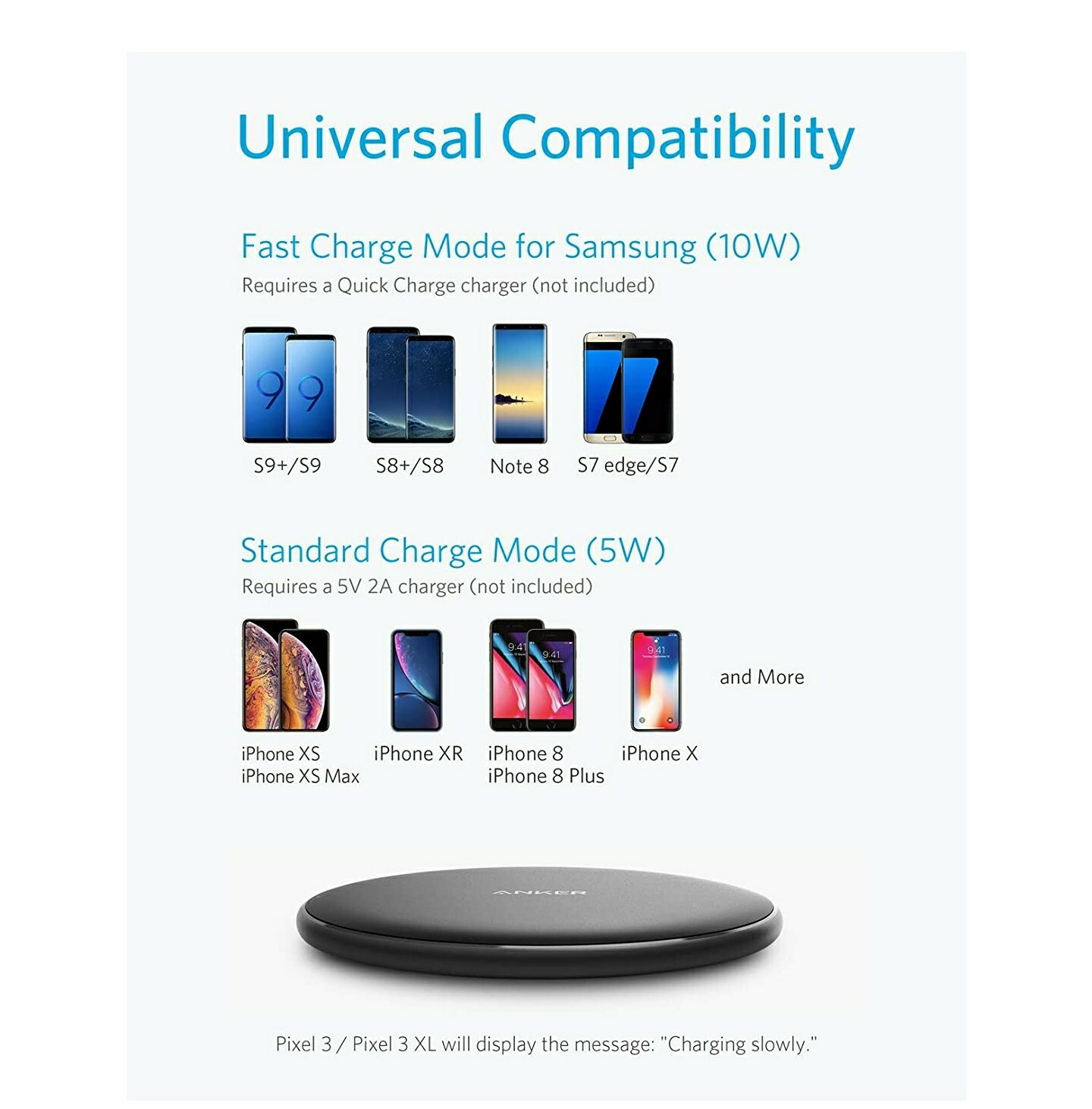 Wireless Charger Powerwave Pad Anker. Condition is New. PowerWave Pad, Optimized Wireless Charging Pad. Slim and Trim An aesthetically-pleasing slimline design adds an air of high-tech sophistication to your desk, while the TPU charging surface prevents your devices from easily sliding off. Don't worry about taking your case off whenever you have to charge. PowerWave delivers charging power directly through cases up to 5 mm thick—including Otterboxes. Input: 5V-2A / 9V-2A Output: 5W / 10W Compatibility: 10W Fast Charge Mode: (Using Quick Charge 2.0/3.0 Adapter) Samsung Galaxy S20 / S10 / S9+ / S9 / S8 / S8+ / S7 edge / S7 / S6 edge+ Samsung Note 10 / Note 9 / Note 8 / Note 7 5W Standard Charge Mode: (Using 5V/2A Adapter) iPhone 11 / 11 Pro / 11 Pro Max / XS Max / iPhone XR / iPhone XS / iPhone X / iPhone 8 / 8 Plus All Qi-enabled phones and devices Pixel 3 / Pixel 3XL (The phone's screen will display the message: Charging slowly) Note: Do not use an iPhone 5V/1A stock charger or a computer's USB port to power your PowerWave. Place your phone on the center of the PowerWave Pad to ensure stable charging. Cases made of metal and attachments such as magnets, cards, and grips will interfere with charging. Quick Charge 2.0/3.0 wall adapter (9V/2A) required for Fast Charge Mode. Shipped with USPS priority mail.