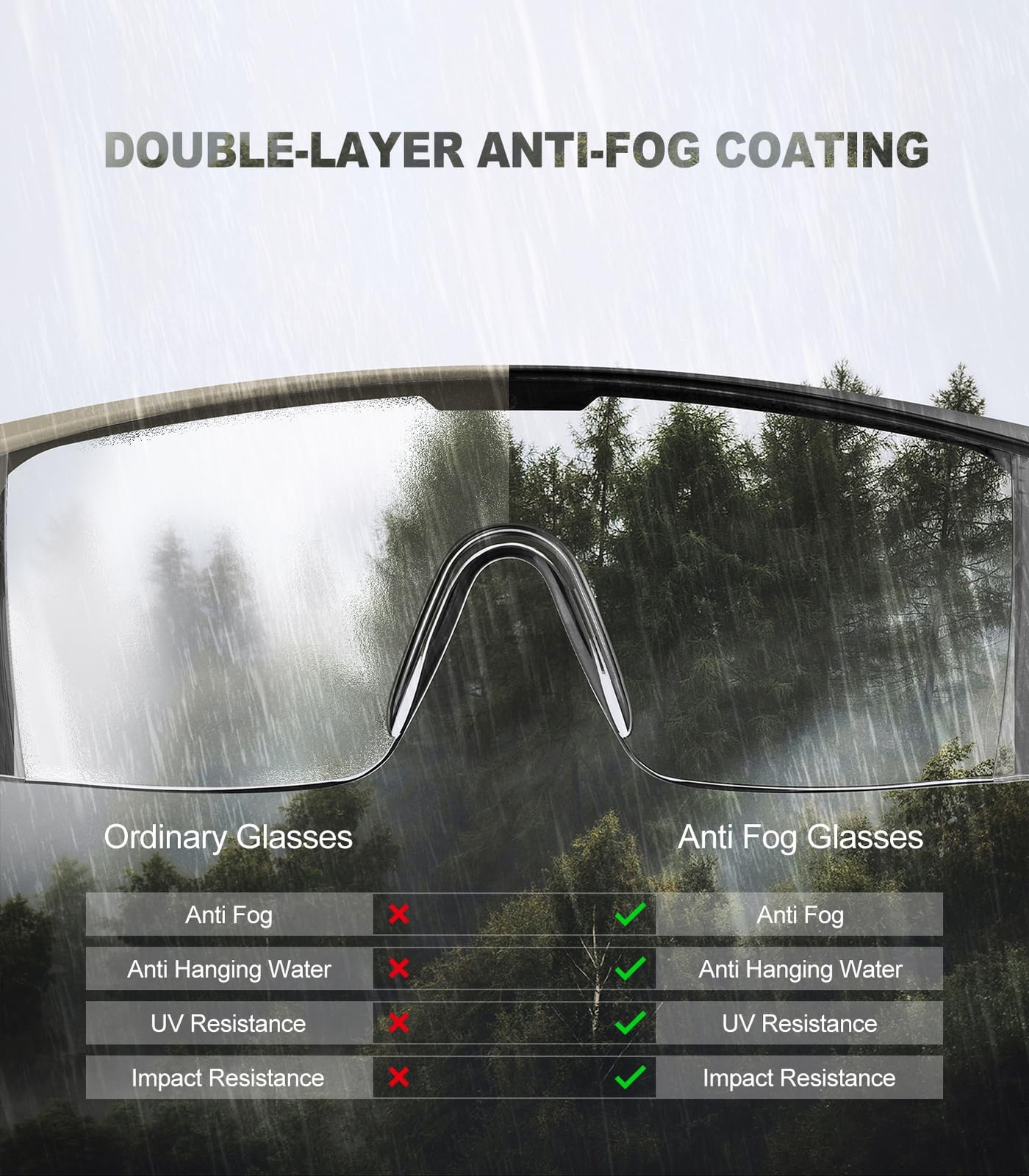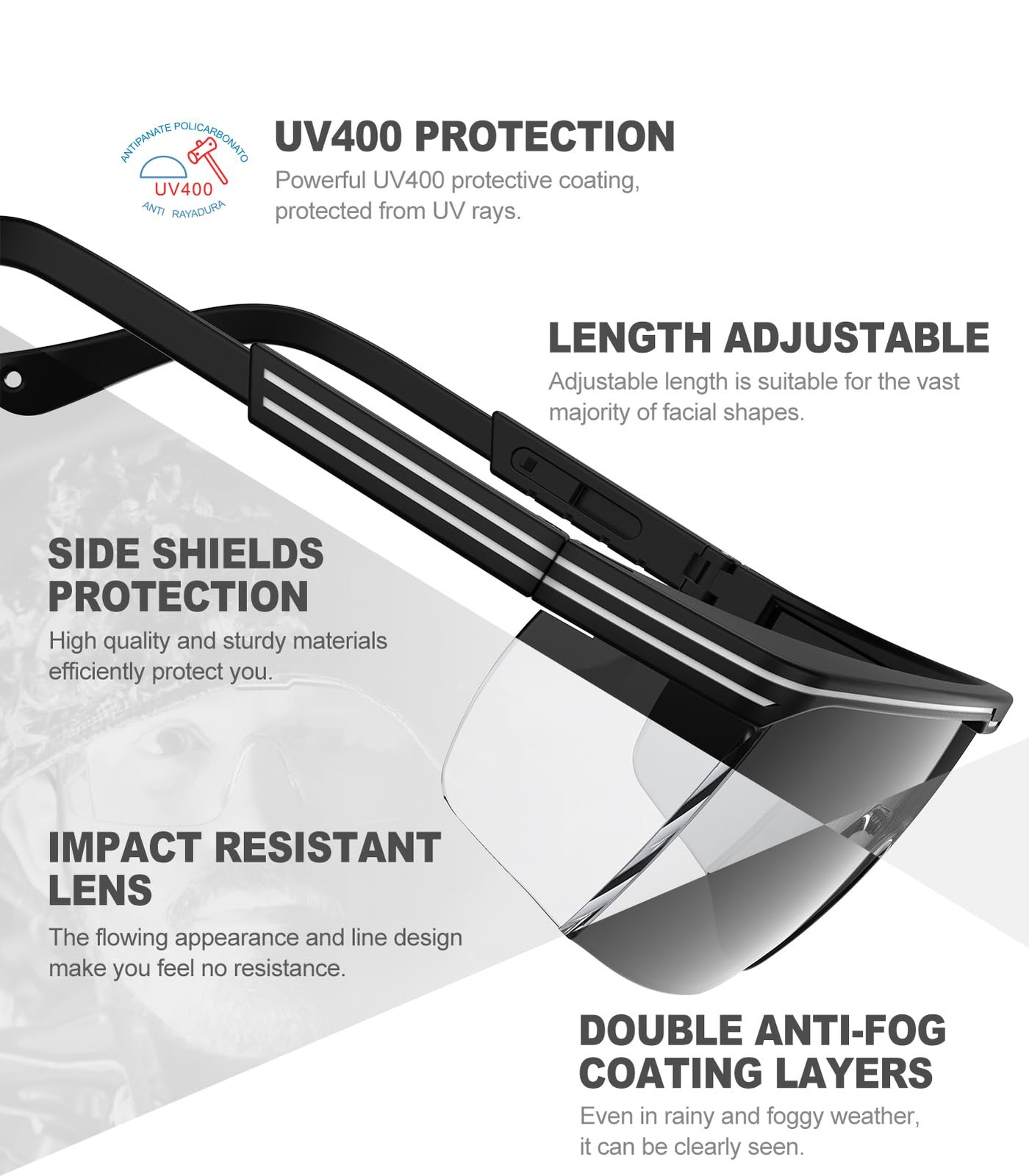 Main Featrues 1,Impact resistant polycarbonate lens. 2,Side shields design provides better eye protection. 3,Double layers anti-fog coating. 4,99.99% UVA/UVB protection with distortion free clarity. 6,4-postion adjustable temple lengths provide maximum comfort and customization. Double Layer Anti-fog Coating Lens: Clear view is always important when wearing eye protective glasses. anti-fog eyewears with strong hardness and high-definition transparency,provides wide-angle and ultra-clear field of vision, making them ideal for work and different sports Strong and Lightweight Frames:TR90 frame material with super toughness, impact resistance and wear resistance,can effectively prevent frame breakage and friction during sports.Meanwhile,the lightweight frames also reduce pressure points on your face,support comfort and stay in place more Comfortable & Adjustable Design:Total length of the protective glasses is 4.5 in, the temples can be adjusted to 3 different length (3.5 - 4.5 in) according to the face shape and light weight keeps this eyewear comfortable to wear for hours at a time Scratch-Resistant Lens with Side Shields: The UV400 scratch-resistant polycarbonate lenses meet ANSI Z87.1 high impact standard and protect eyes from harmful UV rays.Clear side shields provide preserve peripheral vision while adding a layer of protection against splashes and debris;Side shields are permanent Wide Applications:Thanks to the excellent protection of eyewears,which efficiently reduce ultraviolet rays and block glare, protect eyes from harmful light and have anti-splash function to protect eyes from strong impact,the safety glasses are widely applied in different fields,such as laboratory work, woodworking, mowing, gardening, drilling, sanding, welding, outdoor sports, etc