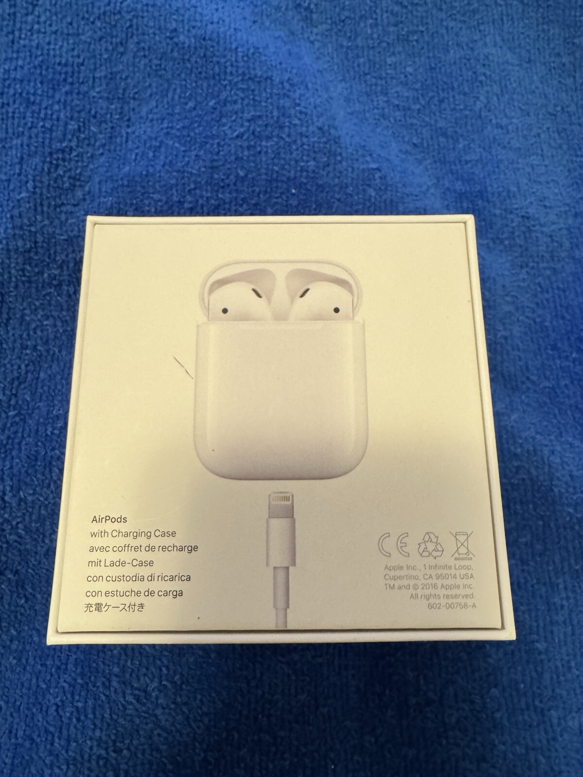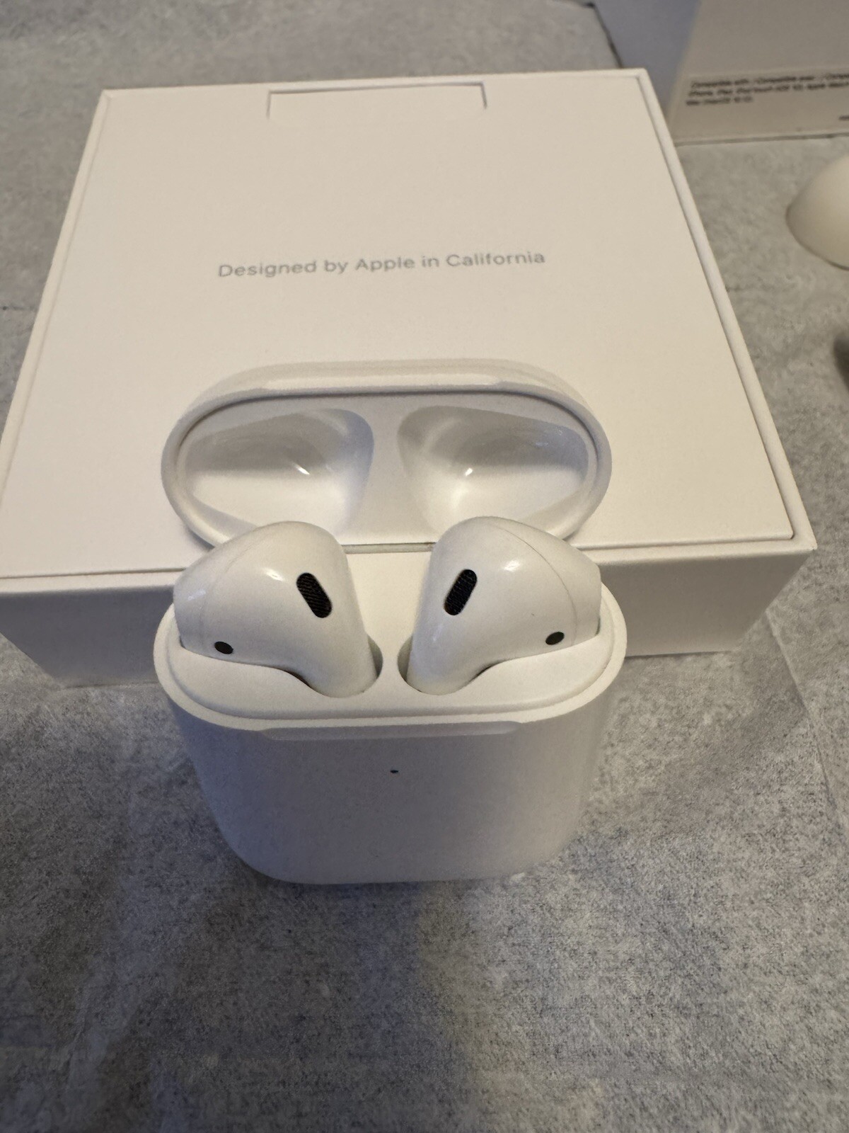 AirPods With Charging Case Model MMEF2AM/A Complete In Box Comes with original packaging and accessories. Charging cable brand new. Comes with silicone case, see pic. Email for any questions. Thank you.