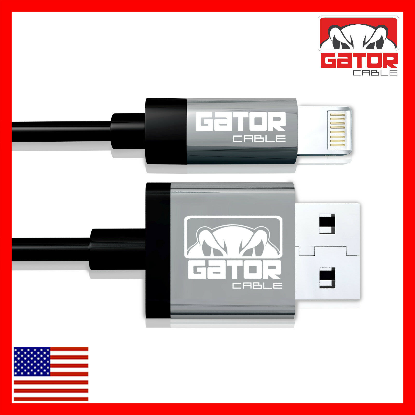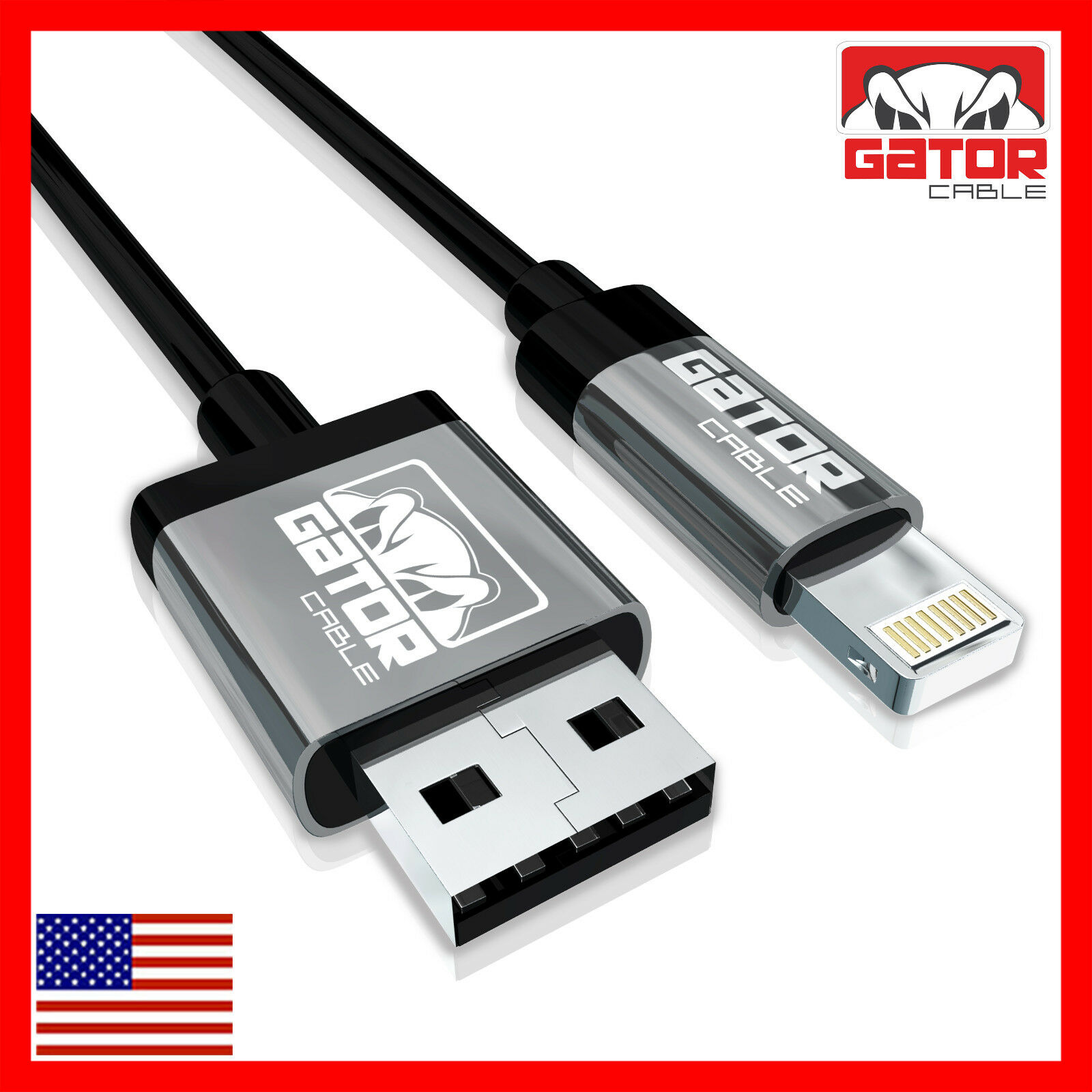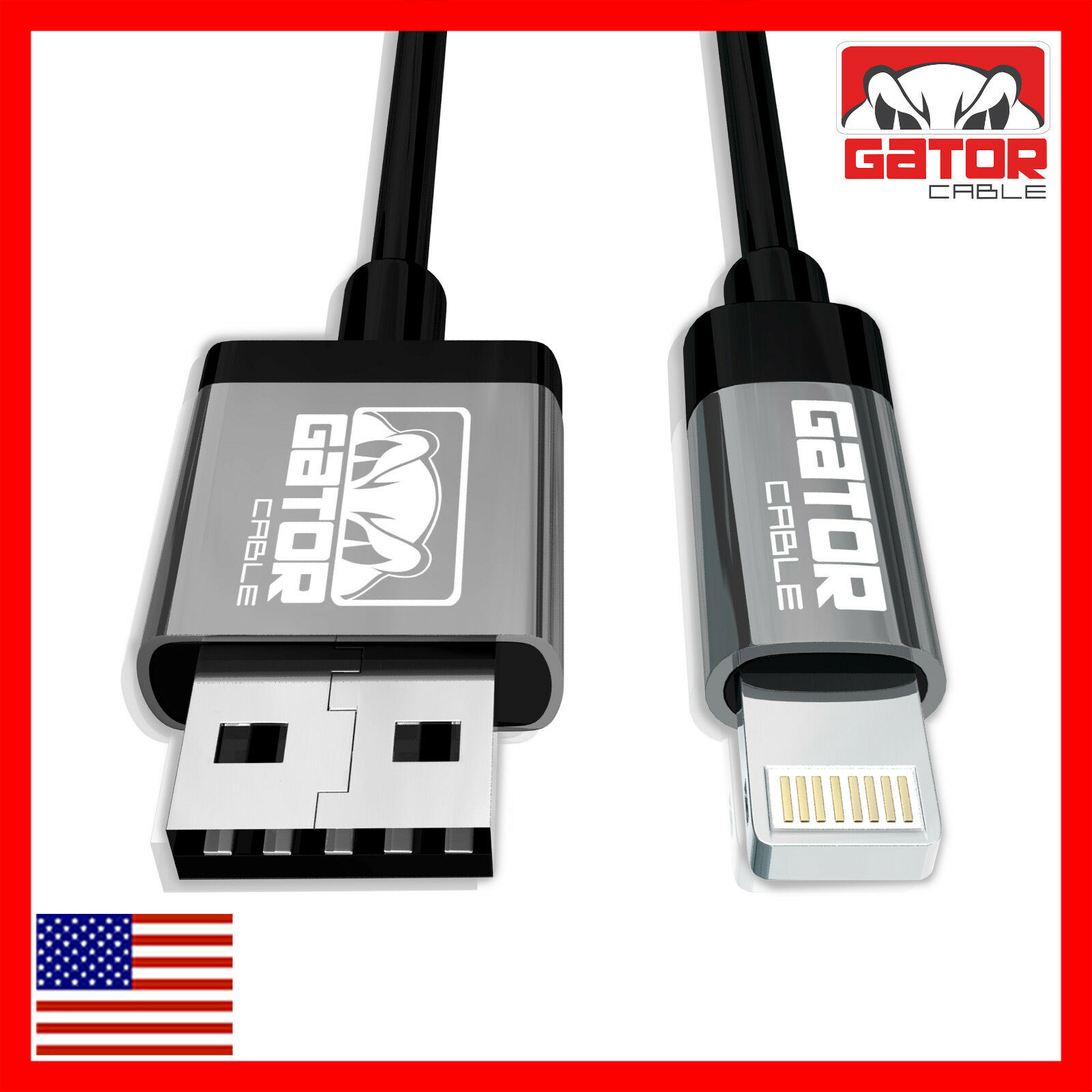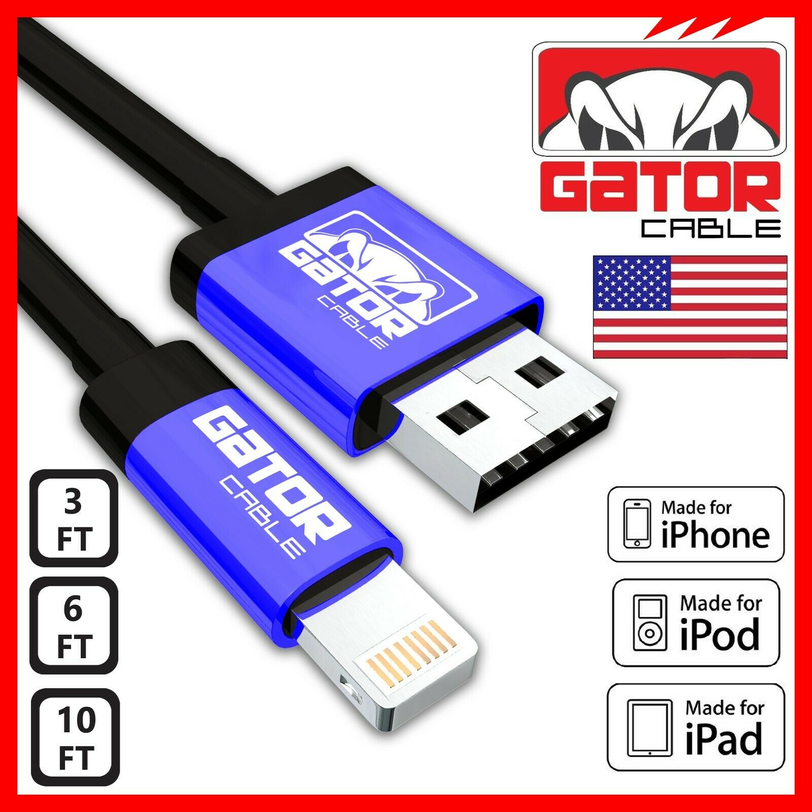 Gator Cable: Apple Certified MFI Lightning Cable Lengths: 3FT 6FT 10FT Charges and Syncs all Apple products and devices with 8-pin connector. Applications and Compatibility: iPhone 5 5S 5C iPhone 6 6S 6+ 6S Plus iPhone 7 7+ Plus iPhone 8 8+ Plus iPhone X iPhone XR iPhone XS iPhone XS Max iPhone 11 iPhone 11 Pro iPhone 11 Pro Max iPhone 12 iPhone 12 Pro iPhone 12 Pro Max iPhone 12 Mini iPhone SE (2021 new version) iPad 1 2 3 4 iPad Mini 1 2 3 4 iPad Air Air 2 iPad Pro iPod Apple Certified MFI Lightning Cable Specifications: 3FT 6FT 10FT Length (Your Choice) 8 Pin Connector Maximum Data Transfer Rate: 5.0 Gbps Black Color PVC Molding Type Optimum Aluminum Alloy Shell (Not Low Cost Plastic) Data Line 28 AWG, Power Line 24 AWG Gold/Silver Plated Connectors USB 2.0 and backwards compatible 2.4A Rapid Charging Supports all Apple Lightning Devices We Offer The Lowest Prices On eBay for OPTIMUM Quality Cables + Free Shipping On All USA Orders! BUY 4 OR MORE GATOR CABLES GET FREE U.S. PRIORITY MAIL SHIPPING ALL ORDERS ARE SHIPPED OUT WITHIN 1 TO 10 HOURS! Ultra Fast - FREE Shipping       Worldwide Shipping From USA to All USA International Shipping No Waiting 3 to 4 Weeks METALLIC CASING   Strong-Rugged-Durable Heavy Duty Cables Premium Quality Cables! Apple Certified MFI         Lightning Cable Ultimate Performance! Great Value! CLICK ON OUR eBay STORE