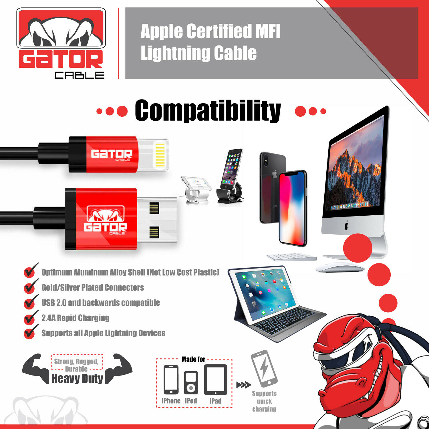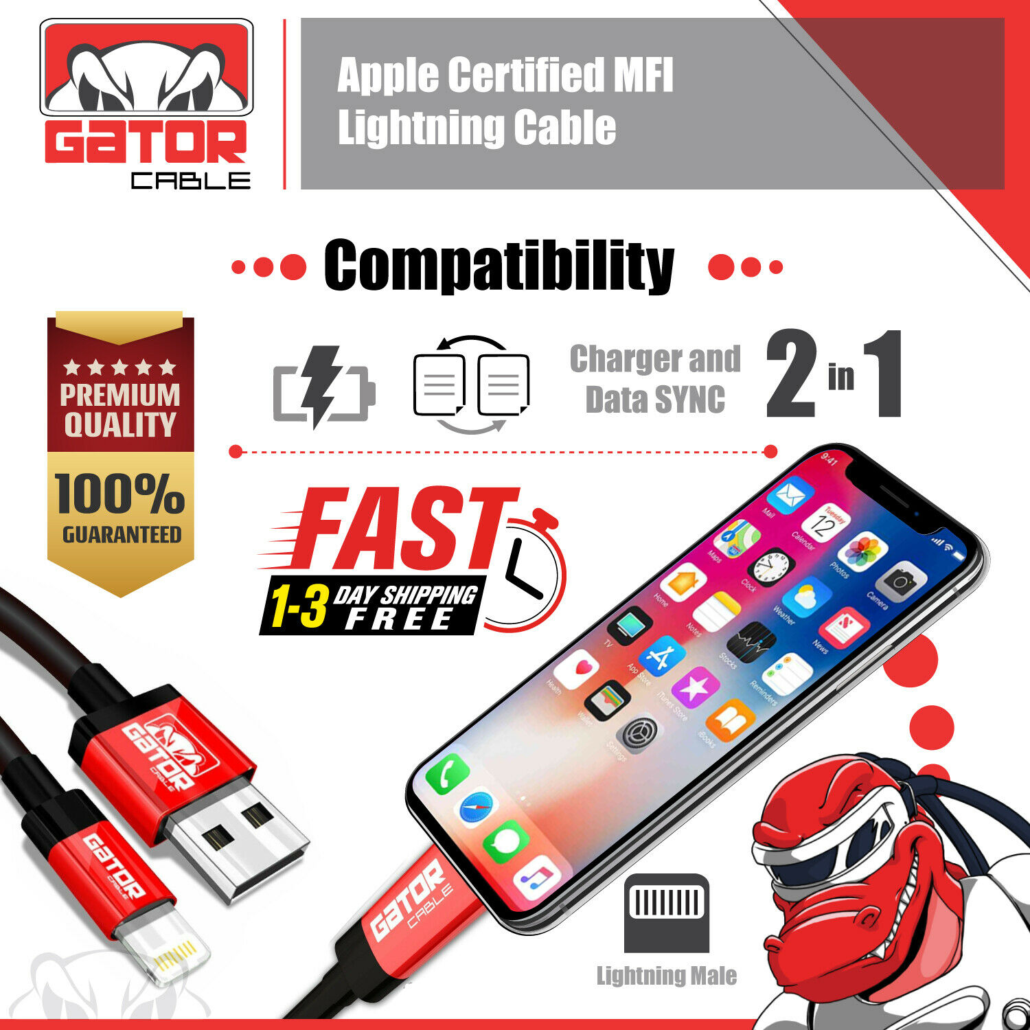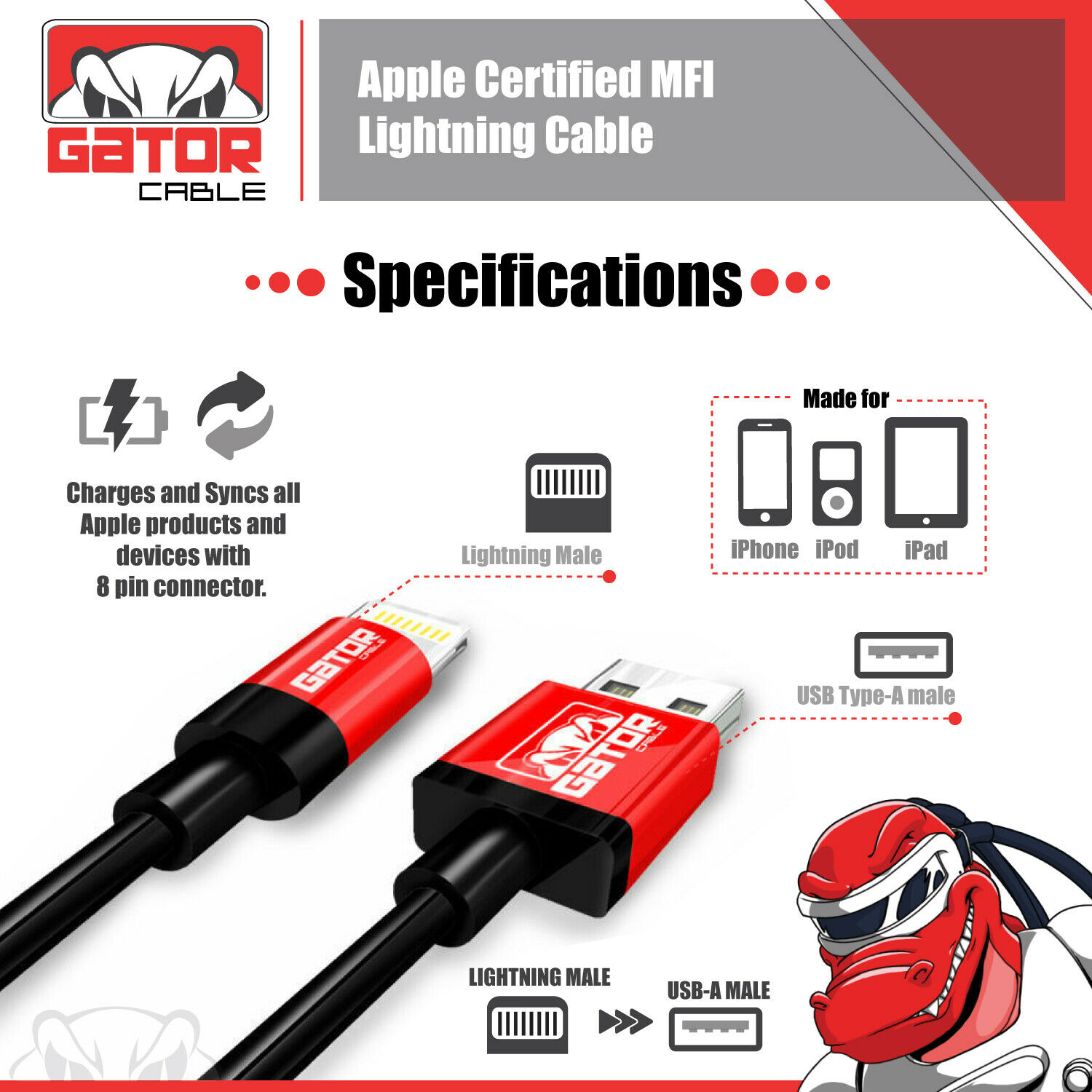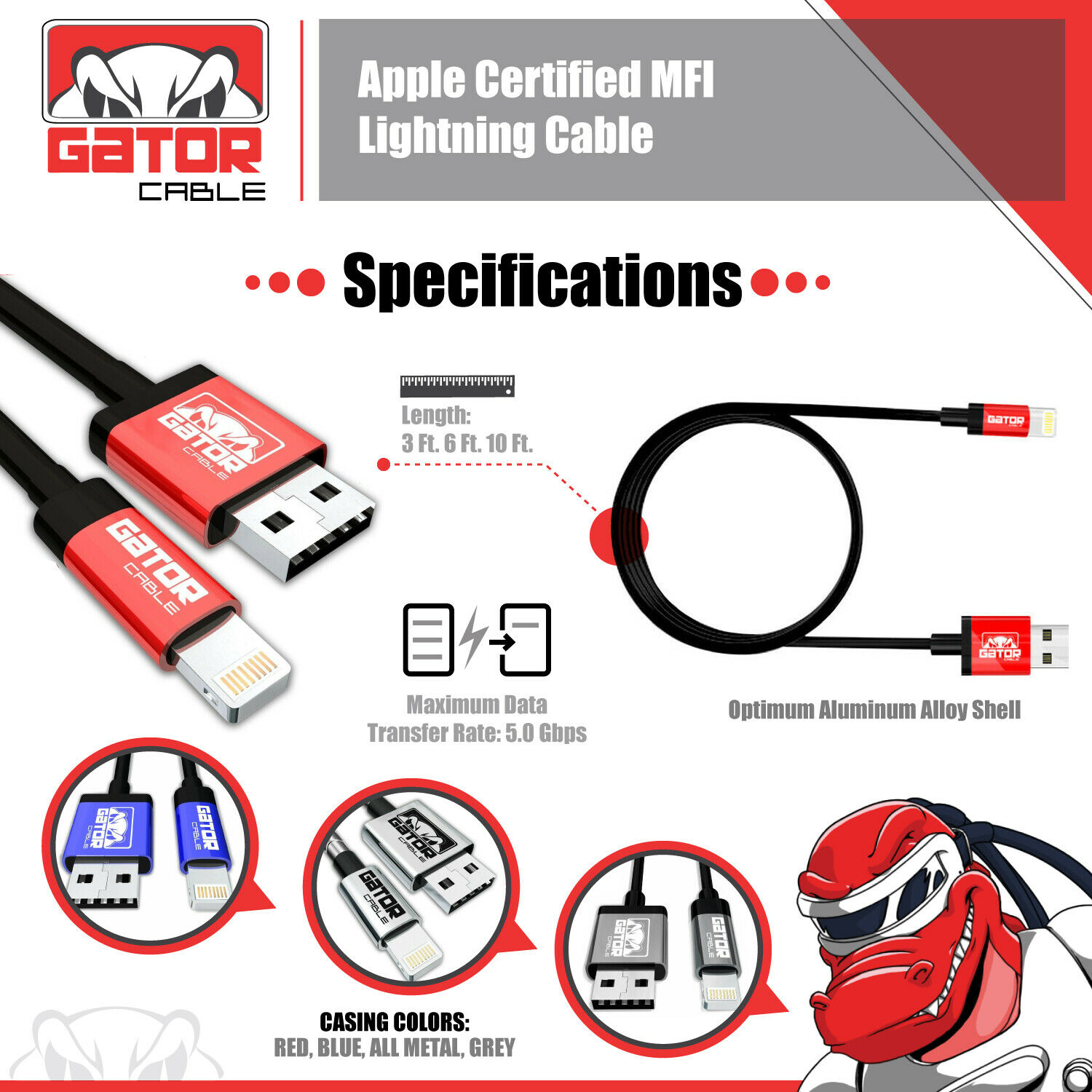Gator Cable: Apple Certified MFI Lightning Cable Lengths: 3FT 6FT 10FT Charges and Syncs all Apple products and devices with 8-pin connector. Applications and Compatibility: iPhone 5 5S 5C iPhone 6 6S 6+ 6S Plus iPhone 7 7+ Plus iPhone 8 8+ Plus iPhone X iPhone XR iPhone XS iPhone XS Max iPhone 11 iPhone 11 Pro iPhone 11 Pro Max iPhone 12 iPhone 12 Pro iPhone 12 Pro Max iPhone 12 Mini iPhone SE (2021 new version) iPad 1 2 3 4 iPad Mini 1 2 3 4 iPad Air Air 2 iPad Pro iPod Apple Certified MFI Lightning Cable Specifications: 3FT 6FT 10FT Length (Your Choice) 8 Pin Connector Maximum Data Transfer Rate: 5.0 Gbps Black Color PVC Molding Type Optimum Aluminum Alloy Shell (Not Low Cost Plastic) Data Line 28 AWG, Power Line 24 AWG Gold/Silver Plated Connectors USB 2.0 and backwards compatible 2.4A Rapid Charging Supports all Apple Lightning Devices We Offer The Lowest Prices On eBay for OPTIMUM Quality Cables + Free Shipping On All USA Orders! BUY 4 OR MORE GATOR CABLES GET FREE U.S. PRIORITY MAIL SHIPPING ALL ORDERS ARE SHIPPED OUT WITHIN 1 TO 10 HOURS! Ultra Fast - FREE Shipping       Worldwide Shipping From USA to All USA International Shipping No Waiting 3 to 4 Weeks METALLIC CASING   Strong-Rugged-Durable Heavy Duty Cables Premium Quality Cables! Apple Certified MFI         Lightning Cable Ultimate Performance! Great Value! CLICK ON OUR eBay STORE