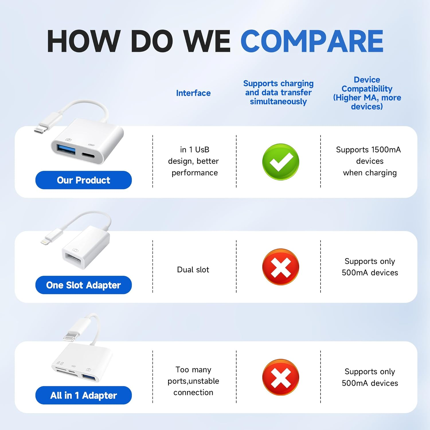 Store New Arrivals Add to Favorite View Feedback Contact OliverStore has been in the US market for over 5 years and offers free delivery to the customer's home with professional customer service [Apple Mfi Certified] Lightning to USB Camera Adapter with Charging Port, Portable USB 3.0 Female OTG Cable Adapter for Select Iphone,Ipad Models, Support Card Reader, USB Flash Drive, MIDI Keyboard Description 【Widely Compatible】 Our usb adapter supports standard photo formats,including JPER and RAW,and SD or HD video formats,including H.264 and MPEG-4.It is compatible with a wide range of Apple devices, including iPhone 14/14 Plus/14 Pro/14 Pro Max/13/13 mini/13 Pro/13 Pro Max/12/12 mini/12 Pro/12 Pro Max/11/11 Pro/X/XS/XS Max/XR and iPad Air/Mini/Pro. It supports All iOS system , ensuring broad compatibility across Apple devices 【Plug and Play】The Lightning to usb camera adapter does not require an application, and there is no need to remove the camera's memory card.Using the iphone to usb adapter,Effortlessly transfer high-resolution photos and videos directly from your digital camera to your iPhone and iPad. this is an excellent choice for copying photos or videos from the camera in a short time 【With Charging Port】 Our usb adapter adds a charging port, charging,view photos or videos can be operated at the same time.Say goodbye to worries about potential power failures 【Widely Used】Our USB female to Lightning cable adapter serves a multitude of purposes. It can be widely used with various USB 3.0 devices, including digital cameras, card readers, USB flash drives, MIDI keyboards, mice, U disks, hubs, electronic pianos, drums, audio interfaces, mixers, USB microphones, and more. Discover endless possibilities with this versatile adapter 【Quality Service】You can get 1 Pack Lightning to USB Camera Adapter.We are committed to providing satisfactory service to all our customers,For any questions about our products, please feel free to contact us, we will provide you with a satisfactory solution within 24 hours Product Description Plug and Play With Charging Port Lightweight Design Extensive Compatibility User Guide Item model number 14e7d2c6-7ab4-4f46-a5b6-c529c774a991 Package Dimensions 6.46 x 2.2 x 0.39 inches Color white Country of Origin China Compatible Devices function(f) {var _np=(window.P._namespace("DetailPageProductOverviewTemplatesJava"));if(_np.guardFatal){_np.guardFatal(f)(_np);}else{f(_np);}}(function(P) { P.when('A').execute(function(A){ A.on('a:truncate:po-attribute-truncate-0:updated', function(data) { var isTruncated = !data.truncateInstance.getIfTextFits(); var seeMoreElement = document.getElementById('po-attribute-see-more-id-0'); if(seeMoreElement) { seeMoreElement.style.display = isTruncated ? '' : 'none'; } }) }); })); IPhone 14/14 Plus/14 Pro/14 Pro Max/13/13 mini/13 Pro/13 Pro Max/12/12 mini/12 Pro/12 Pro Max/11/11 Pro/X/XS/XS Max/XR/8/8 Plus/7/7 Plus / 6s/6s Plus/6/6 Plus/SE and iPad Pro 12.9-inch/Pro10.5-inch/Pro 9.7-inch, iPad Mini 4/Mini 3/Mini 2, iPad Air/Air2. Support iOS 10 and up., Tablet, Smartphone See more Connector Type Lightning Item Weight 0.317 ounces Specific Uses For Product Microphone, Camera ABOUT US We offer the best prices around on high quality products. Our E-store includes media such as books, movies, music and games while offering electronics, toys, sporting apparel, clothing, tools, general home, garden items and more. SHIPPING We are always working hard to ensure your package arrives as soon as possible. Please understand that some factors like weather, high postal traffic, and the performance of shipping companies are outside of our control. We offer free shipping to the lower 48 states and ship within 2 business days of payment, usually sooner. We do not accept P.O. Boxes. Please provide a physical address. For shipping outside of the continental USA, we only use eBay's Global Shipping Program. The item is shipped to KY and then sent to the rest of the world. International customers are responsible for all duties and taxes. Continue to 'check out' to calculate costs for shipping the item to your country. Messages regarding eBay's Global Shipping Program MUST be directed at eBay EXCLUSIVELY. RETURNS We offer a 30-Day Return Policy on items in which you are not completely satisfied with. You have the option of a full-refund or an exchange of the item. No returns are available on items shipped outside of the USA PAYMENT We accept PayPal. CONTACT US This page content is yet to come Please ad us to your favorite seller and visit again later Thank You CUSTOMER SATISFACTION We try our very best to make sure every customer is completely satisfied. If there's a problem, message us! We're happy to help. WE ACCEPT