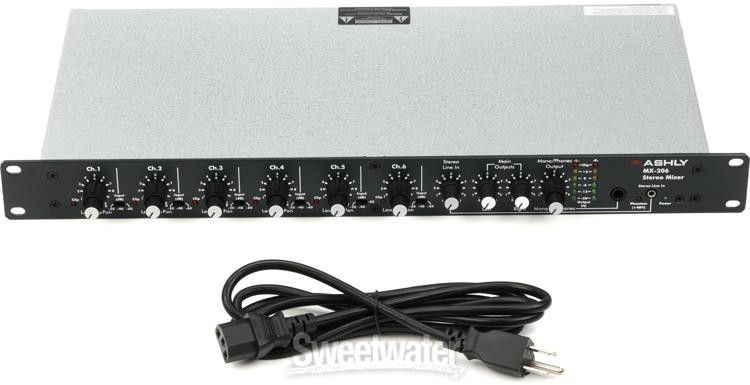 A Professional-grade 6-input Mixer Ashly’s MX-206 stereo mixer is the perfect solution when you need more mic inputs in your home, portable, or live rig. The MX-206 boasts six input channels with studio-grade preamps that supply up to 84dB of gain — perfect for adding some punch to a quiet signal. Each channel also includes a 20dB pad, 48V phantom power, a 3-position input level switch, pan controls, and LED indicators that let you know if your signal is clipping. When testing the MX-206 out at Sweetwater, engineers found that its superior sound quality and versatile functionality allow it to excel in a wealth of settings, ranging from live sound to broadcast!Ashly MX-206 6-channel Mixer Features: 6 XLR inputs and a front-mounted 1/8-inch line-in jack for devices Studio-quality 60dB preamps to boost any source Stereo line in/out 20dB pad, 3-position mic gain switch, pan controls, and LED clipping indicators on Sweetwater is an Authorized Ashly Dealer Genuine New Item Sweetwater's 2-year warranty Ashly MX-206 6-channel Stereo Microphone Mixer 6-channel Stereo Mixer with 60dB Preamps, Pan Control, 20dB pads, 6 XLR Inputs, and 1 1/8-inch Stereo Line-in Jack A Professional-grade 6-input Mixer Ashly’s MX-206 stereo mixer is the perfect solution when you need more mic inputs in your home, portable, or live rig. The MX-206 boasts six input channels with studio-grade preamps that supply up to 84dB of gain — perfect for adding some punch to a quiet signal. Each channel also includes a 20dB pad, 48V phantom power, a 3-position input level switch, pan controls, and LED indicators that let you know if your signal is clipping. When testing the MX-206 out at Sweetwater, engineers found that its superior sound quality and versatile functionality allow it to excel in a wealth of settings, ranging from live sound to broadcast! Ashly MX-206 6-channel Mixer Features: 6 XLR inputs and a front-mounted 1/8-inch line-in jack for devices Studio-quality 60dB preamps to boost any source Stereo line in/out 20dB pad, 3-position mic gain switch, pan controls, and LED clipping indicators on every channel 48V phantom power for use with condenser microphones Balanced and transformer isolated +24dBm 600 Ohm XLR-mono output Stereo headphone jack Specification Detail Type Analog Mixer Channels 6 Inputs - Mic Preamps 6 x XLR Phantom Power Yes Inputs - Line 1 x 1/8" (stereo line in), 1 x Dual RCA Stereo (aux) Outputs - Main 2 x 1/4" TRS (stereo), 1 x XLR (mono), 1 x Dual RCA Stereo (aux) Headphones 1 x 1/4" Rackmountable Yes Power Source Standard IEC AC cable Height 1.75" Width 19" Depth 9.4" Weight 6.8 lbs. RETURN INFORMATION We want you to be completely happy with your purchase from Sweetwater. If you are not satisfied with your product, you may return it for a refund of the purchase price within 30 days. If your purchase was eligible for Free Shipping, the shipping cost will be deducted from your credit or refund. Returns must be in the complete and original packaging with all accessories and complete documentation (Owner's Manual, warranty card, quick start guides, etc.), show no signs of wear or use, and include a Return Authorization number or be subject to a restocking fee.