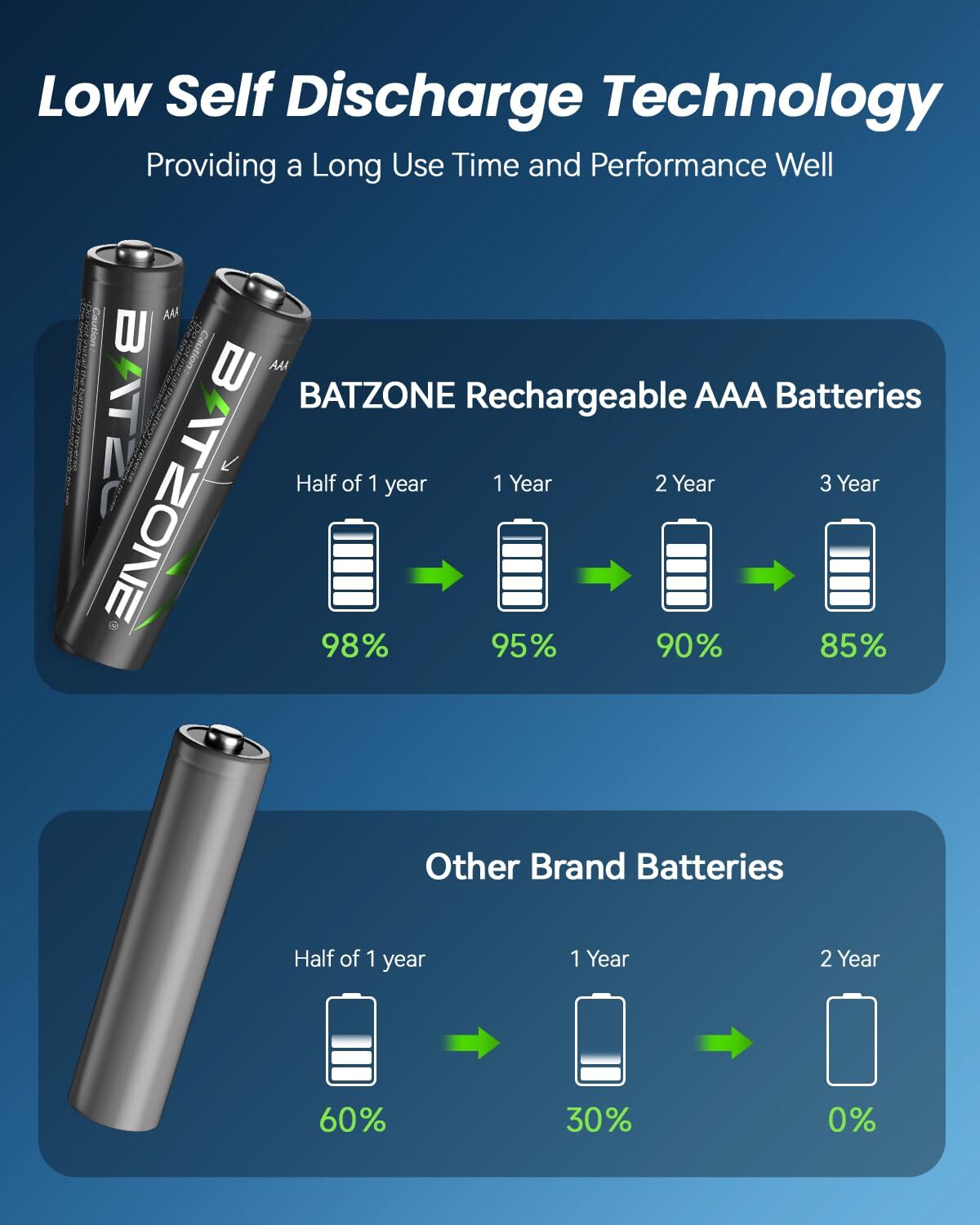 BATZONE 12 Pack Rechargeable AAA Batteries,1100mAh High Capacity Ni-MH AAA Battery with Long-Lasting Power,1.2V Triple A Batteries Low Self Discharge… 1100mAh High Capacity:BATZONE aaa rechargeable batteries have a high capacity of 1100mAh, allowing them to provide long-lasting power for your devices,ensuring you could use them for extended periods without needing to recharge 1200 Cycles & Reusable:Rechargeable batteries aaa can be recharged over 1200 times,making them an economical and Eco-friendly choice for powering electronic devices.Experience the Power of Sustainability Low Self Discharge:Our triple aaa batteries rechargeable feature low self-discharge,which means they can maintain 85% capacity for 36 months.Please charge completely before use,these batteries are only pre-charged to 20% for transportation safety Non-toxic and Pollution-free:Ni-MH Rechargeable Batteries don’t contain Hg/Cd/Pb.They are recycled and eco-friendly.Not only save you the cost of buying disposable alkaline batteries but also make contributions to environmental protection Safety Protection:aaa rechargeable battery adopts DBCK steel shell to prevent overpressure explosion, which brings strong safety protection Shipping We offer FREE shipping on all orders! We ship within Three business days of payment, usually sooner. We use a selection of shipping services such as UPS, FedEx, USPS etc. We only ship to the lower 48 states, no APO/FPO addresses or PO Boxes allowed. Local pickups and combined shipping options are not provided at this time. Return You can return a product for up to 30 days from the date you purchased it. Any product you return must be in the same condition you received it and in the original packaging. Please keep the receipt. Payment We accept payment by any of the following methods: PayPal Please pay as soon as possible after winning an auction, as that will allow us to post your item to you sooner! Feedback Customer satisfaction is very important to us. If you have any problem with your order, please contact us and we will do our best to make you satisfied. Contact Us If you have any queries, please contact us via ebay. We usually respond within 24 hours on weekdays. Please visit our eBay store to check out other items for sale! Thank you for shopping at our store.