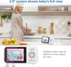 Baby Monitor, β Screen, 2 Cameras, 1000ft Range, Night Vision, 2-Way Audio, Temperature Sensor, Lullabies, Secured Transmission No WiFi πBest-in-class Battery Life and Range - With up to 19hours of video streaming, this 2-camera system lets you monitor your children throughout the night easily. With up to 1000 feet of range, you can stay connected with your children from another room or even from the yard. π Privacy Guarranteed. No Wi-Fi or App Pairing - Trusted by US families for more than 3 decades, each monitor is transmitted via secured internal channel with FHSS technology, so you can rest assured that you're the only one who can hear and see your baby. Parent Unit x x inches. Baby Camera Unit x x inches π" Display with Temperature Indication - Clearly see every little move right from the parent unit. Besides, the built-in temperature sensor on the camera will send alert to the parent unit. Let you know when itβs time to adjust the thermostat. π Two Viewing Options. Choose how you want to keep an eye on your family - single view or patrol model (single view that transitions to a different camera every 10 seconds). " πSoothing Lullabies and 2-Way Talk - Gently lull your baby to sleep with 2 calming melodies and 2 sets of ambient sound. The 2-way talk back lets your baby to hear the sound of your voice no matter where you are. πAuto-on Screen and Sound Indications- The screen can be turn off and the sound be muted to let you the silence needed and to save power. When baby is crying, the screen will auto turn on with a visual alert on the sound indicator bar on the parent unit. π Easy Set-up Plug & Play - The parent unit and the two cameras are configured for monitoring right out of the box - no pairing or connections required. The cameras can be set on desk top or wall mounted. π Temperature Sensor - The built-in temperature sensor on the baby camera will send alert to the parent unit. Lets you know when itβs time to adjust the thermostat. " Check in on your little one with a LCD screen on the Digital Video Baby Monitor. Soothe your baby using the lullabies and soft sounds that play right from the baby unit. Plus, you can make sure your infant is cozy by monitoring the nursery temperature that's displayed right on the LCD screen. Best of all, with the industry's best battery life, you can easily monitor your baby throughout the night with up to 19 hours of video streaming on one charge.