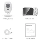 • 2.4G Wireless Connection : Experience a seamless and reliable connection with the 2.4G wireless technology, ensuring real-time monitoring of your baby's safety. • 2-Way Audio Talk : Communicate efficiently with your baby or caregiver through the 2-way audio talk feature, providing convenience and peace of mind. • Night Vision Capability : Equipped with night vision, this video baby monitor ensures clear visibility even in low light conditions, ensuring your baby's safety even in the dark. • Temperature Monitoring : The built-in temperature display keeps you informed about the temperature in your baby's room, ensuring their comfort at all times. • Rechargeable Battery : Powered by a rechargeable battery, this video baby monitor offers long-lasting performance, ensuring you always have power when you need it. • High-Resolution Video : With an SD 720P resolution, this video baby monitor provides high-quality, clear images, giving you a realistic view of your baby's surroundings. 3.5 inch Video Baby Monitor 2.4G Mother Kid 2 Way Audio Talk Night Vision Security Cameras Video Surveillance Camera With Temperature Feature * Support 2.4G /Stable connection * 3.5 High-inch high-definition LCD screen / display real-time screen * 380TVL display / 480*320 resolution * Built-in lithium battery /Charging can be used, reduce the trouble of battery replacement * Digital RF modulation with frequency hopping function /automatic switching of RF channels * Dynamic selection of clear channels / avoid interference from other 2.4GHz devices * Data privacy protection /support user ID identification * Sleeping music playback function / 8 kinds of built-in music * Accurate temperature monitoring /view real-time temperature * Two-way Audio /both receiver and camera have built-in microphone and speaker * Built-in advanced professional-grade VOX function /intelligent sound detection 300m Transmission Distance The monitor has a signal coverage of up to 160 feet/100 meters indoors and 850 feet/300 meters outdoors. You can check your baby's real-time situation at any time No Wi-Fi or App Pairing, 100ft Long Range Monitor * Privacy Protection, this video baby monitor no wifi,Each monitor transmits over a secure internal 2.4GHz channel and FHSS technology, so you can rest assured that you are the only one who can hear and see your baby. * This Video baby monitor system's dependable long operation range up to 100 feet, The range on the camera and monitor reaches between several rooms. Two-way Audio Both the monitor and the camera have built-in microphones and speakers, so you can make two-way voice calls with your baby, soothing your baby at any time when he finds out you're not around Built-in 8 lullabies The baby monitor has many built-in lullabies that you can set to play in the monitor to put your baby to sleep quickly and quietly Accurate temperature monitoring The mini monitor has a built-in temperature detector that detects the real-time temperature and displays it in the monitor, so you can check the ambient temperature of your baby AutomaticNight Vision The monitor security protection can open the automatic night vision function at night to protect your baby 24 hours VOX Mode * The screen will turn on when detecting a sudden voice or noise, like crying and shouting from the baby, and the screen will turn off automatically when the room is quiet for saving battery. Real Time Monitoring * Real time monitoring of baby's movement , trajectory to help mothers better protect their baby's growth . 360° Adjustable Angle Horizontal can be adjusted 360 °, vertical adjustment of 60 ° Long Battery Life * The Wireless baby monitor With up to 12 hours of video streaming on a single charge when you turn on VOX mode. Up to 2000 mAh battery, Our portable baby monitor is so easy to use no hassle simply plug it in. Set Feeding Clock freely * The baby monitor could set feeding alarms, never worry about when your baby get hungry. Compact and convenient Small size and light weight, you can better install and use Note: Please confirm the plug you are using before purchasing; if you are purchasing the 2pcs option, please make a note of the plug you need for your order Product List Monitor: 1.LCD size: 3.5 inch 2.Resolution Supported: 480 x 320 pixel 3.Receiving Sensitivity: -90dBm 4.Consumption Current: 200mA 5.Battery: Li-polymer / 2000mAh 6.Power Supply: 5V/1000mA DC 7.Dimensions (W X H X D): 133mm x 76mm x 20mm Camera: 1.Image Sensor: CMOS 2.Resolution Support: 1280*720P 3.Minimum Illumination: 0 Lux (IR on) 4.Night Vision Distance: 15 FT (5m) 5.View Angle: Diagonal 45° 6.Power Consumption: 200mA 7.Power Supply: 5V/1000mA DC 8.Dimensions (H X D): 66mm x 109mm